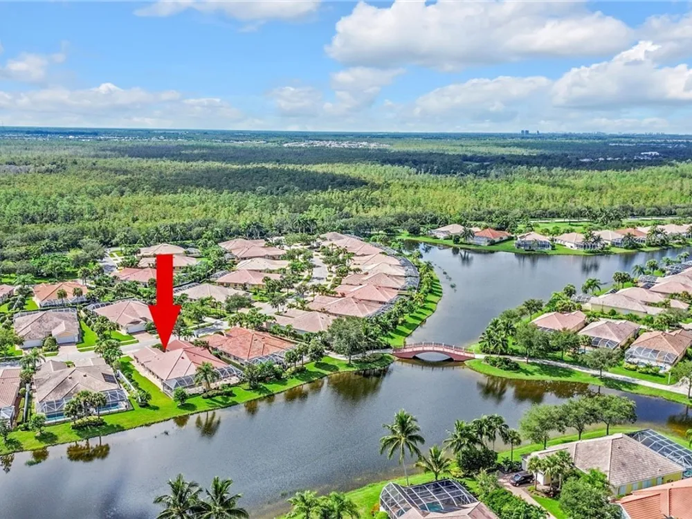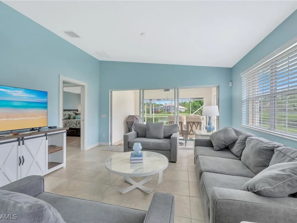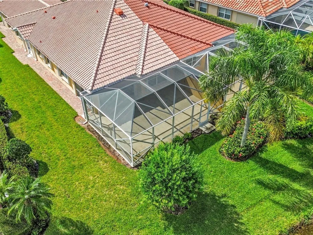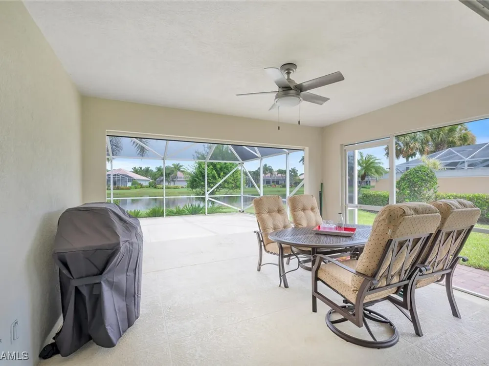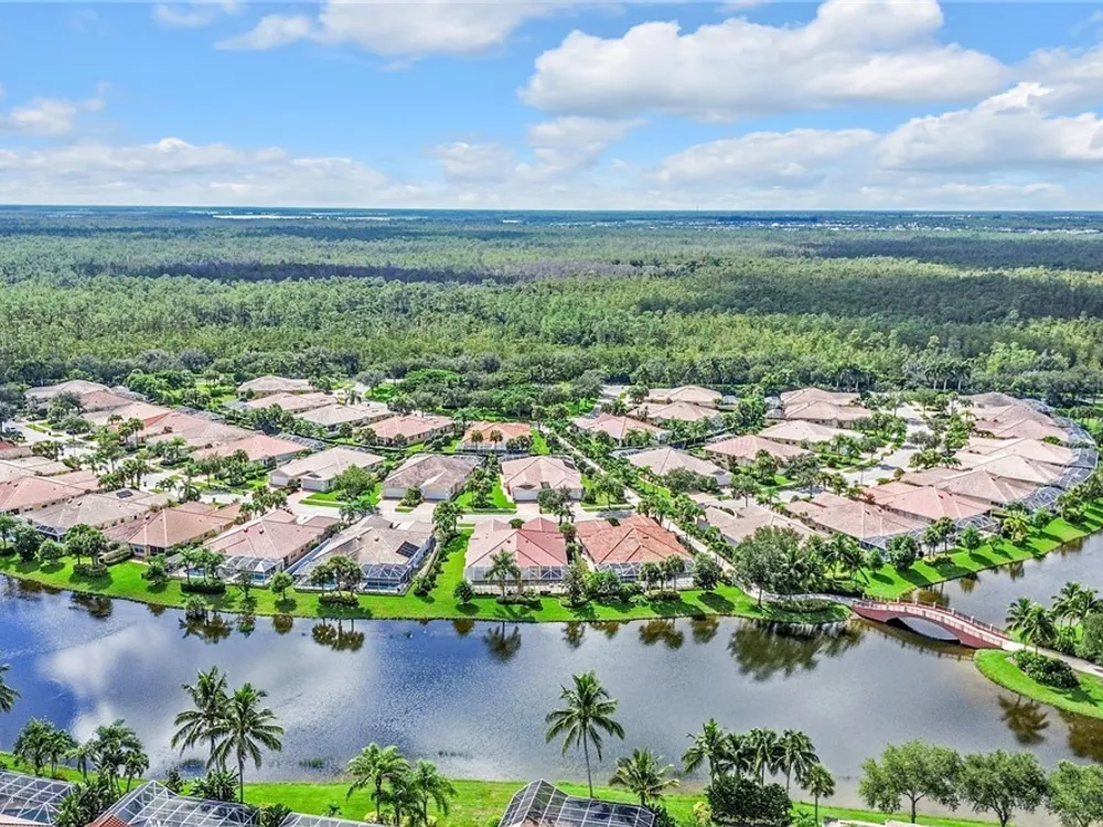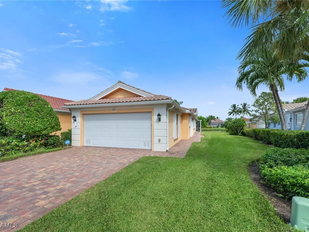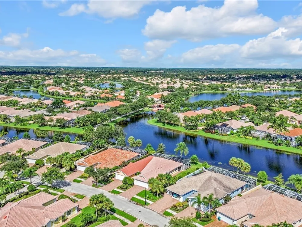 Check out our video link attached so you get a real feel inside this superb gated community Verona Walk property! This popular Capri attached villa, built of poured concrete by renowned developer DiVosta, sits on an oversized lakefront lot and offers 2 bedrooms, 2 baths, a flex/den, and a 2-car garage. The bright split-bedroom floor plan is ideal for visiting guests and family. Interior features include newly laid LVP Cortec flooring in bedrooms, freshly re-grouted natural tan tile flooring throughout the main living areas, vaulted ceilings, and a wall of windows bringing in natural light. The living room features a built-in wall unit for storage and display. The open kitchen has all appliances including a split sink and KOHLER garbage disposal, along with a newer LG stainless refrigerator. A full laundry room offers cabinetry, sink, glass block light, and pantry closet. Great storage throughout the property. Recent improvements equating to over $32,000 in upgrades within the past 12 months include two electric hurricane shutters on the lanai plus accordion storm shutters for the rest of the home, garage opener with keypad, new appliances, professional ductwork cleaning, interior painting in the house and garage, Cortec flooring in bedrooms, new ceiling fans, and more. Sliding glass doors open to a covered lanai with extended screened patio overlooking the water, complemented by an extended screen porch with a new roof screen. This home is just a 9-minute walk to the community amenities and three doors down from the bike path. Verona Walk offers resort-style amenities: resort pool, tennis, pickleball, fitness center, miles of walking trails, and a Town Center with café, restaurant, post office, salon, gas station, and ice cream/coffee shop. Low HOA fees add to the appeal. Offered unfurnished but open to negotiation.