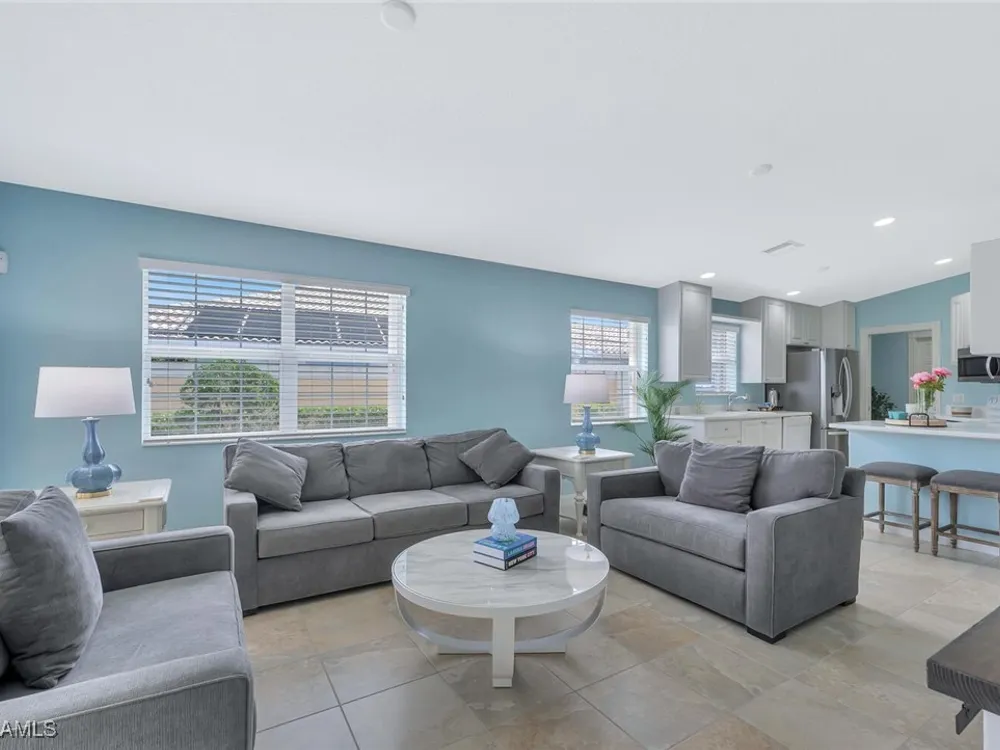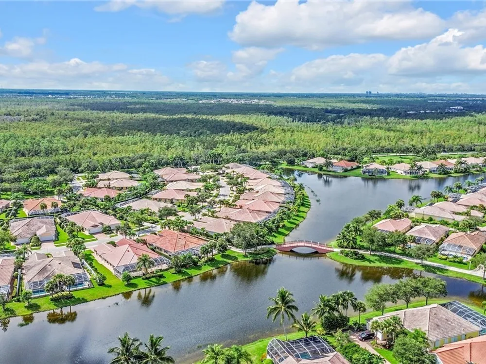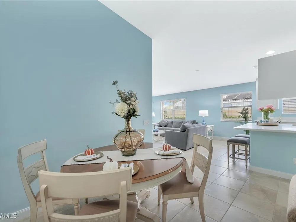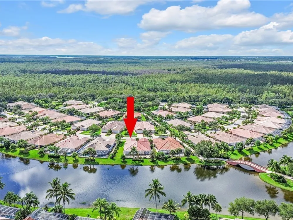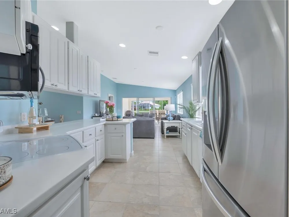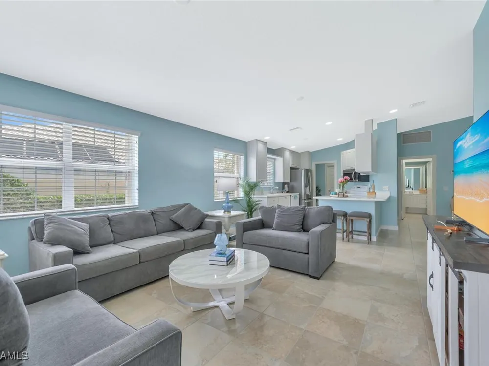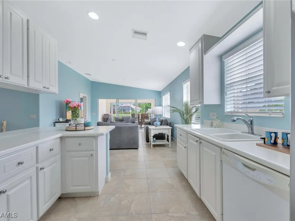 Check out our video link attached so you get a real feel inside this superb gated community Verona Walk property! This popular Capri attached villa, built of poured concrete by renowned developer DiVosta, sits on an oversized lakefront lot and offers 2 bedrooms, 2 baths, a flex/den, and a 2-car garage. The bright split-bedroom floor plan is ideal for visiting guests and family. Interior features include newly laid LVP Cortec flooring in bedrooms, freshly re-grouted natural tan tile flooring throughout the main living areas, vaulted ceilings, and a wall of windows bringing in natural light. The living room features a built-in wall unit for storage and display. The open kitchen has all appliances including a split sink and KOHLER garbage disposal, along with a newer LG stainless refrigerator. A full laundry room offers cabinetry, sink, glass block light, and pantry closet. Great storage throughout the property. Recent improvements equating to over $32,000 in upgrades within the past 12 months include two electric hurricane shutters on the lanai plus accordion storm shutters for the rest of the home, garage opener with keypad, new appliances, professional ductwork cleaning, interior painting in the house and garage, Cortec flooring in bedrooms, new ceiling fans, and more. Sliding glass doors open to a covered lanai with extended screened patio overlooking the water, complemented by an extended screen porch with a new roof screen. This home is just a 9-minute walk to the community amenities and three doors down from the bike path. Verona Walk offers resort-style amenities: resort pool, tennis, pickleball, fitness center, miles of walking trails, and a Town Center with café, restaurant, post office, salon, gas station, and ice cream/coffee shop. Low HOA fees add to the appeal. Offered unfurnished but open to negotiation.