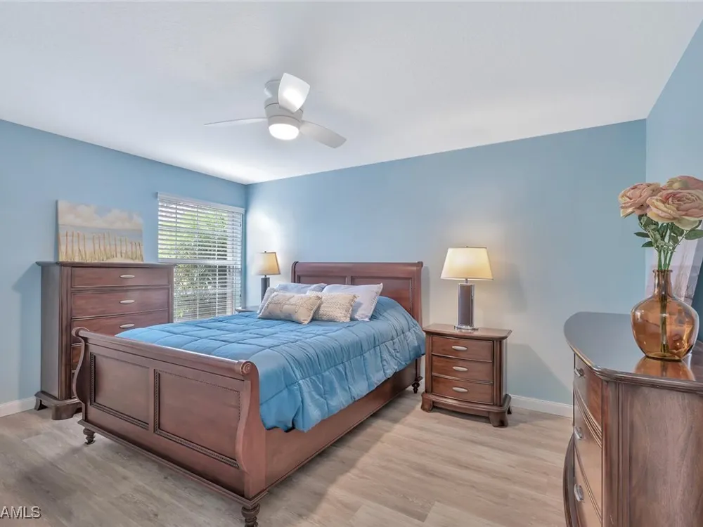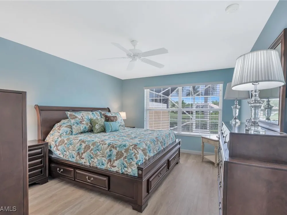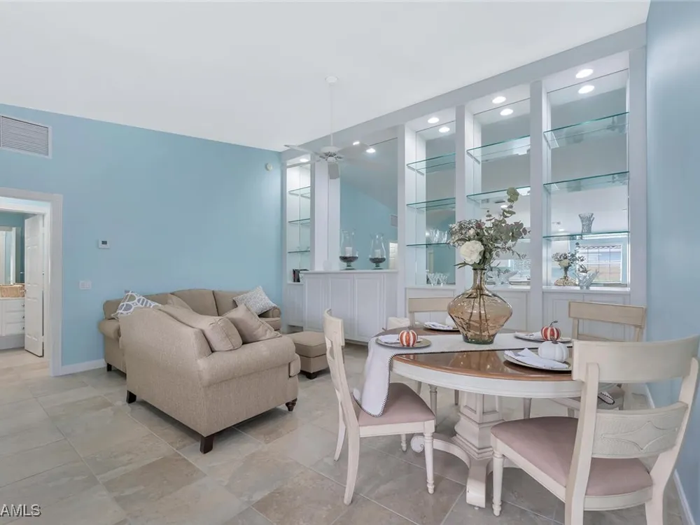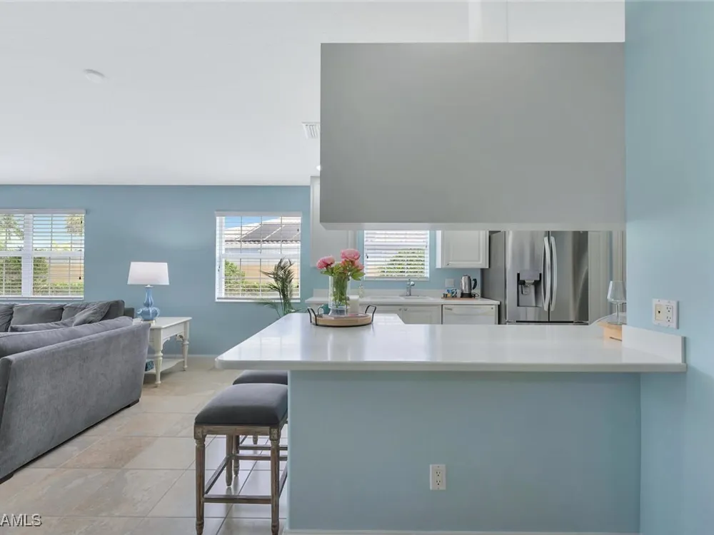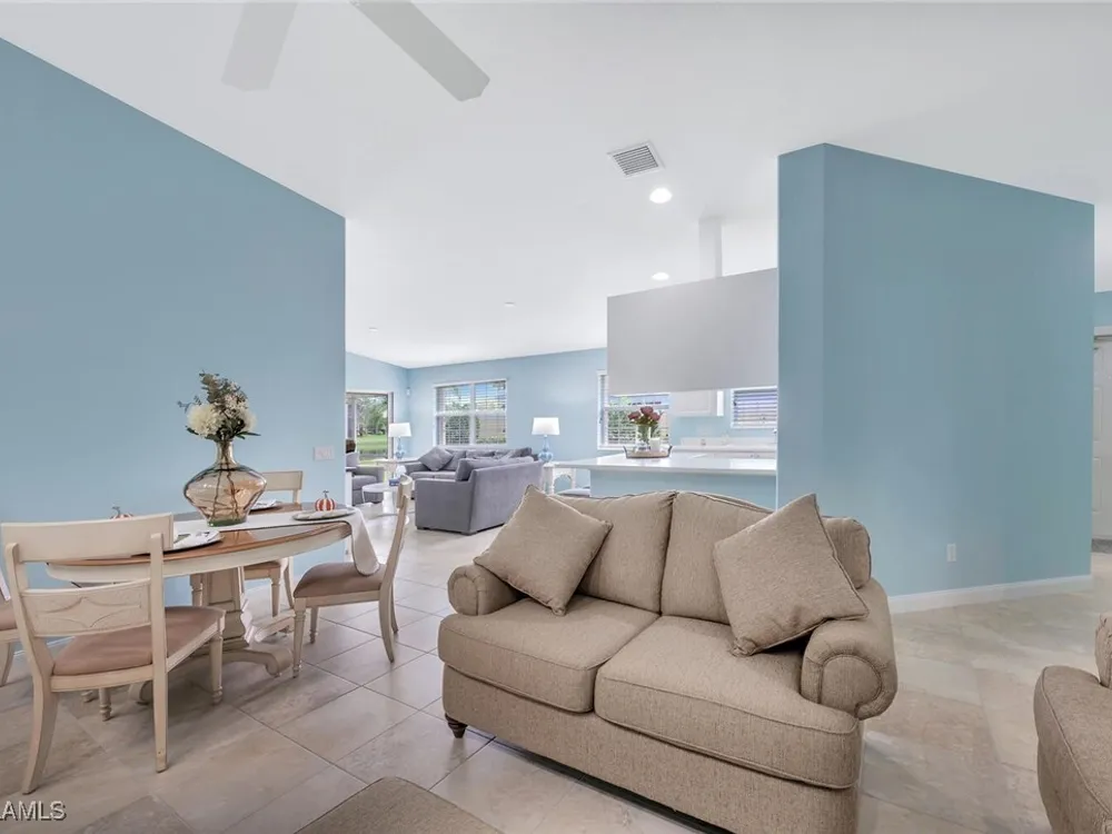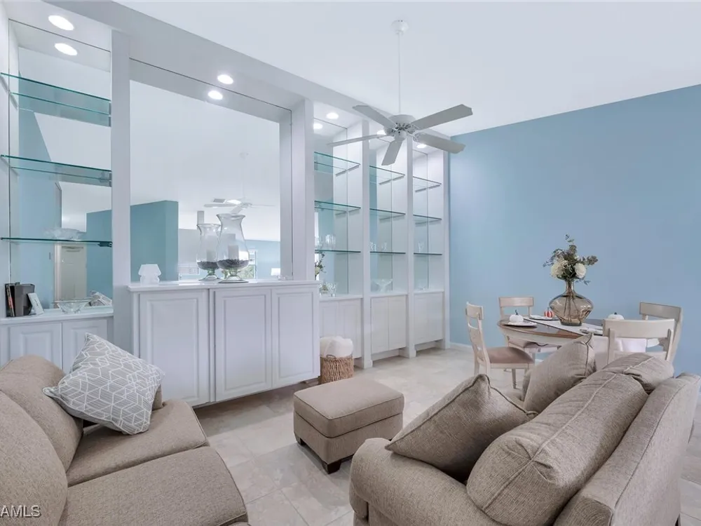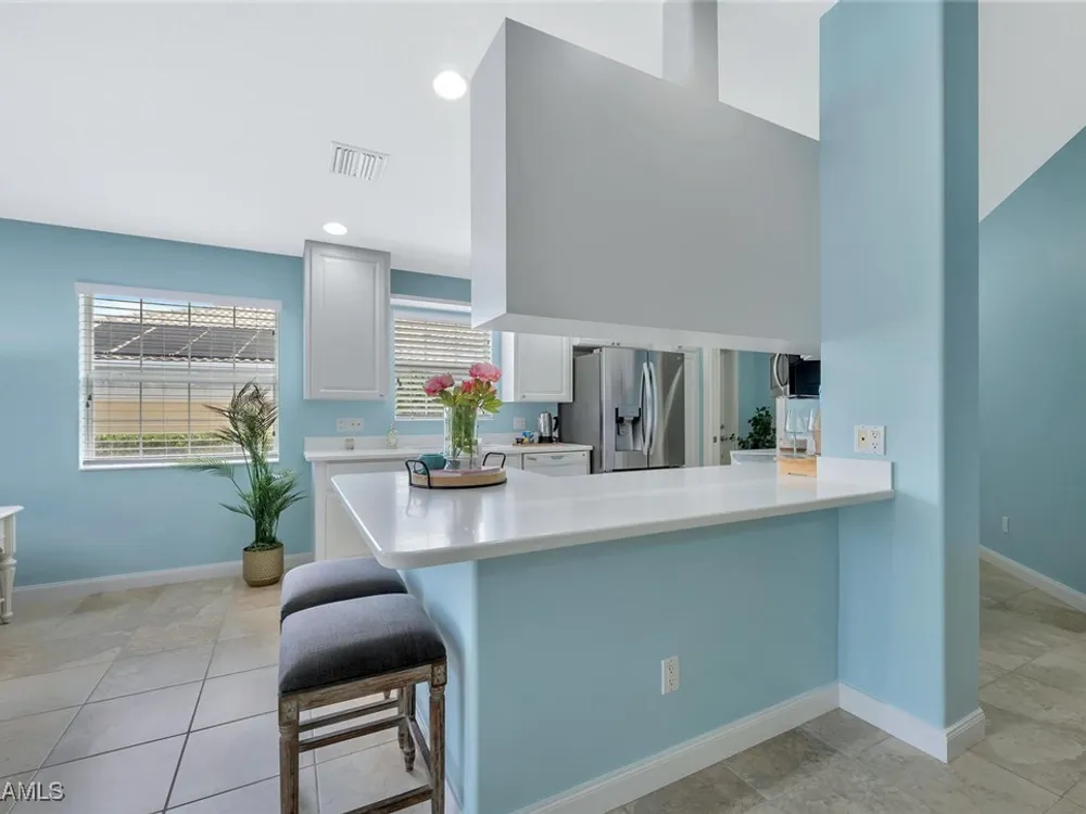 Check out our video link attached so you get a real feel inside this superb gated community Verona Walk property! This popular Capri attached villa, built of poured concrete by renowned developer DiVosta, sits on an oversized lakefront lot and offers 2 bedrooms, 2 baths, a flex/den, and a 2-car garage. The bright split-bedroom floor plan is ideal for visiting guests and family. Interior features include newly laid LVP Cortec flooring in bedrooms, freshly re-grouted natural tan tile flooring throughout the main living areas, vaulted ceilings, and a wall of windows bringing in natural light. The living room features a built-in wall unit for storage and display. The open kitchen has all appliances including a split sink and KOHLER garbage disposal, along with a newer LG stainless refrigerator. A full laundry room offers cabinetry, sink, glass block light, and pantry closet. Great storage throughout the property. Recent improvements equating to over $32,000 in upgrades within the past 12 months include two electric hurricane shutters on the lanai plus accordion storm shutters for the rest of the home, garage opener with keypad, new appliances, professional ductwork cleaning, interior painting in the house and garage, Cortec flooring in bedrooms, new ceiling fans, and more. Sliding glass doors open to a covered lanai with extended screened patio overlooking the water, complemented by an extended screen porch with a new roof screen. This home is just a 9-minute walk to the community amenities and three doors down from the bike path. Verona Walk offers resort-style amenities: resort pool, tennis, pickleball, fitness center, miles of walking trails, and a Town Center with café, restaurant, post office, salon, gas station, and ice cream/coffee shop. Low HOA fees add to the appeal. Offered unfurnished but open to negotiation.