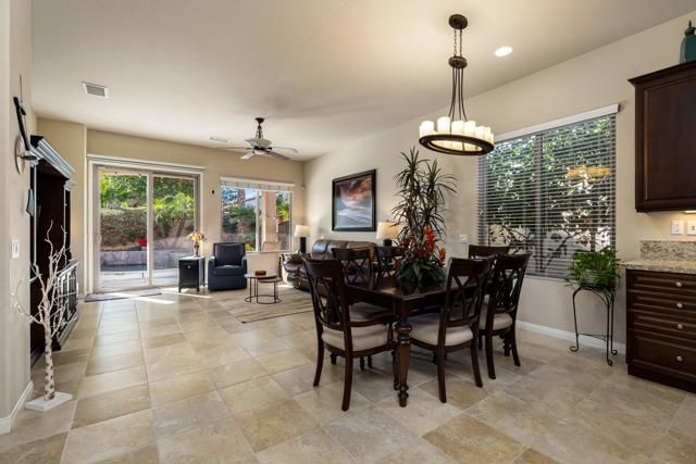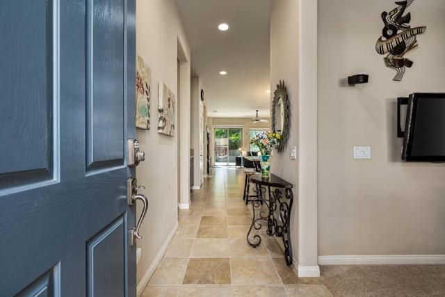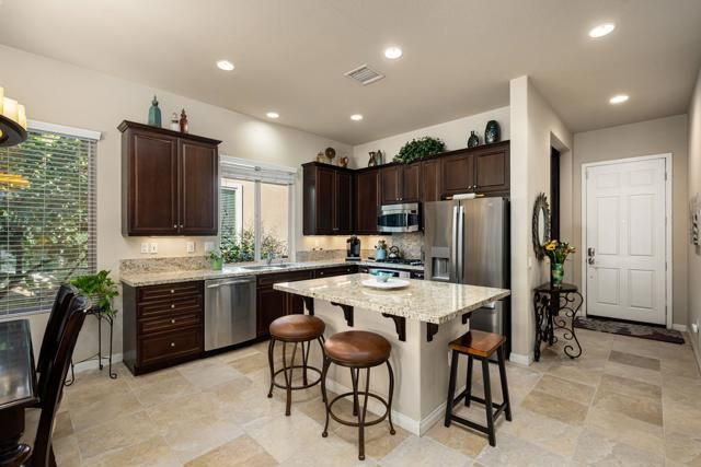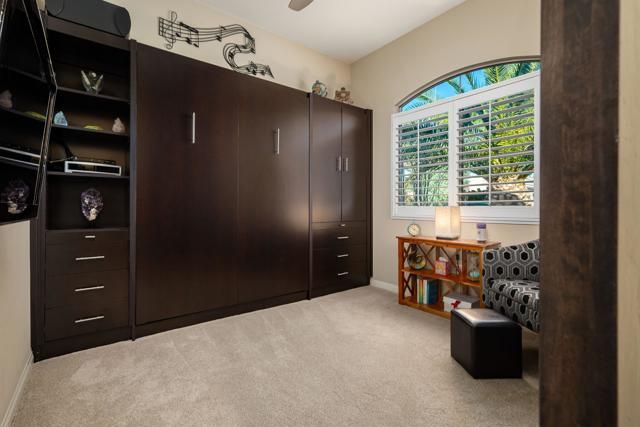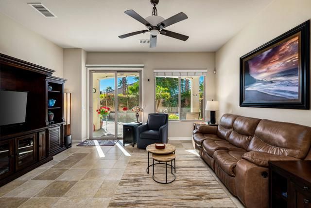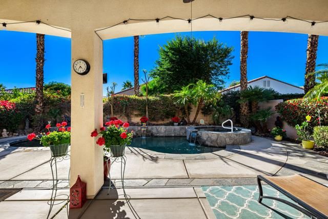 Welcome to resort-style living in the guard-gated 55+ community of Sun City Shadow Hills. This TURNKEY FURNISHED and impeccably maintained SERRENTE model offers a desirable SOUTH-FACING orientation, providing sunshine all day long. The versatile floor plan includes two bedrooms plus a DEN WITH MURPHY BED and privacy door, offering flexibility for use as a guest room while still allowing space for an office or hobby area. The private backyard is a true retreat, showcasing a pebble-tec SALTWATER POOL with waterfalls, RELAXING SPA, and extended patio--perfect for entertaining or unwinding year-round. Professionally landscaped front and rear yards with accent lighting enhance curb appeal and evening ambiance. Inside, enjoy porcelain tile flooring throughout the main living areas, plush carpeted bedrooms, and a well-appointed kitchen with granite slab countertops, center island, rich mocha cabinetry, and stainless-steel appliances. Additional highlights include a finished laundry room with cabinetry and sink, plantation shutters and blinds, ceiling fans throughout, security system, and earthquake retrofitted upper cabinets. Enjoy championship golf, clubhouses, pools, fitness centers, and an active lifestyle just minutes from Palm Springs, dining, and shopping. This home offers the perfect blend of comfort, style, and resort living in one of the Coachella Valley's premier 55+ communities.