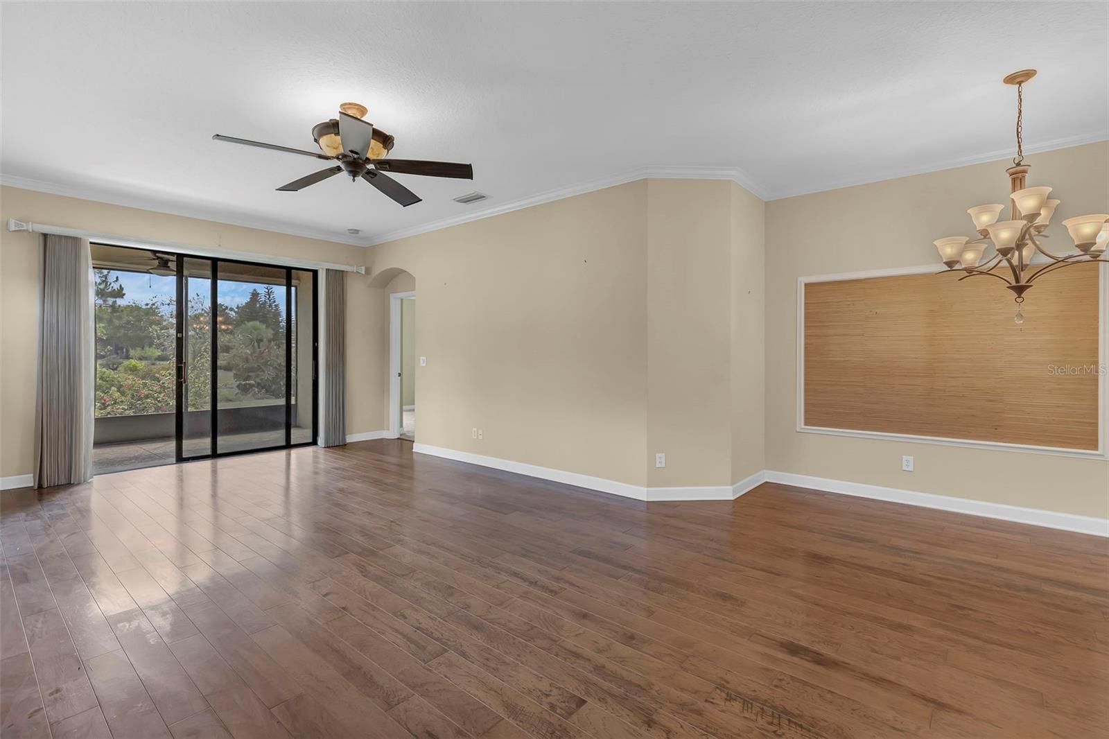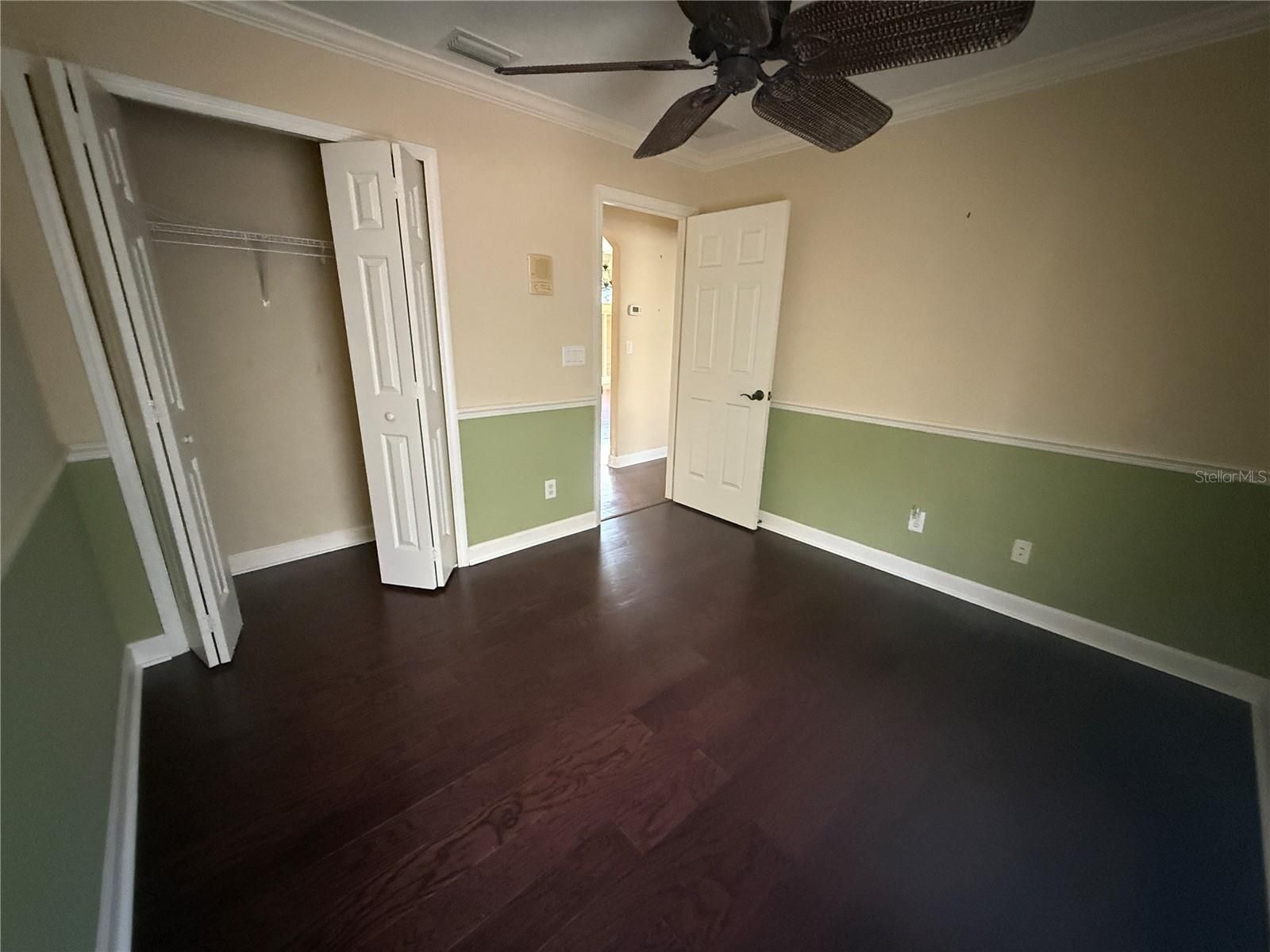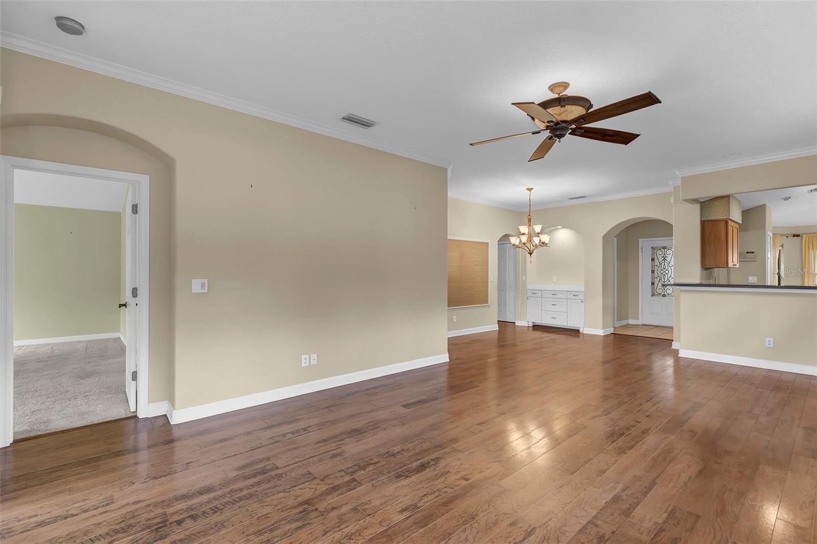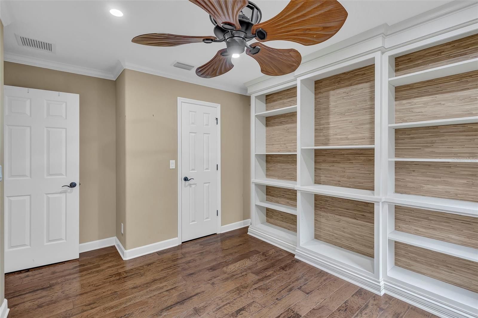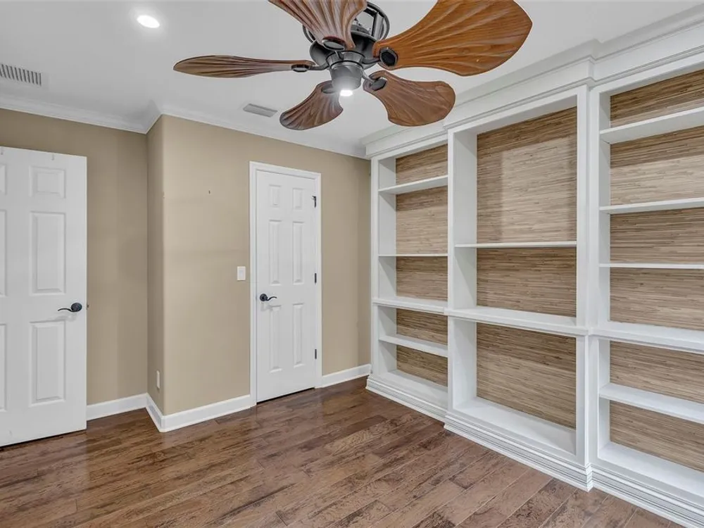 - Ceiling Fan(s), Crown Molding, Eat-in Kitchen, High Ceilings, Living/Dining Room, Main Level Primary, Solid Surface Counters, Solid-Wood Cabinets, Thermostat, Walk-In Closet(s), Window Treatments