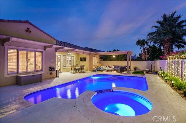 ***DON’T MISS THIS STUNNING CASTELLANO-MODEL POOL HOME—OVER $211,000 IN RECENT UPGRADES—IN THE HIGHLY DESIRABLE SUN CITY SHADOW HILLS COMMUNITY! Premium Quality, Absolutely Immaculate, and Truly Move-In Ready!***This beautifully maintained 2,230 sq. ft. single-story residence offers 2 bedrooms, 2.5 baths, and a spacious bonus office/den, all wrapped in an inviting open-concept design with travertine flooring and plantation shutters throughout. The brand-new gourmet kitchen is a chef’s delight, showcasing premium granite countertops, an enlarged center island, a 7-person breakfast bar, stainless steel appliances, five-burner gas cooktop, double ovens, under-cabinet lighting, and soft-close pull-out cabinetry. A generous dining area complements the kitchen, while the formal dining room—currently used as a sewing room—features a unique built-in shelf encircling the space. The expansive great room opens to your private desert oasis: a completely redesigned backyard with a new saltwater pool and spa, travertine decking (cooler underfoot in hot temps), fresh landscaping, a covered dining area, and an extended covered patio with a retractable movie screen—perfect for both relaxation and entertaining. The luxurious primary suite offers a large walk-in closet, dual vanities, a Roman soaking tub, and an oversized walk-in shower. The privately located secondary bedroom—with an adjacent full bath—is ideal for guests or multi-generational living. A stylish powder room is conveniently positioned off the main living area as well as a laundry room with sink and bonus cabinetry. The 2-car garage enjoys an additional 3rd golf-cart garage...the garage features insulated roll-up doors, overhead storage and a mini-split heating and air-conditioning unit (to moderate temperatures in summer and winter). Enjoy resort-style living in Sun City Shadow Hills, an active adult community featuring two golf courses with lakes, multiple clubhouses, fitness centers, indoor and outdoor pools/spas, pickleball, tennis, bocce, shuffleboard, table tennis, billiards, dining options, and countless clubs and activities. HOA dues even include internet! There is way too much to list everything that this property has to offer in this description! With exceptional upgrades and a brand-new pool and spa, this home truly defines desert living at its finest.