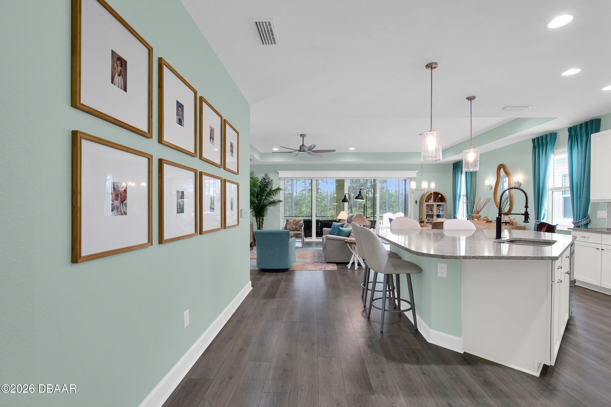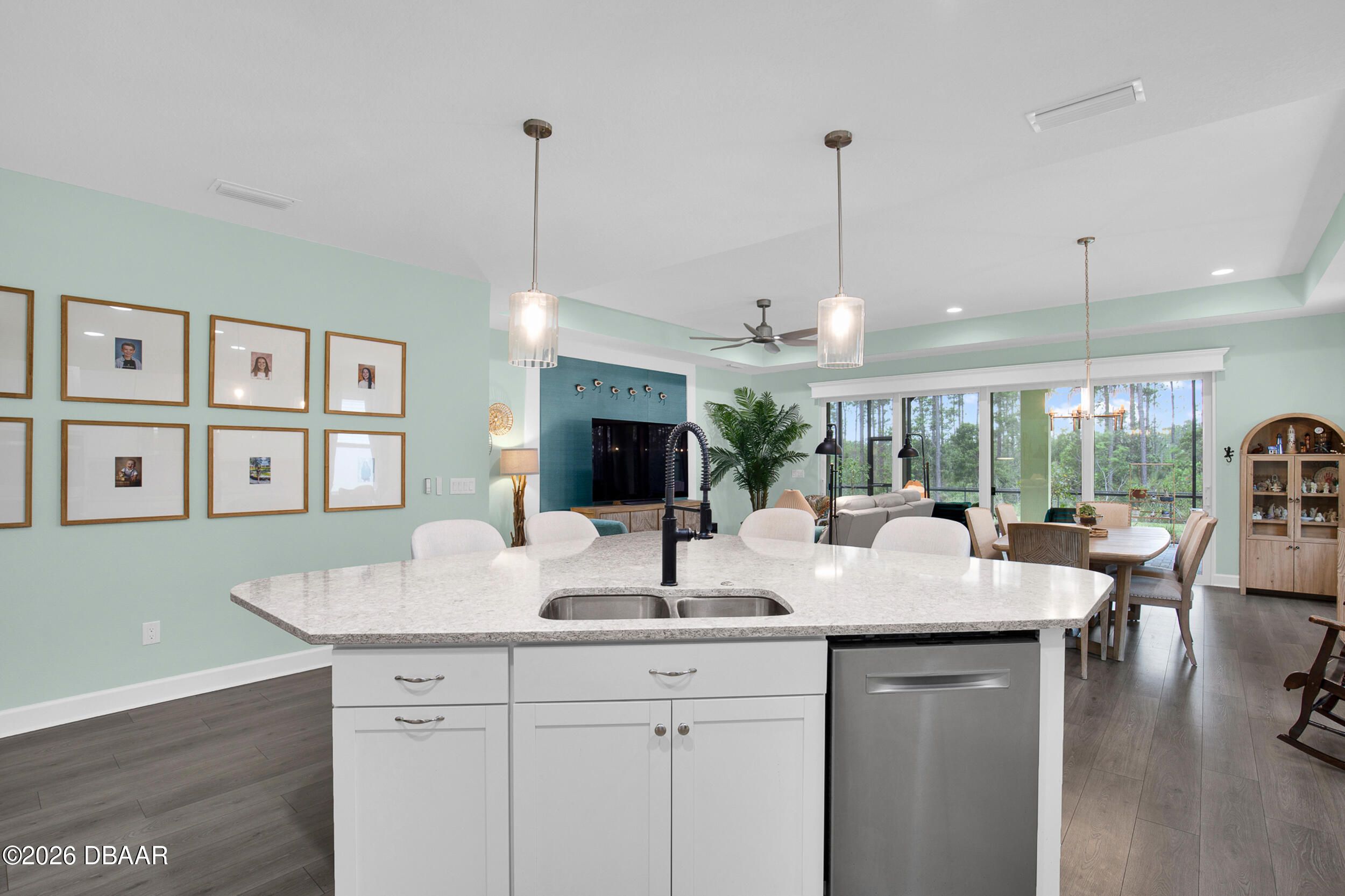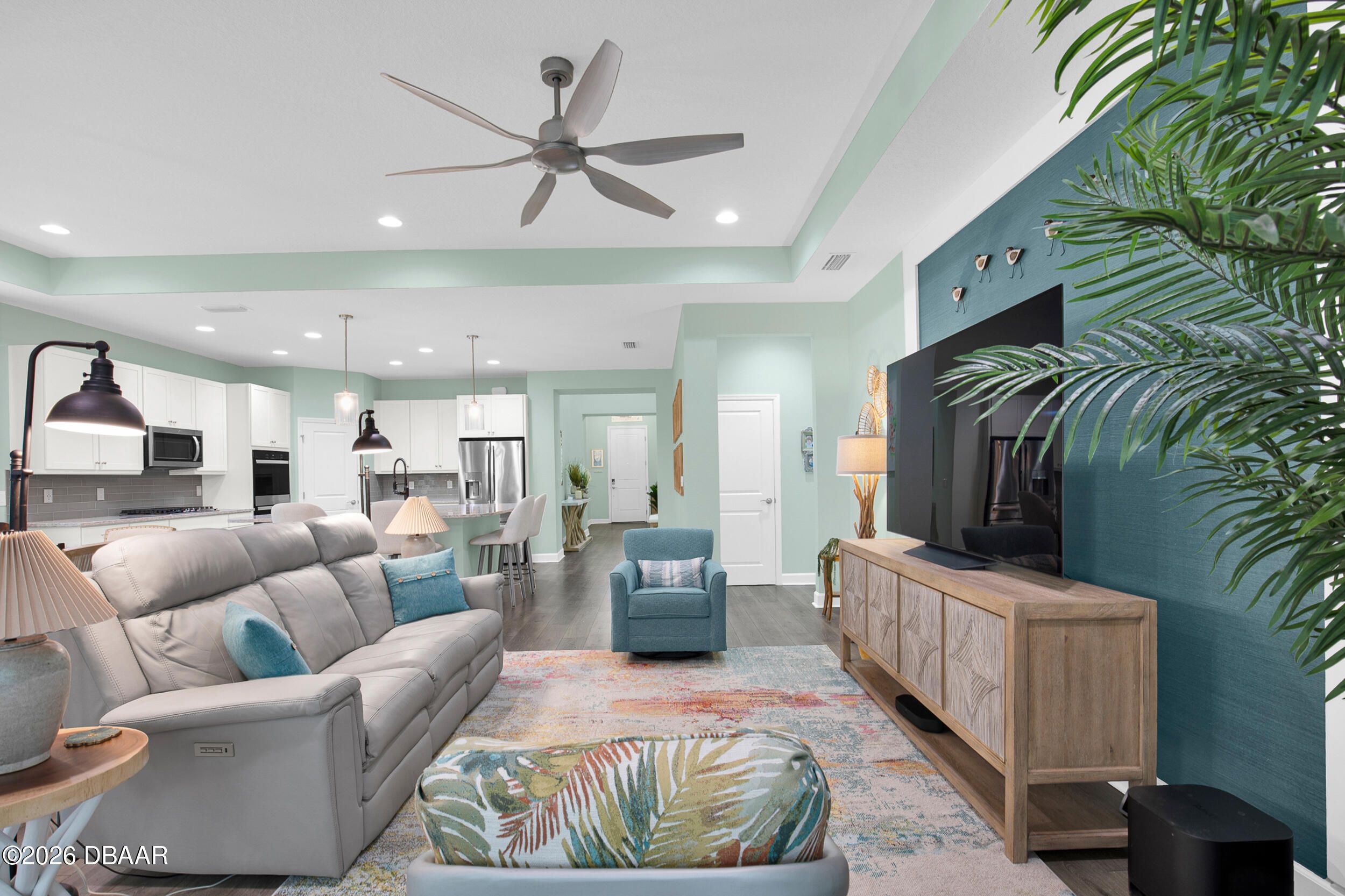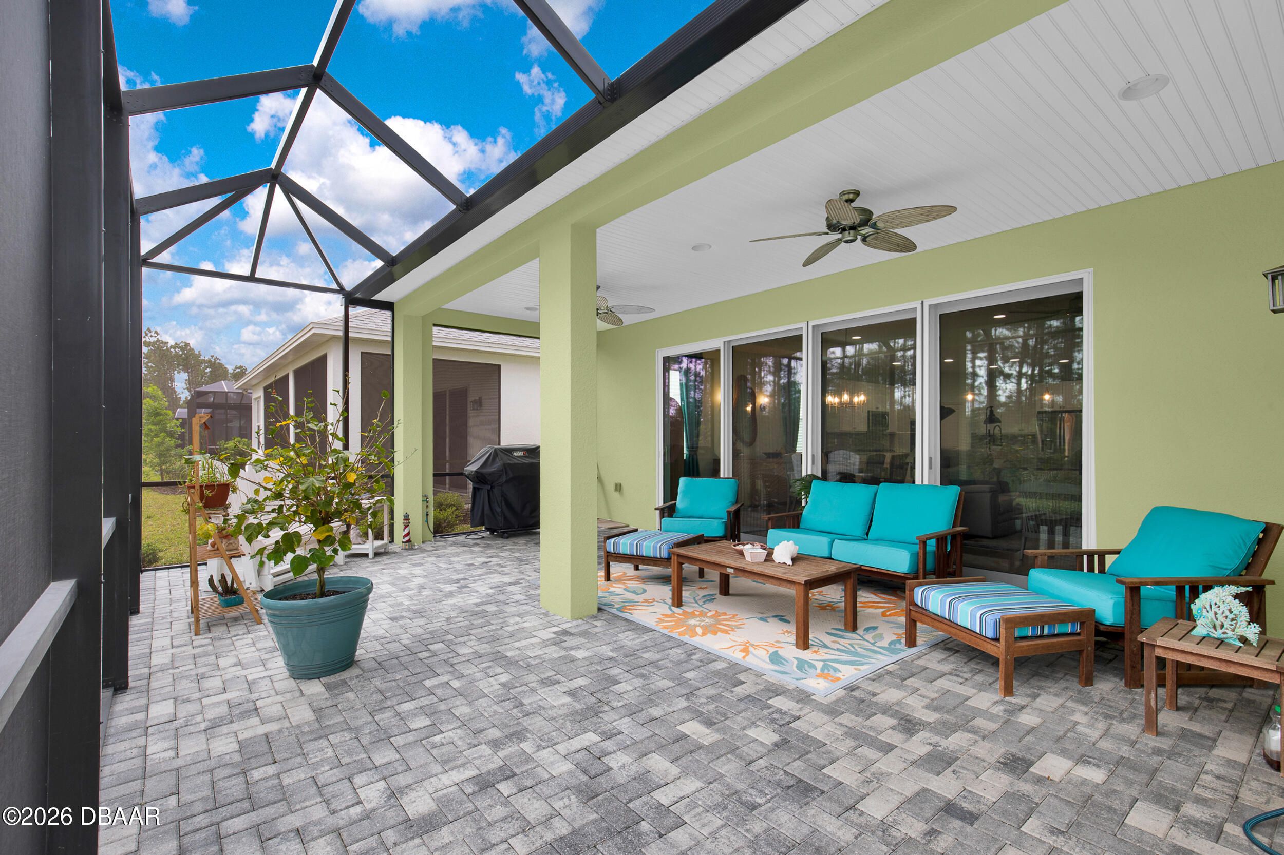 Beautiful Cabana Bay model on a premium preserve lot now available. You have to see this stunning Cabana Bay model from the Beach Collection. Nestled on a serene preserve lot, it boasts sleek quartz countertops throughout. The kitchen dazzles with soft-close Colada 42'' cabinetry, pull-out shelves, custom pendant lighting over the island, and recessed lighting throughout. The home's beachy charm is amplified by beautiful laminate plank floors. In the kitchen, you'll find a full backsplash, double sinks, double ovens, a gas cooktop, and a double trash pull-out. The primary bedroom features a beautiful bay window. Primary bathroom features double vanities, a frameless shower door and a full tile shower. There are two additional guest bedrooms, plus a versatile den with a nice window.. The guest rooms share a full bathroom, and there's a convenient half-bath as well. Finally, the screened lanai offers tranquil preserve views--it's a true retreat. The laundry room offers a convenient utility sink. There is a whole-house water filtration and a loop for a softener, and the garage has extra insulation. **Excluded Items: EV charger does not convey, Wood Storage cabinet on wall in garage does not convey and freezer in garage does not convey with sale. Latitude Margaritaville Daytona Beach is a premier 55+ private, gated community designed for active, resort-style living. Enjoy three heated pools, including a spectacular resort-style main pool, an indoor lap pool, and an outdoor sports pool. Fall in love with the exclusive PRIVATE BEACH CLUB, featuring an oceanfront pool and breathtaking coastal views. Soak up the vibe with live music every afternoon at the Bar & Chill Restaurant, or grab a bite at the lively poolside Sandbar. Stay energized at the state-of-the-art Fins Up Fitness Center, catch a show at the Mango Theater, and enjoy amenities like a dog park, pickleball, and tennis courts. Come experience this truly FINtastic community--where every day feels like a vacation.
