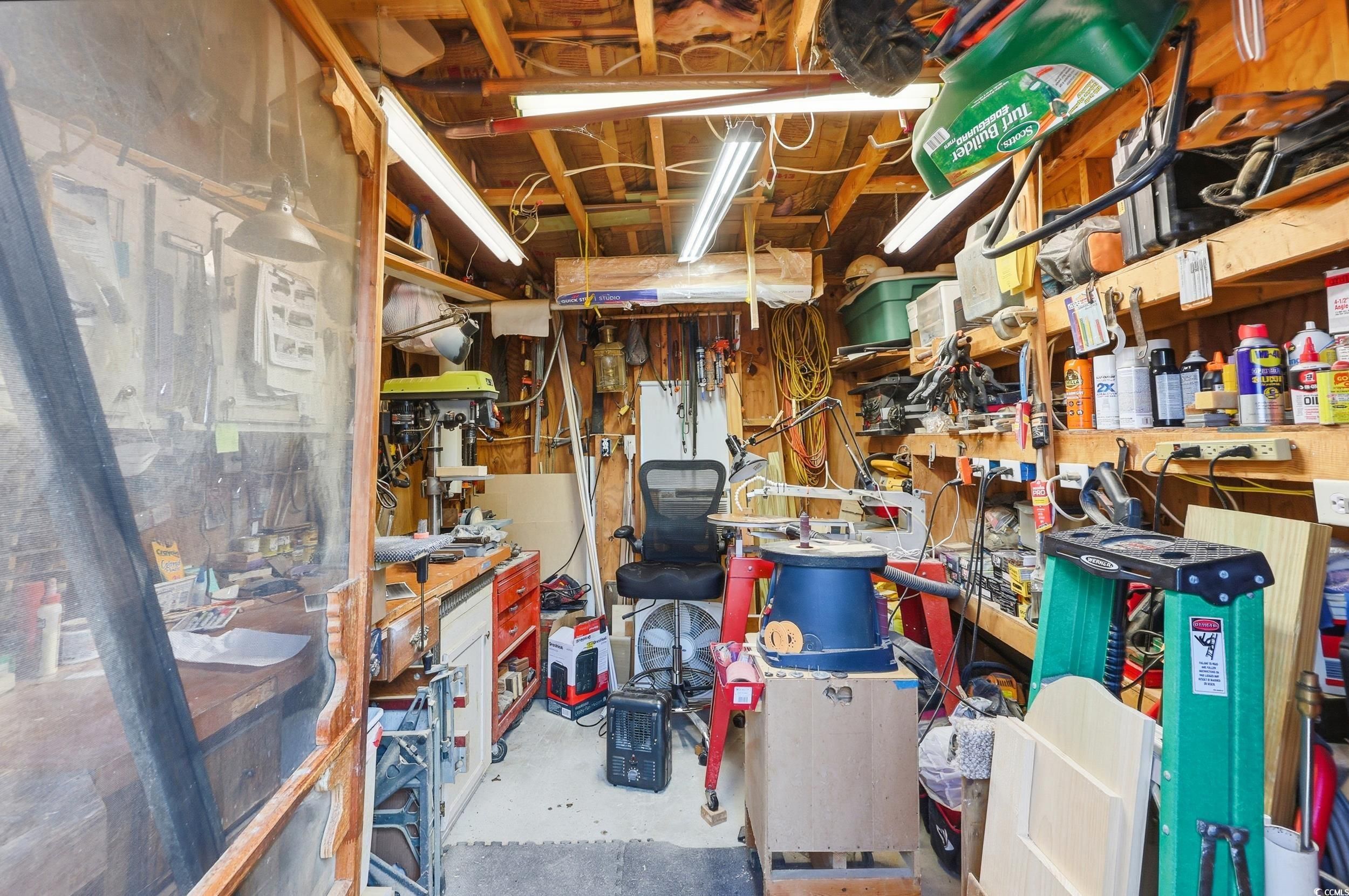- Ceiling Fan(s), Accessibility Features, LinenCloset, Main Level Primary, Separate Shower, Walk-In Closet(s), Bedroom on Main Level, Breakfast Area, Solid Surface Counters, Workshop