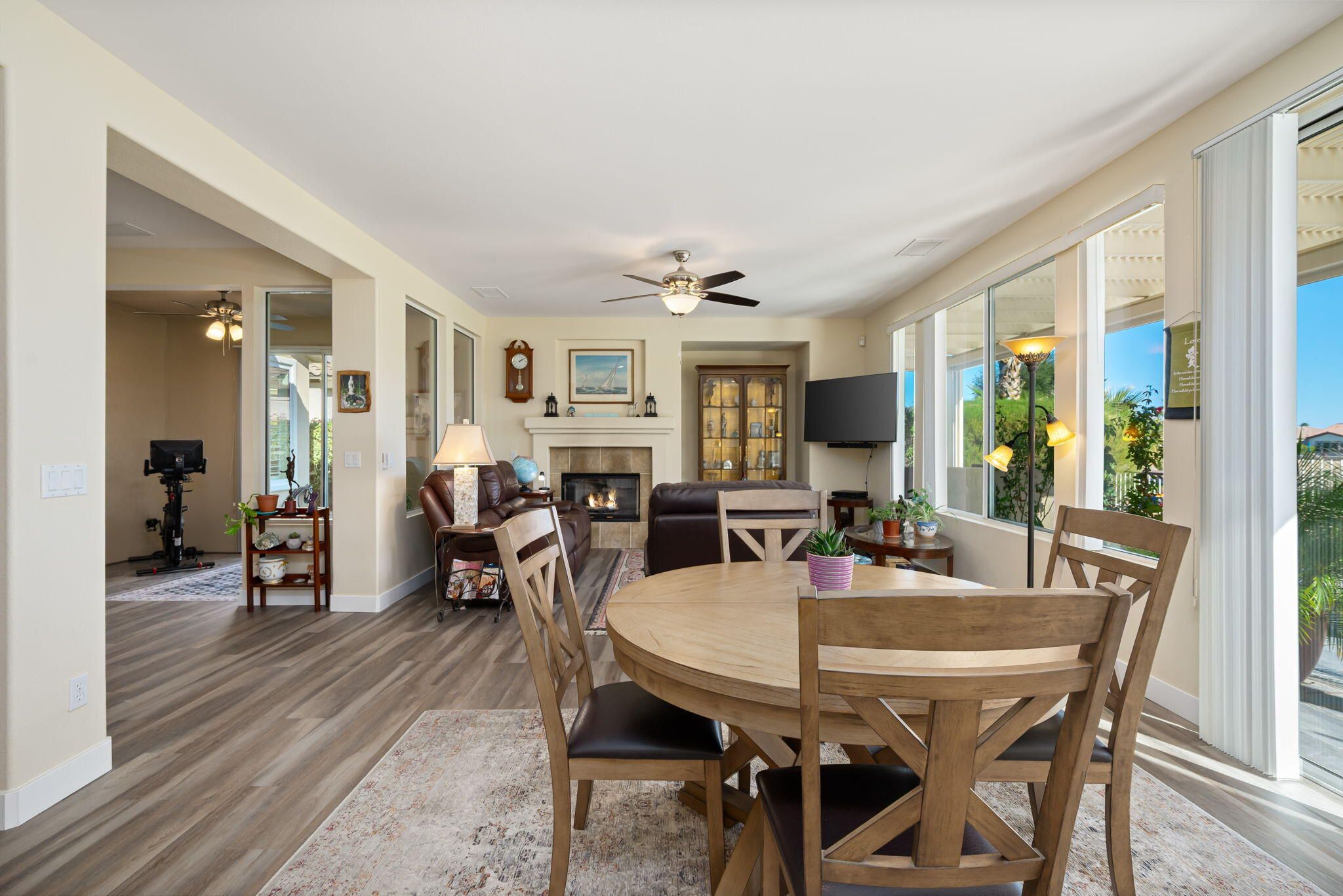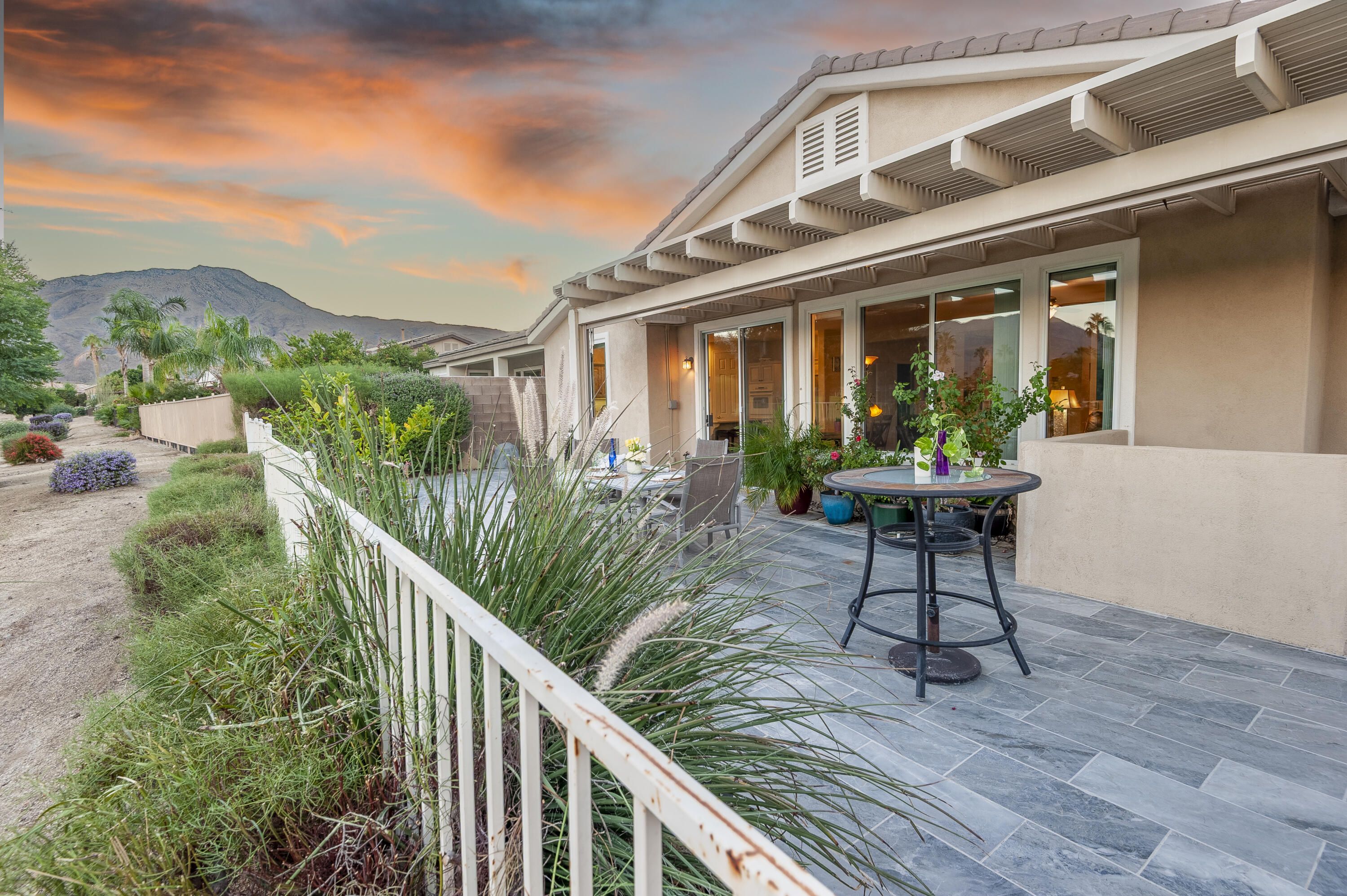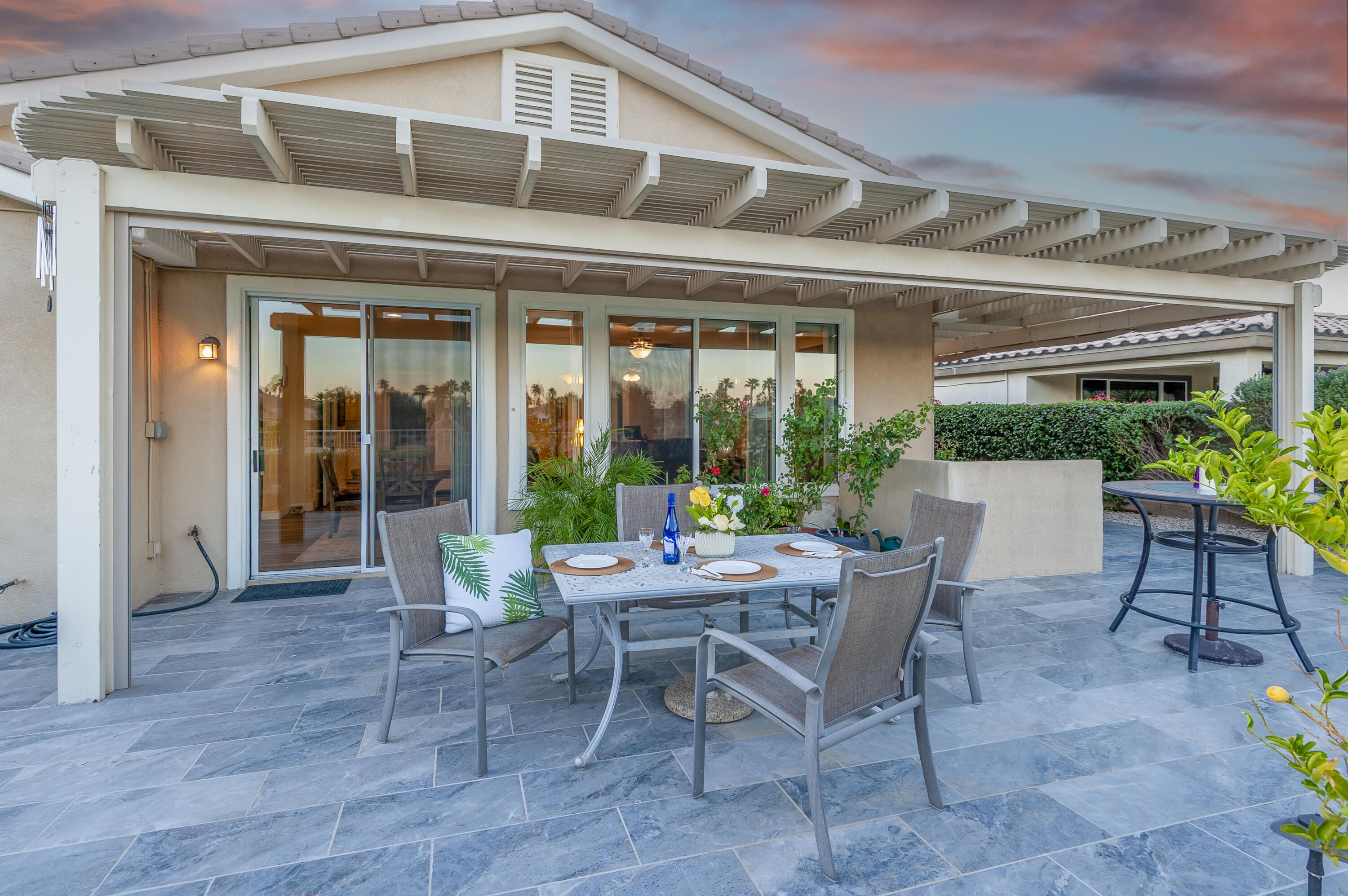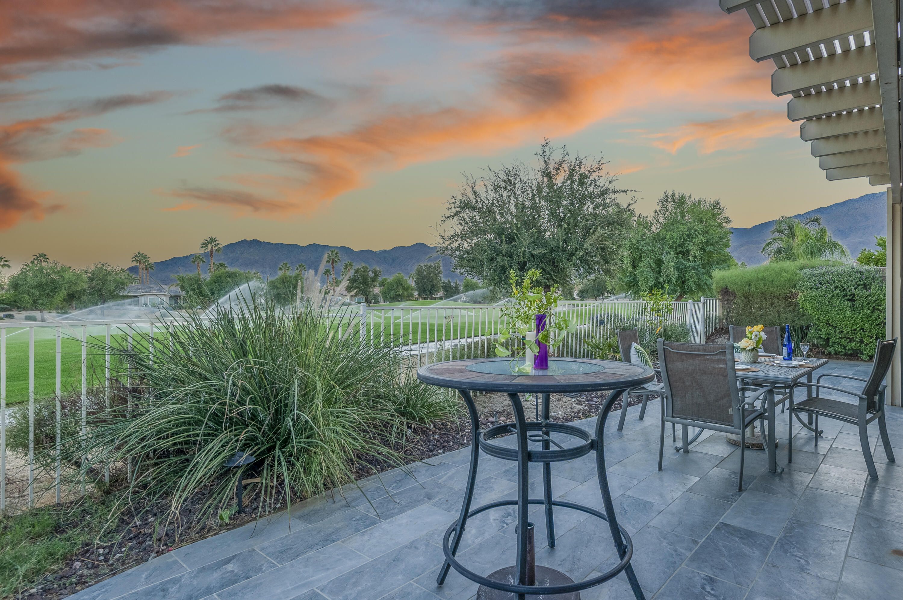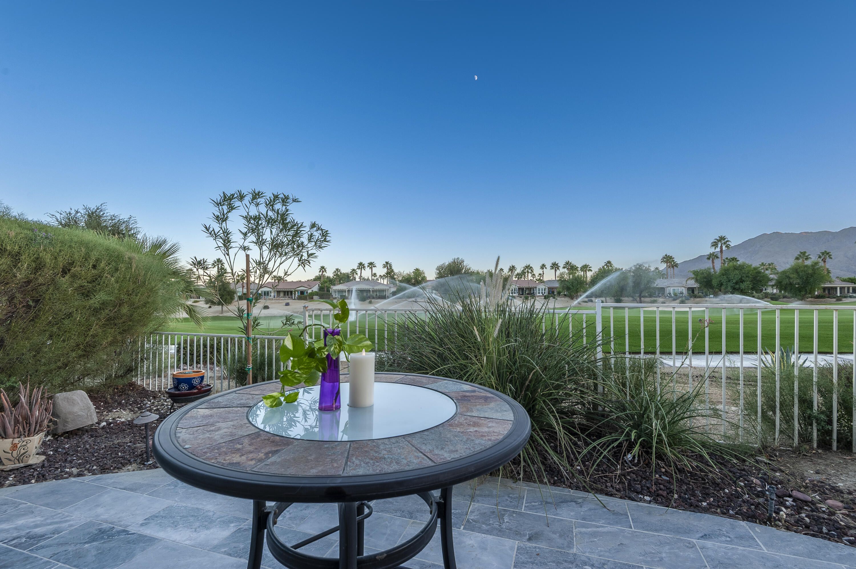 Sunshine, Fairways, and Mountain Views. Located in the heart of the Trilogy Golf Club at La Quinta, this delightful desert retreat makes the most of its sunny and expansive east and southwest golf course and mountain views. The open concept, nine-foot ceilings, and big picture windows open to a large back patio, making this 1,745 SQFT home feel much larger. And, with 2-bedrooms, 2-baths, a den/office, and bonus room, the home easily adapts to all your lifestyle needs. Inside, the home is upgraded with attractive and durable wide-plank luxury vinyl floors that blend seamlessly with the custom stone floors in the bedrooms. The primary bedroom is roomy with plantation shutters, and a large walk-in closet. The primary bath features dual vanities with custom antique white cabinets, and a walk-in steam shower, with custom tile surround and bench seat. The kitchen is open to the dining area with windows overlooking the back patio and big golf course views. Beautiful and efficient, the kitchen is well-organized for cooking and entertaining. Abundant quality antique white cabinets and a pantry keep the kitchen tidy. The counters and the center island are crowned with dreamy quartz, and are complemented by a glass subway tiled backsplash. A double oven, gas cooktop, microwave, double-sided refrigerator/freezer, and a dishwasher make quick work of meal prep. On cool winter days, the family room fireplace is the perfect spot to snuggle up with a good book or to binge-watch your favorite TV show. On warm sunny days, the slate colored tile flooring, a pergola and automated sun shades on the patio keep outdoor living comfortable. Anytime is the best time to watch the early sun rise above the horizon, golfers as they try to top their best scores, and the moon as it glides across the mountain peaks. A guest bedroom and a den with a nearby full bath are separated from the primary bedroom. An added bonus is a separate covered patio with etched glass walls, open to the main living area, and with sliding doors that open to a private patio at the side of the home. The garage fits two cars side-by-side with room for storage, and is air conditioned. Priced to sell this home will not last long. If looking for a golf course property, come see it today!