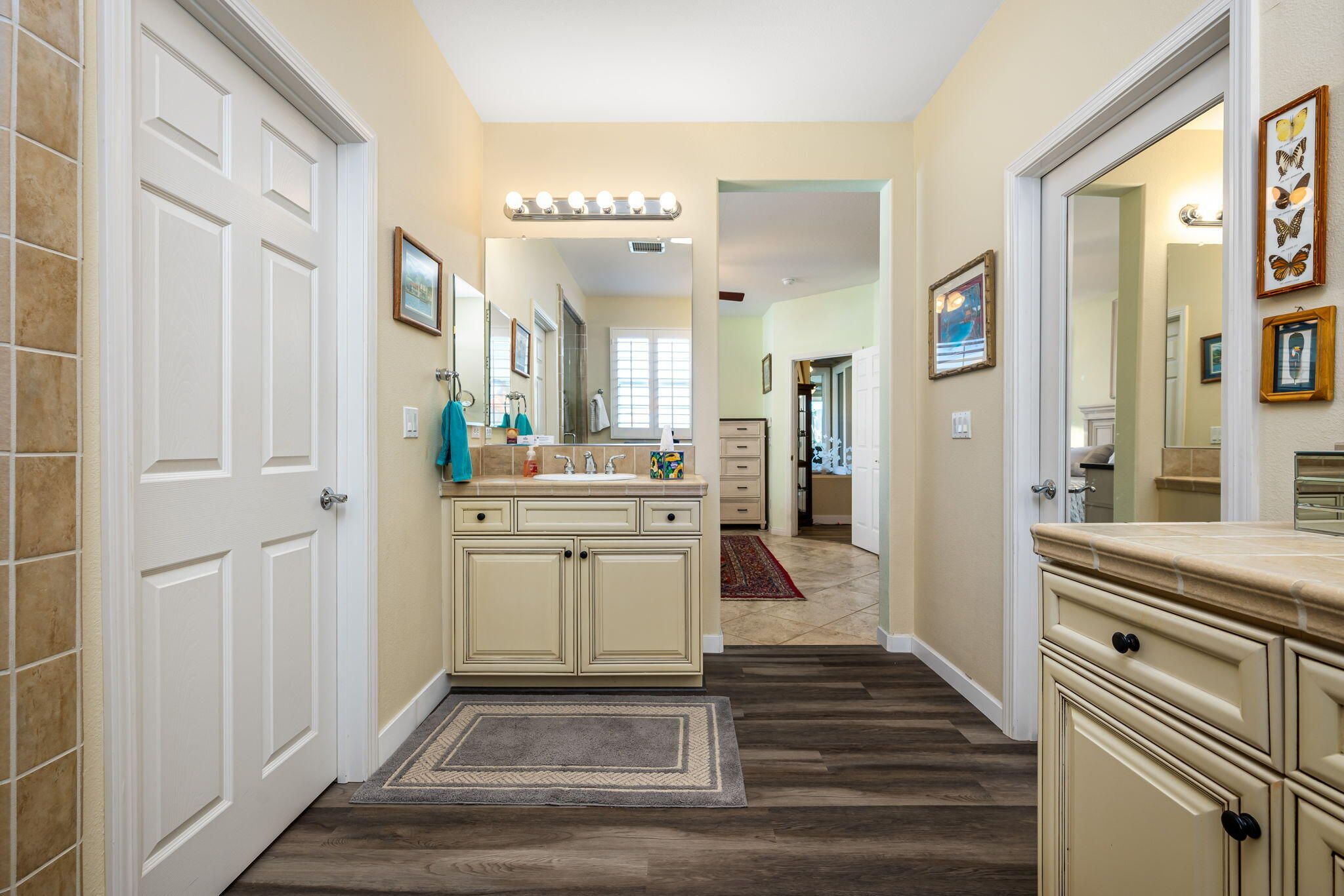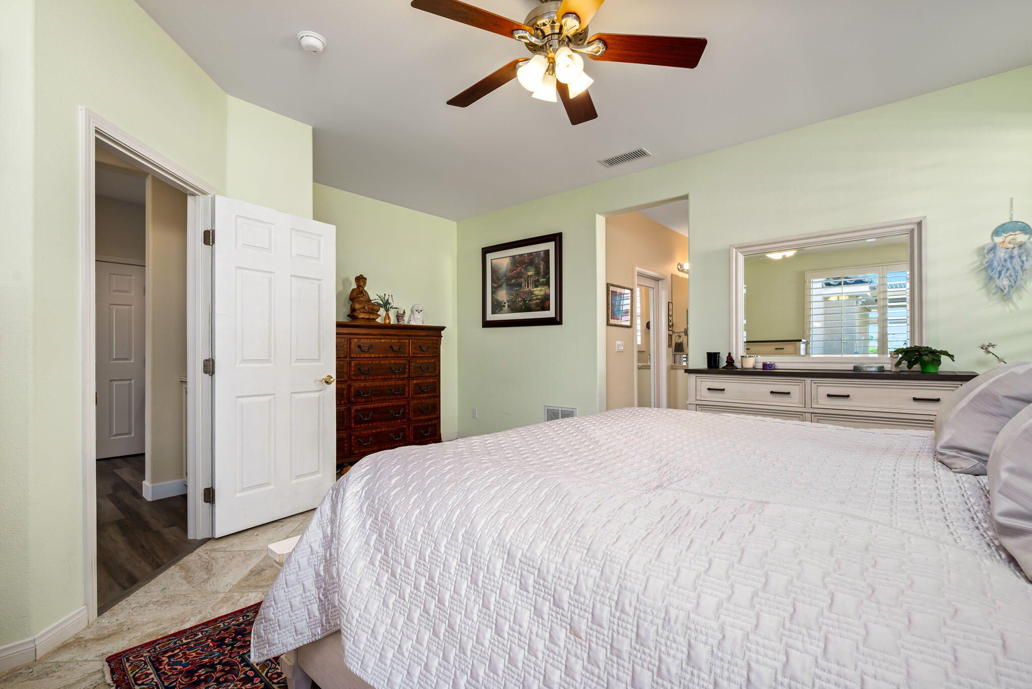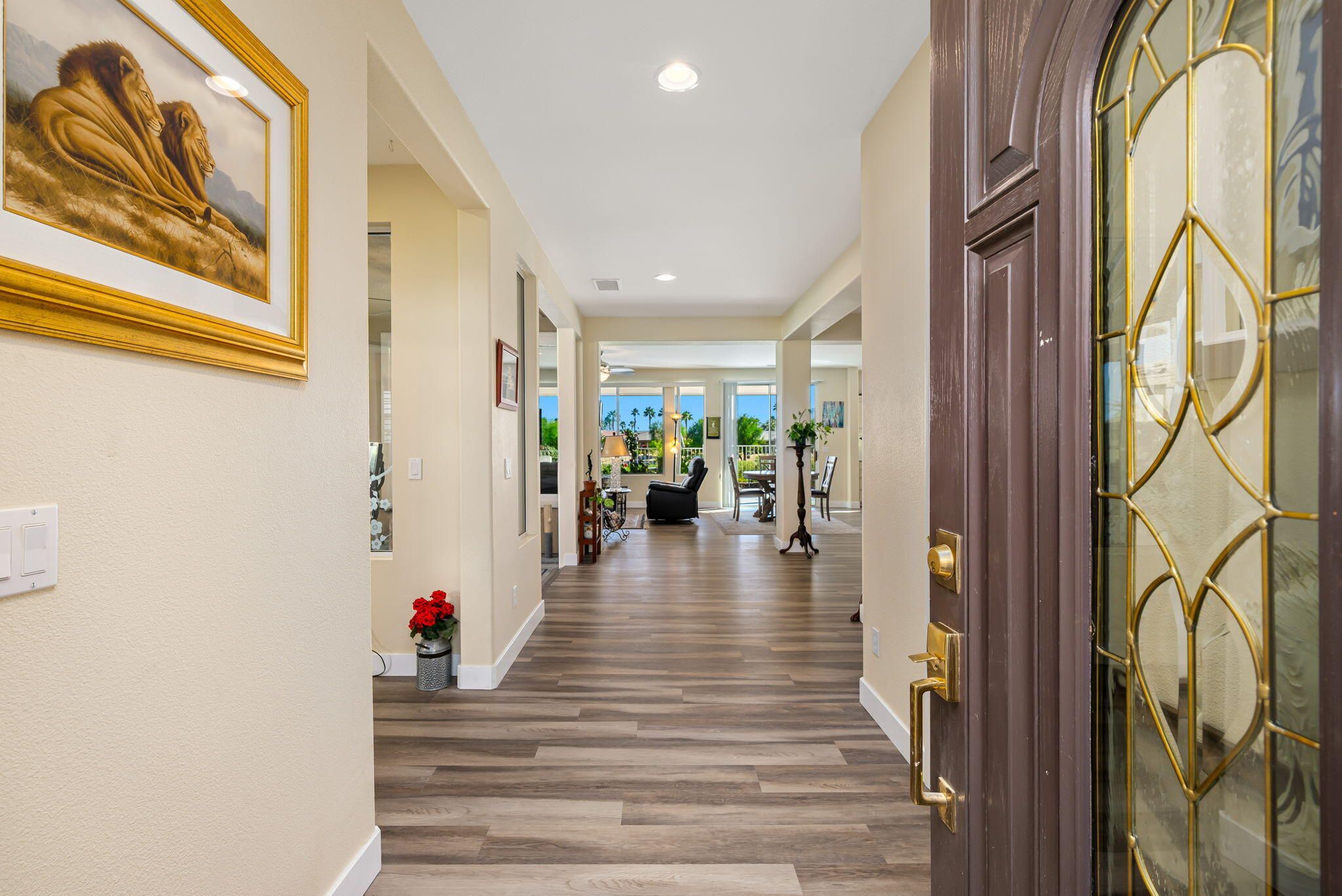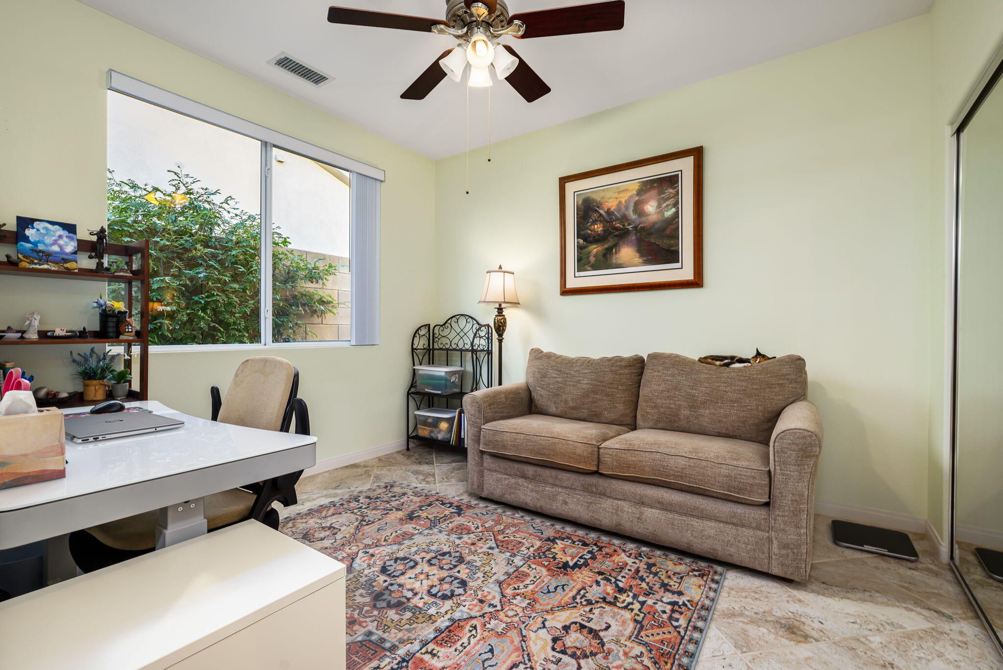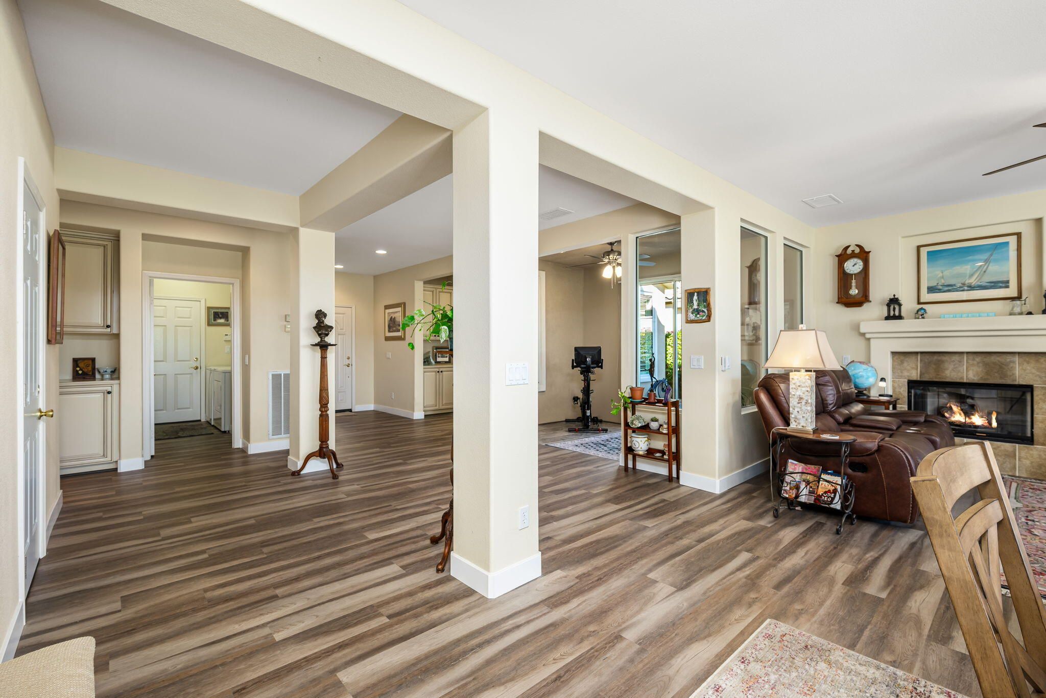 Sunshine, Fairways, and Mountain Views. Located in the heart of the Trilogy Golf Club at La Quinta, this delightful desert retreat makes the most of its sunny and expansive east and southwest golf course and mountain views. The open concept, nine-foot ceilings, and big picture windows open to a large back patio, making this 1,745 SQFT home feel much larger. And, with 2-bedrooms, 2-baths, a den/office, and bonus room, the home easily adapts to all your lifestyle needs. Inside, the home is upgraded with attractive and durable wide-plank luxury vinyl floors that blend seamlessly with the custom stone floors in the bedrooms. The primary bedroom is roomy with plantation shutters, and a large walk-in closet. The primary bath features dual vanities with custom antique white cabinets, and a walk-in steam shower, with custom tile surround and bench seat. The kitchen is open to the dining area with windows overlooking the back patio and big golf course views. Beautiful and efficient, the kitchen is well-organized for cooking and entertaining. Abundant quality antique white cabinets and a pantry keep the kitchen tidy. The counters and the center island are crowned with dreamy quartz, and are complemented by a glass subway tiled backsplash. A double oven, gas cooktop, microwave, double-sided refrigerator/freezer, and a dishwasher make quick work of meal prep. On cool winter days, the family room fireplace is the perfect spot to snuggle up with a good book or to binge-watch your favorite TV show. On warm sunny days, the slate colored tile flooring, a pergola and automated sun shades on the patio keep outdoor living comfortable. Anytime is the best time to watch the early sun rise above the horizon, golfers as they try to top their best scores, and the moon as it glides across the mountain peaks. A guest bedroom and a den with a nearby full bath are separated from the primary bedroom. An added bonus is a separate covered patio with etched glass walls, open to the main living area, and with sliding doors that open to a private patio at the side of the home. The garage fits two cars side-by-side with room for storage, and is air conditioned. Priced to sell this home will not last long. If looking for a golf course property, come see it today!