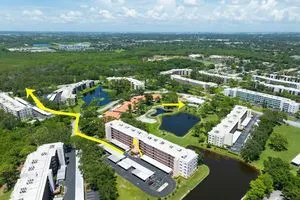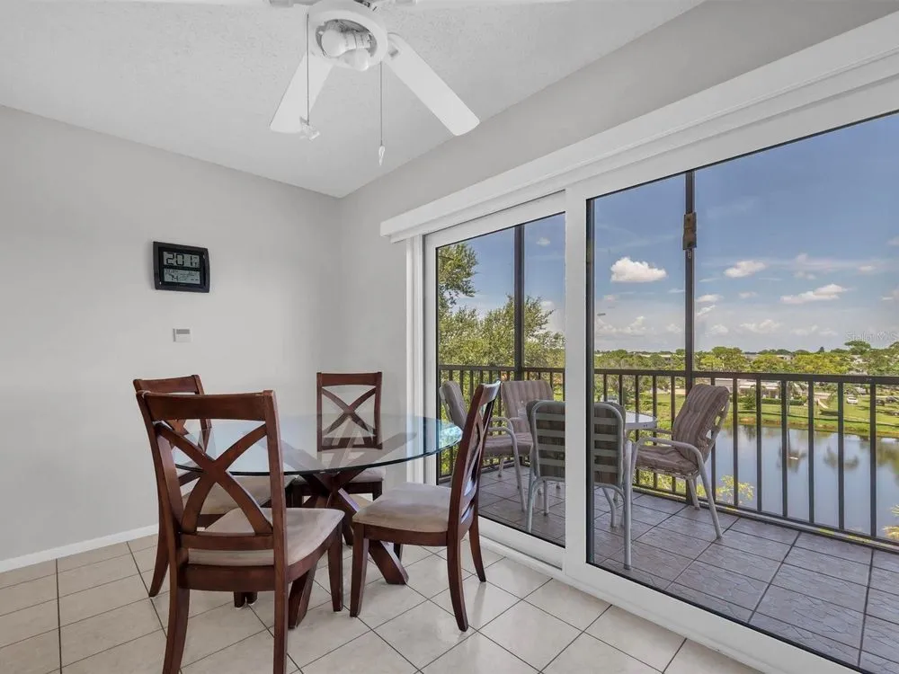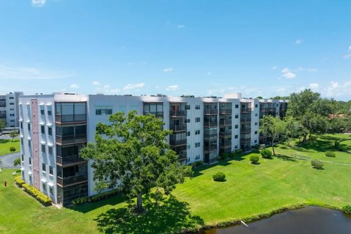 Top 5th-floor 2bed/2bath w/spectacular views facing east/Sunrise to a large pond w/a fountain from the large screened porch. This split floorplan offers new(2015)PGT Hurricane Impact windows and sliding glass doors& an upgraded custom electric shade for the sliders too. The kitchen has been tastefully renovated w/Corrian countertops, seamless double sink, GE side/side refrigerator & dishwasher(2024), and a Samsung microwave(2023). The full-size washer/dryer are located off the kitchen w/additional space for storage or an office area. The ($893)monthly fee includes water, sewer, garbage, gas & exterior amenities. One covered parking spot & ample additional guest parking available. Five Towns is an active 55+ resort style community w/over 144+acres, of walking paths, ponds, several pools, tennis courts, grilling pavilions& an abundance of wildlife! The Tiffany Bldg is one of the few that offer a "secured" lobby w/elevator access. Just minutes to Publix, Target & tons of restaurants including Bonefish Grill, Carrabba's & Texas Roadhouse. Meticulously maintained by the same owners since 1998.
