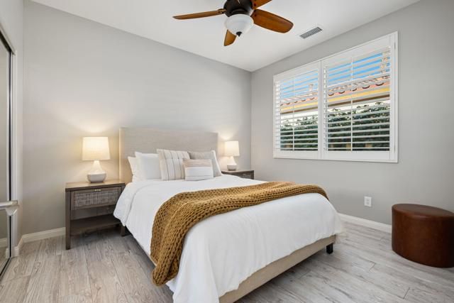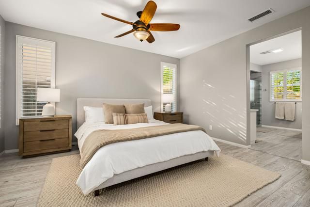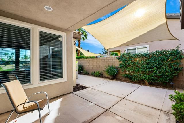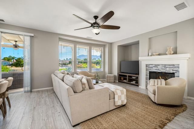 Exquisitely upgraded Maree plan located behind the private gates of the prestigious Trilogy La Quinta, a premier 55+ resort-style community. Perfectly situated on the 12th fairway of The Golf Club at La Quinta, this stunning residence showcases spectacular southern mountain, golf course, and spa views. Offering 1,771 sq. ft. of beautifully designed open-concept living space, the home features 3 bedrooms, 2 bathrooms, dual patios, and an abundance of natural light throughout. The charming Tuscan facade and custom glass-etched entry door set the tone for the refined interiors, where plank flooring flows seamlessly through the great room highlighted by a sleek tile-encased gas fireplace with mantel and media niche. The adjacent dining area opens to a chef's kitchen appointed with stainless steel appliances, built-in double ovens, microwave, prep island with bar seating, dazzling quartz countertops, custom tile backsplash, crisp white cabinetry, and a convenient pantry. The spacious primary suite is a private retreat with plantation shutters, a generous walk-in closet, and a spa-inspired en suite bath featuring dual vanities, quartz counters, and a stunning floor-to-ceiling tiled shower with frameless glass enclosure. Perfect for hosting guests, the additional bedrooms offer comfort and flexibility, complemented by a separate laundry room for convenience. The entertainer's backyard is an absolute showpiece, boasting a pergola-covered patio, a luxurious in-ground Pebble Tec spa with Tuscan stone surround and dual water descents--all framing the breathtaking panoramic golf and mountain views that define desert resort living at its finest.