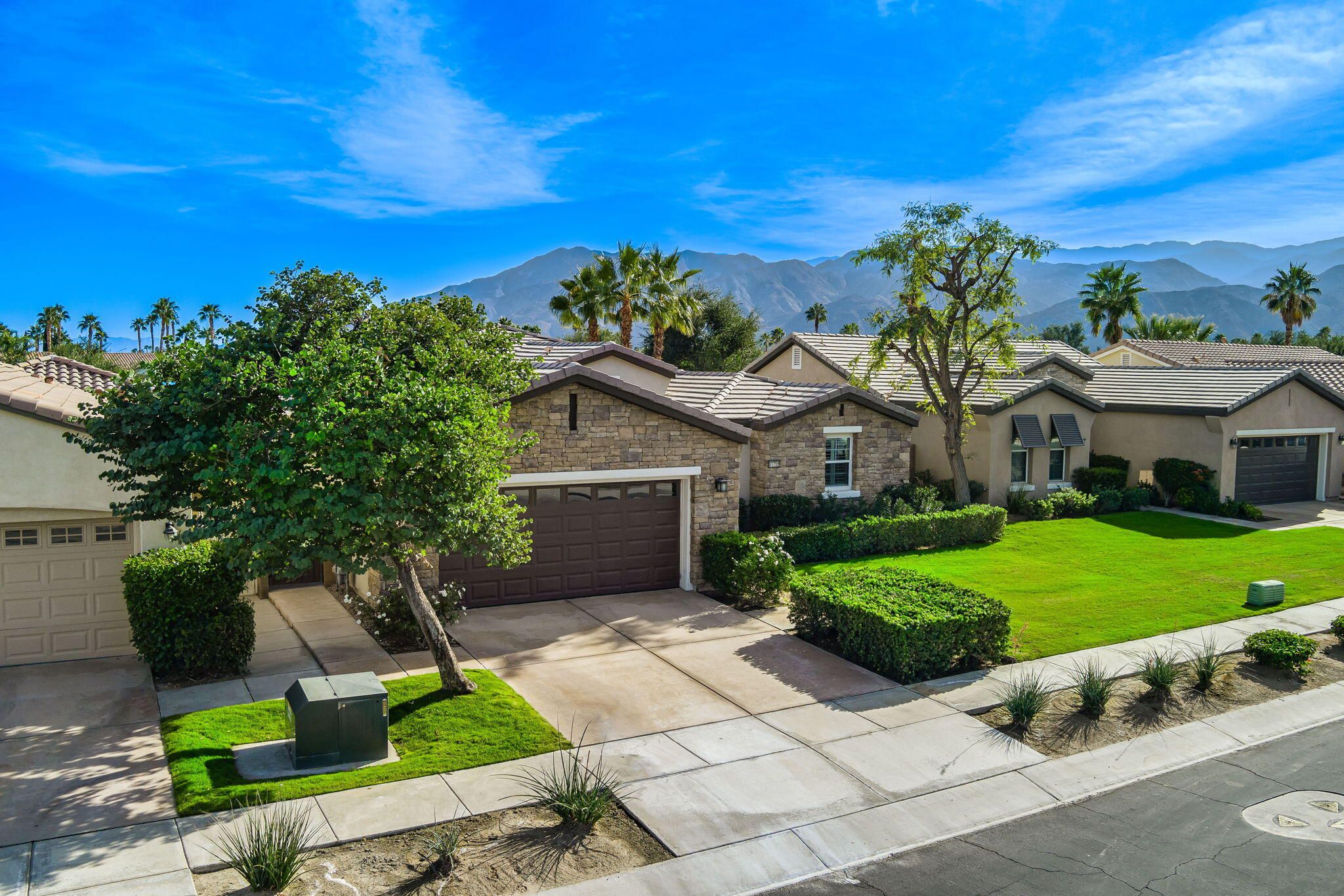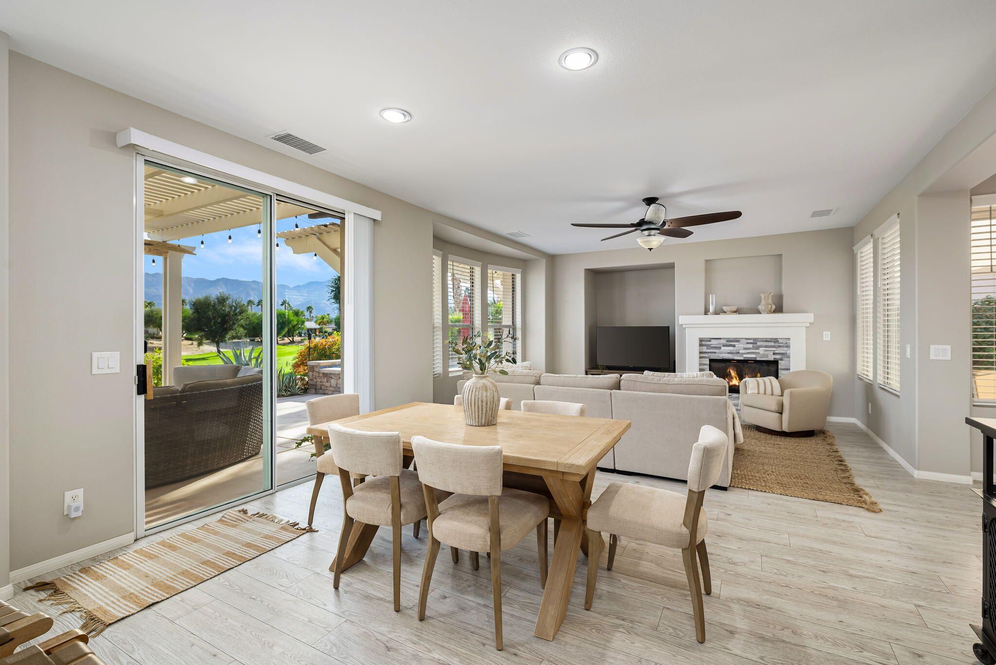 Exquisitely upgraded Maree plan located behind the private gates of the prestigious Trilogy La Quinta, a premier 55+ resort-style community. Perfectly situated on the 12th fairway of The Golf Club at La Quinta, this stunning residence showcases spectacular southern mountain, golf course, and spa views. Offering 1,771 sq. ft. of beautifully designed open-concept living space, the home features 3 bedrooms, 2 bathrooms, dual patios, and an abundance of natural light throughout. The charming Tuscan façade and custom glass-etched entry door set the tone for the refined interiors, where plank flooring flows seamlessly through the great room highlighted by a sleek tile-encased gas fireplace with mantel and media niche. The adjacent dining area opens to a chef's kitchen appointed with stainless steel appliances, built-in double ovens, microwave, prep island with bar seating, dazzling quartz countertops, custom tile backsplash, crisp white cabinetry, and a convenient pantry. The spacious primary suite is a private retreat with plantation shutters, a generous walk-in closet, and a spa-inspired en suite bath featuring dual vanities, quartz counters, and a stunning floor-to-ceiling tiled shower with frameless glass enclosure. Perfect for hosting guests, the additional bedrooms offer comfort and flexibility, complemented by a separate laundry room for convenience. The entertainer's backyard is an absolute showpiece, boasting a pergola-covered patio, a luxurious in-ground Pebble Tec spa with Tuscan stone surround and dual water descents—all framing the breathtaking panoramic golf and mountain views that define desert resort living at its finest.