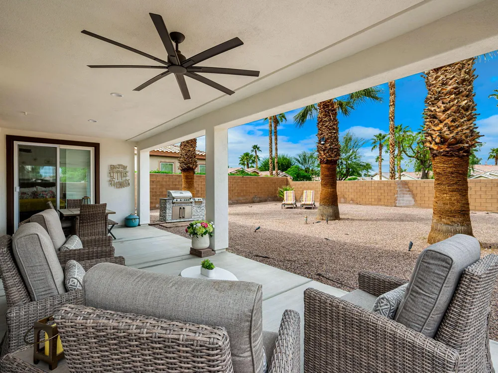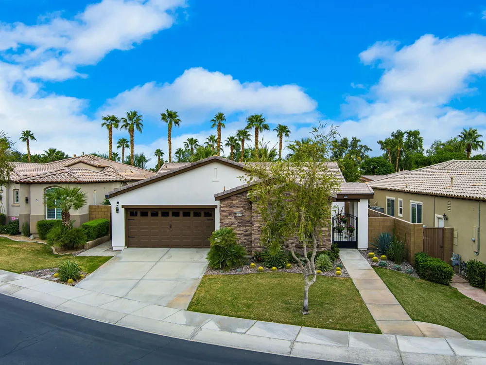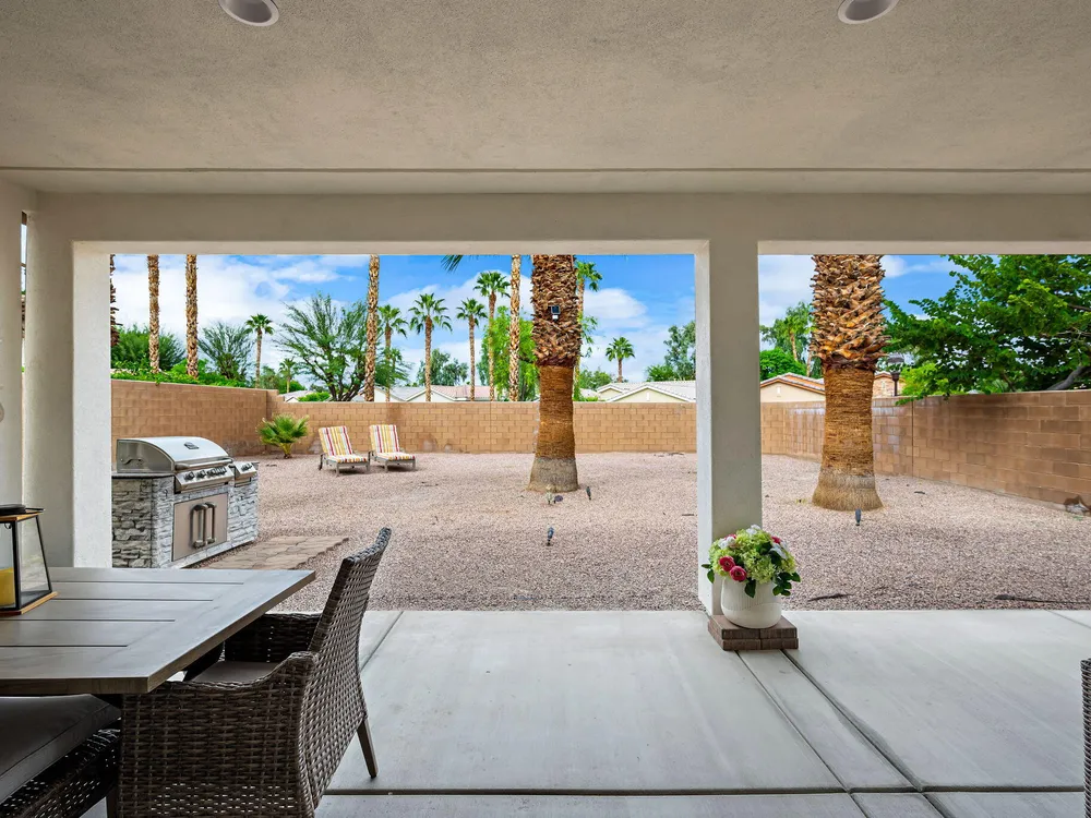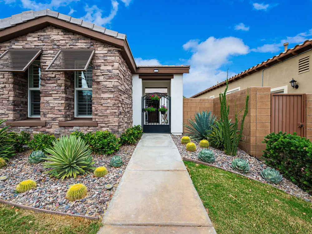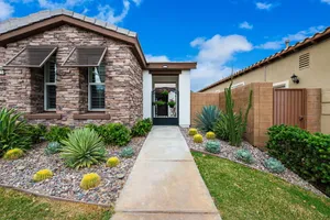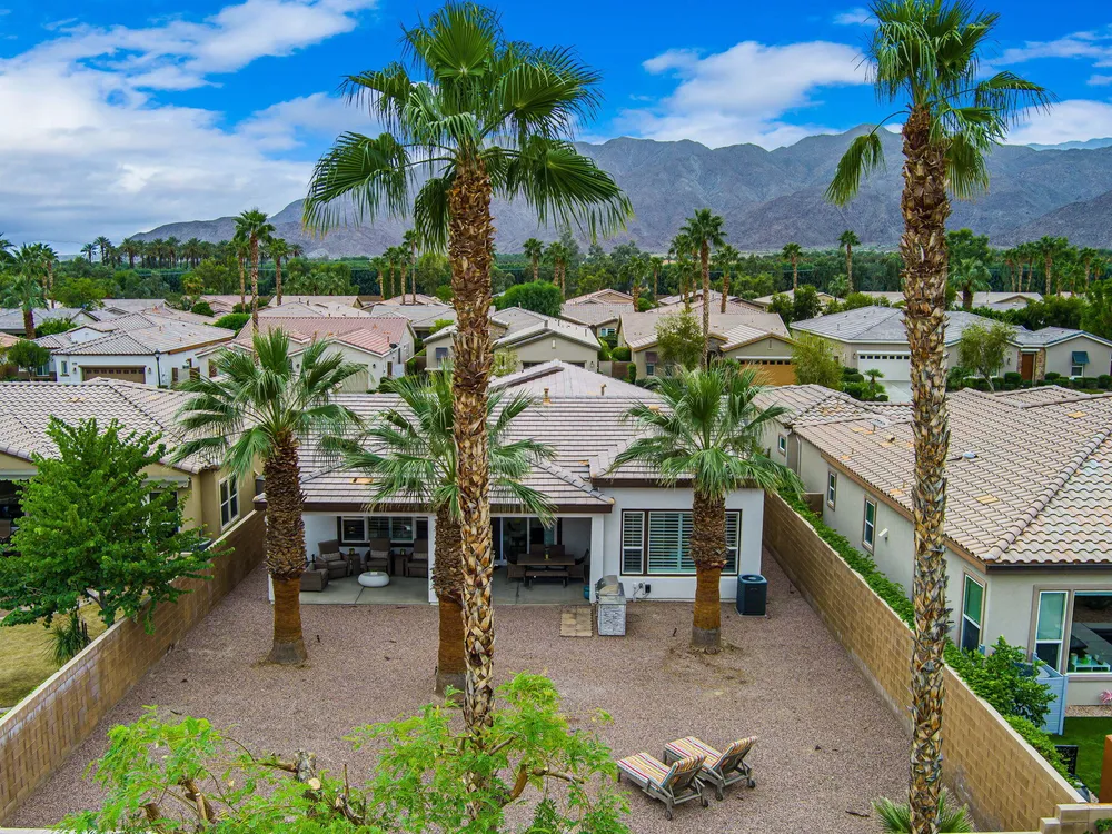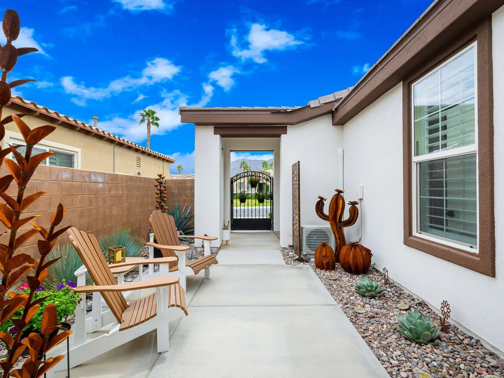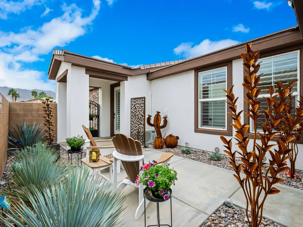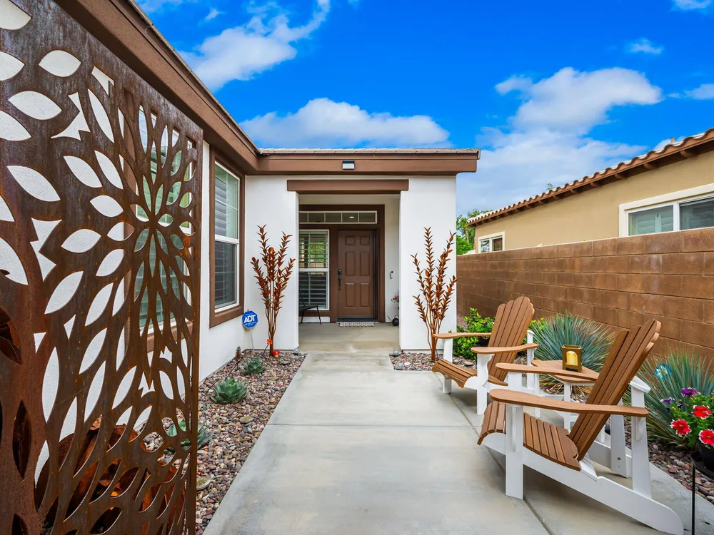 Absolutely stunning and meticulously upgraded, this sought-after Oasis plan is perfectly positioned on an oversized 8,276 sq. ft. homesite within the prestigious Trilogy La Quinta, a premier 55+ resort community. Featuring 3 bedrooms and 3 baths, this exceptional residence impresses with elegant quartz countertops throughout and a seamless blend of luxury and comfort. A charming Tuscan façade and wrought-iron privacy gate welcome you into a tranquil front courtyard, setting the tone for the refined interiors. Upgrades include all new LVP flooring, new landscaping in front and courtyard, fresh interior paint, paver path on side of home, all new window screens, added 21 can lights throughout and all new ceiling fans, including exterior. The great room showcases panoramic rear yard views, plantation shutters, custom built-in entertainment center, and stylish plank flooring, creating an inviting space for relaxation and entertaining. The gourmet kitchen is a showstopper, boasting stainless-steel appliances, white shaker cabinetry, waterfall-edge quartz island, designer backsplash, and custom coffee/beverage station with folding doors, farm sink, and illuminated glass uppers. The primary suite offers a peaceful retreat with bay window, patio access, and a spa-inspired bath featuring floor-to-ceiling tiled shower, dual vanities, and a generous walk-in closet. Guests will love the attached casita, complete with beverage center, mini-split A/C, built-in workstation, and private bath. Additional highlights include a four-foot extended garage with epoxy flooring, ample storage, and mini-split A/C. The expansive rear yard features an extended covered patio, concrete decking, and endless potential to create your own private pool or outdoor sanctuary—all while enjoying access to Trilogy's renowned Santa Rosa Clubhouse amenities. This home is a true desert gem—schedule your private tour today!