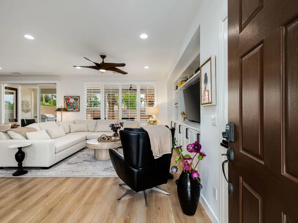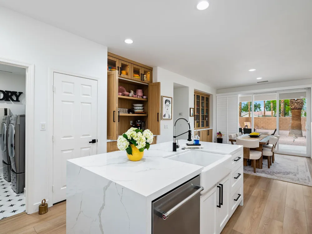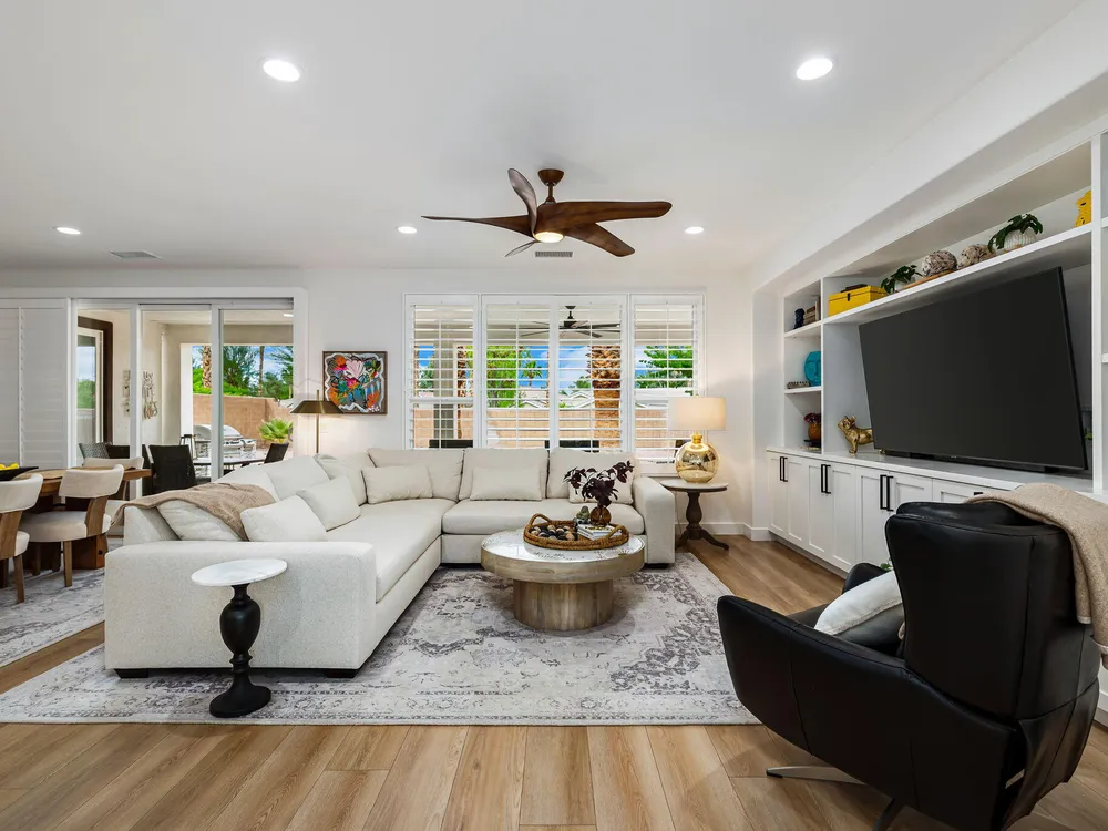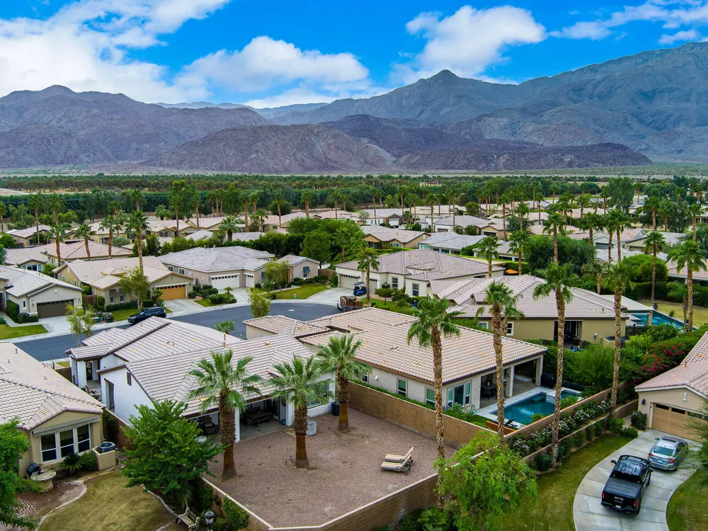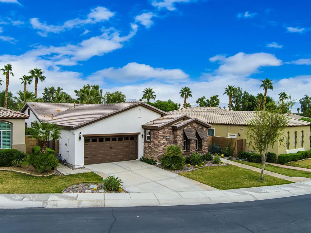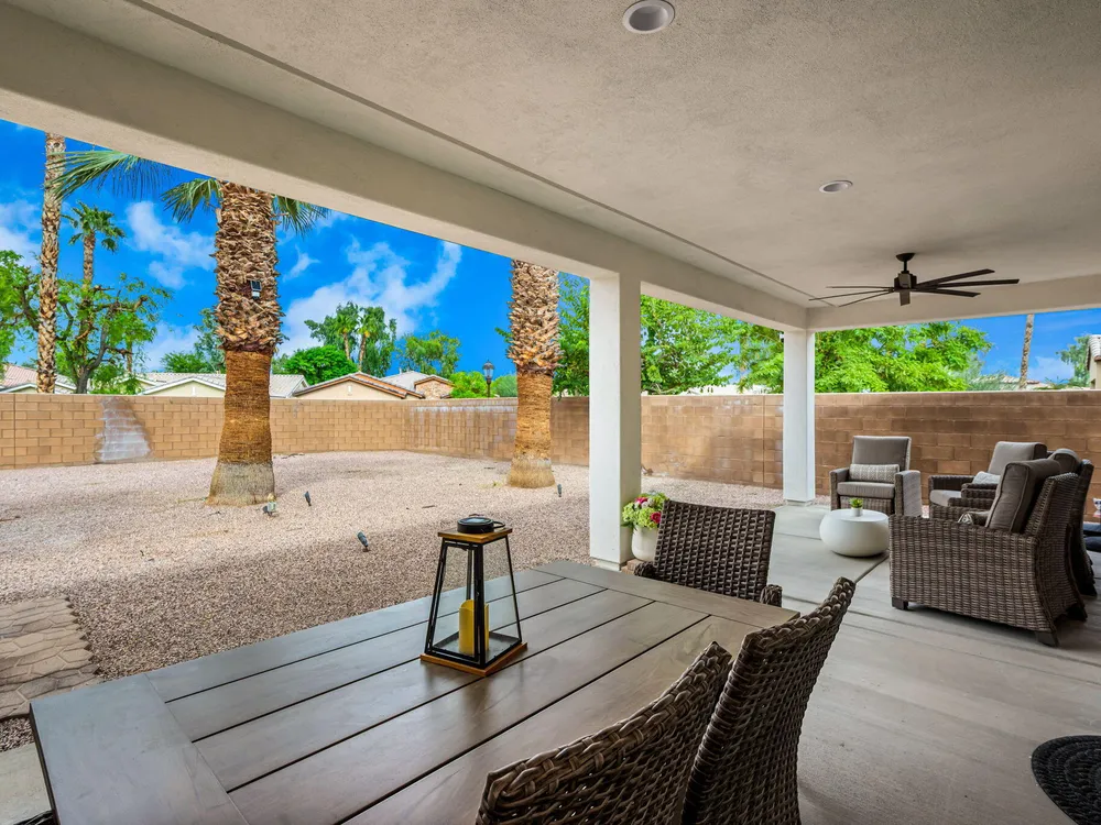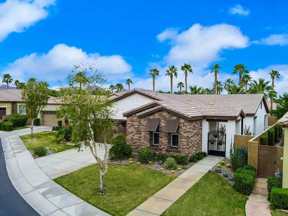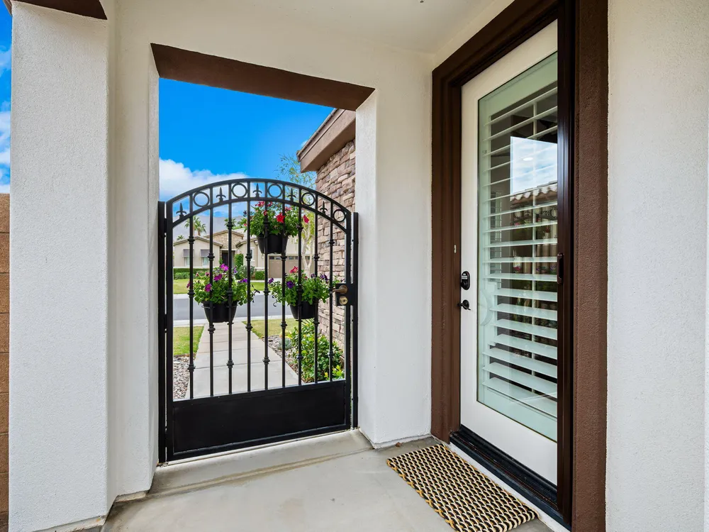 Absolutely stunning and meticulously upgraded, this sought-after Oasis plan is perfectly positioned on an oversized 8,276 sq. ft. homesite within the prestigious Trilogy La Quinta, a premier 55+ resort community. Featuring 3 bedrooms and 3 baths, this exceptional residence impresses with elegant quartz countertops throughout and a seamless blend of luxury and comfort. A charming Tuscan façade and wrought-iron privacy gate welcome you into a tranquil front courtyard, setting the tone for the refined interiors. Upgrades include all new LVP flooring, new landscaping in front and courtyard, fresh interior paint, paver path on side of home, all new window screens, added 21 can lights throughout and all new ceiling fans, including exterior. The great room showcases panoramic rear yard views, plantation shutters, custom built-in entertainment center, and stylish plank flooring, creating an inviting space for relaxation and entertaining. The gourmet kitchen is a showstopper, boasting stainless-steel appliances, white shaker cabinetry, waterfall-edge quartz island, designer backsplash, and custom coffee/beverage station with folding doors, farm sink, and illuminated glass uppers. The primary suite offers a peaceful retreat with bay window, patio access, and a spa-inspired bath featuring floor-to-ceiling tiled shower, dual vanities, and a generous walk-in closet. Guests will love the attached casita, complete with beverage center, mini-split A/C, built-in workstation, and private bath. Additional highlights include a four-foot extended garage with epoxy flooring, ample storage, and mini-split A/C. The expansive rear yard features an extended covered patio, concrete decking, and endless potential to create your own private pool or outdoor sanctuary—all while enjoying access to Trilogy's renowned Santa Rosa Clubhouse amenities. This home is a true desert gem—schedule your private tour today!
