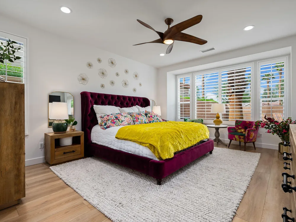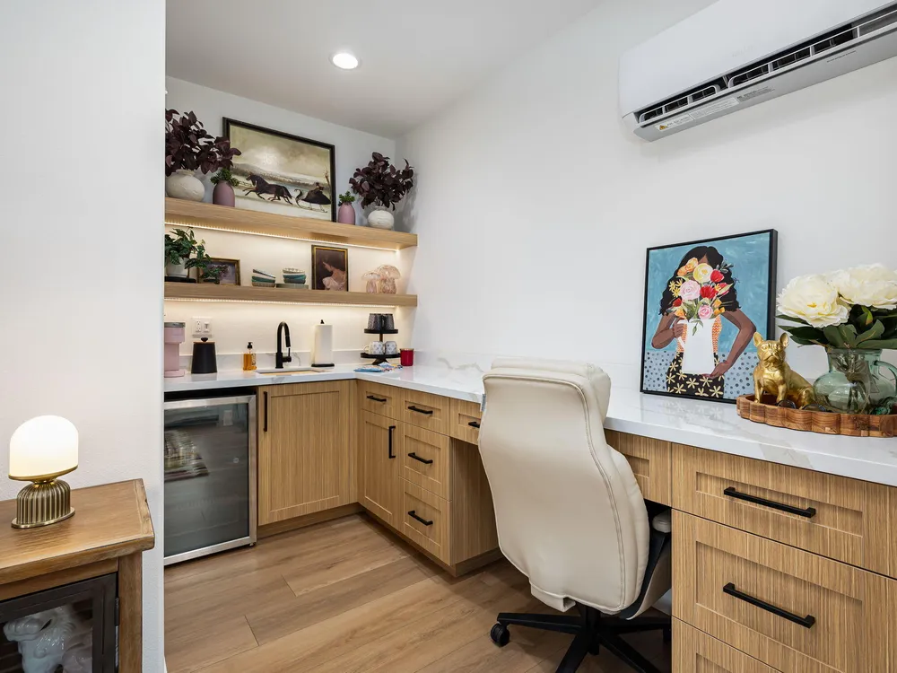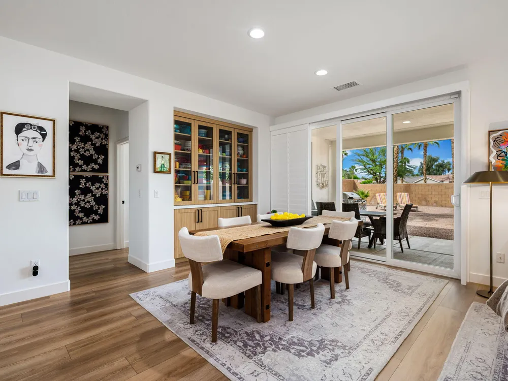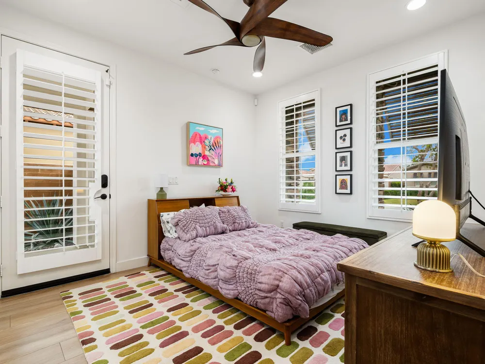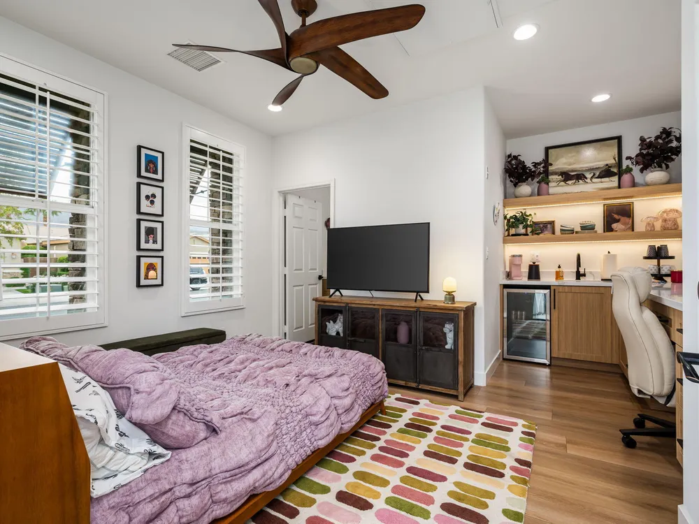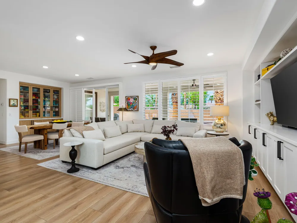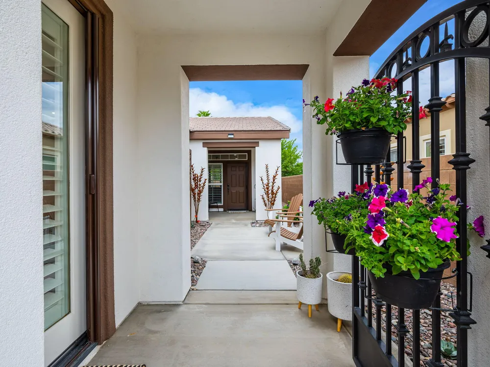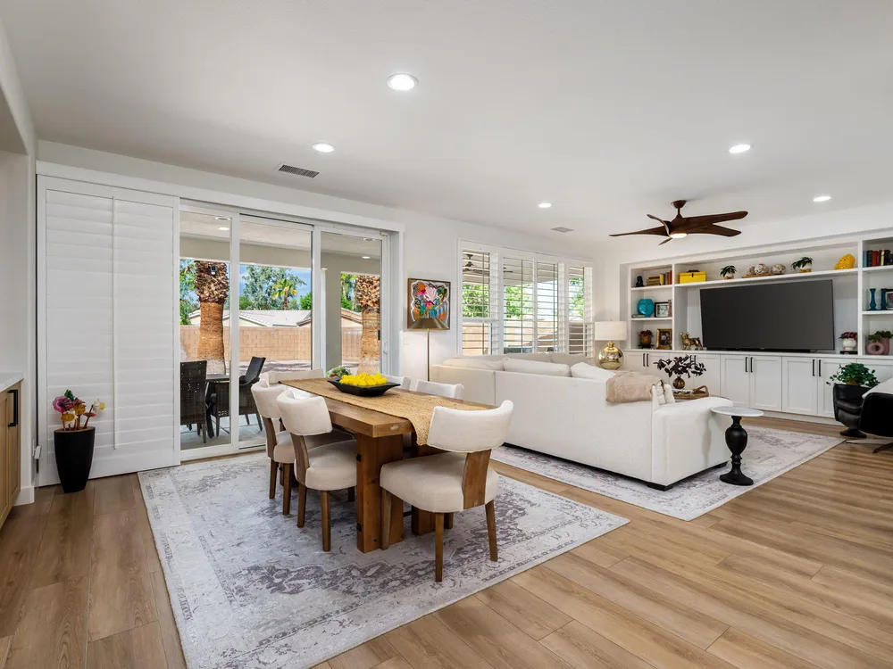 Absolutely stunning and meticulously upgraded, this sought-after Oasis plan is perfectly positioned on an oversized 8,276 sq. ft. homesite within the prestigious Trilogy La Quinta, a premier 55+ resort community. Featuring 3 bedrooms and 3 baths, this exceptional residence impresses with elegant quartz countertops throughout and a seamless blend of luxury and comfort. A charming Tuscan façade and wrought-iron privacy gate welcome you into a tranquil front courtyard, setting the tone for the refined interiors. Upgrades include all new LVP flooring, new landscaping in front and courtyard, fresh interior paint, paver path on side of home, all new window screens, added 21 can lights throughout and all new ceiling fans, including exterior. The great room showcases panoramic rear yard views, plantation shutters, custom built-in entertainment center, and stylish plank flooring, creating an inviting space for relaxation and entertaining. The gourmet kitchen is a showstopper, boasting stainless-steel appliances, white shaker cabinetry, waterfall-edge quartz island, designer backsplash, and custom coffee/beverage station with folding doors, farm sink, and illuminated glass uppers. The primary suite offers a peaceful retreat with bay window, patio access, and a spa-inspired bath featuring floor-to-ceiling tiled shower, dual vanities, and a generous walk-in closet. Guests will love the attached casita, complete with beverage center, mini-split A/C, built-in workstation, and private bath. Additional highlights include a four-foot extended garage with epoxy flooring, ample storage, and mini-split A/C. The expansive rear yard features an extended covered patio, concrete decking, and endless potential to create your own private pool or outdoor sanctuary—all while enjoying access to Trilogy's renowned Santa Rosa Clubhouse amenities. This home is a true desert gem—schedule your private tour today!