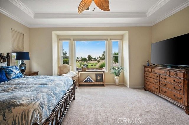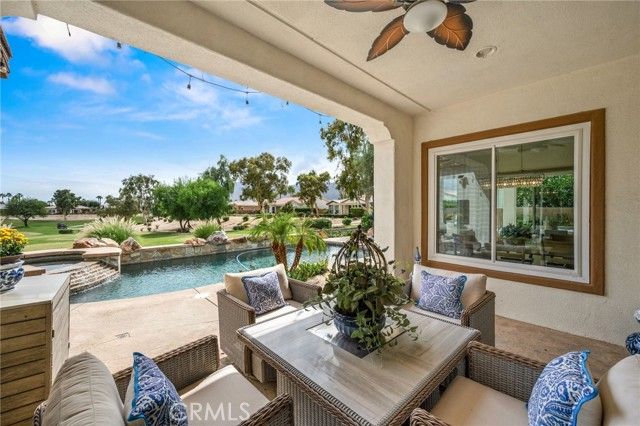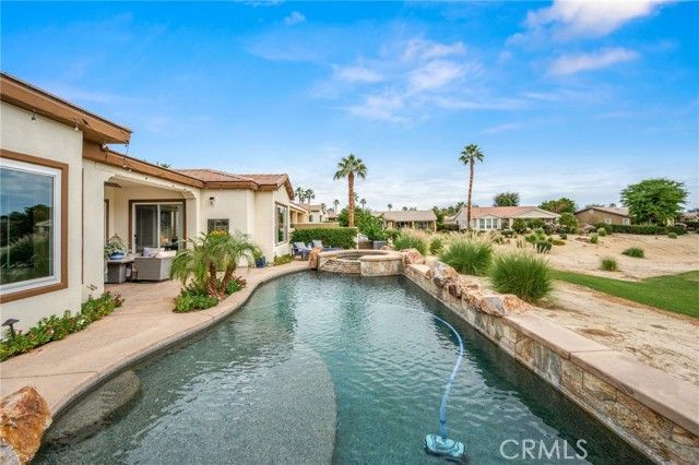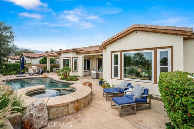 Premier Tamarisk model overlooking the 11th green of Trilogy Golf Club at La Quinta. This 2,724 sq. ft. home offers 4 bedrooms and 4 bathrooms, including a detached casita with private mini-split A/C, beverage center, and en-suite bath. Enter through a custom wood gate to a private courtyard, then into a bright great room with high ceilings, crown molding, arched doorways, and a fireplace showcasing golf course views. The chef’s kitchen features double ovens and a wine refrigerator, opening to a dining area with pool and fairway views. The south-facing backyard—highly sought after for its all-day sun—offers two covered patios and a resort-style pool and spa. The primary suite includes a spa-inspired bath with quartzite soaking tub, dual vanities, floor-to-ceiling tiled shower, and walk-in closet. Three-car garage with EV charging, workbench, and built-ins. HOA amenities include clubhouse, fitness center, pools, tennis, and pickleball.