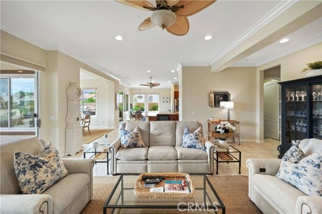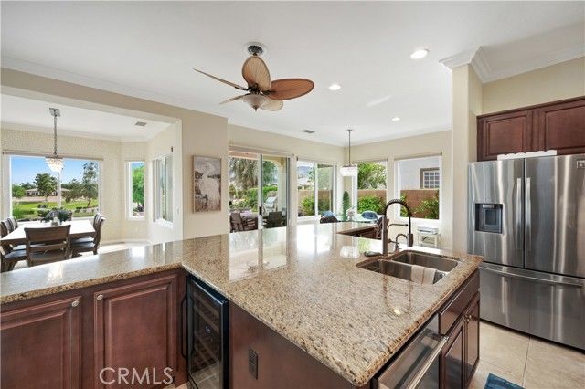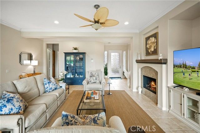 Premier Tamarisk model in an ideal position overlooking the 11th hole of Trilogy Golf Club at La Quinta. This 2,726 sq. ft. home offers 4 bedrooms and 4 bathrooms, including a detached casita with a private mini-split A/C, beverage center, and en-suite bath. Enter through a custom wood gate into a private courtyard, then into a bright great room with 10-foot ceilings, crown molding, arched doorways, a fireplace, and a wall of windows showcasing stunning golf course views. The chef’s kitchen features double ovens and a wine refrigerator, opening to a dining area with pool and fairway views. The south-facing backyard — highly sought after for its all-day sun — offers two covered patios, a resort-style pool and spa, and a built-in BBQ. The primary suite includes a spa-inspired bath with a quartzite soaking tub, dual vanities, a floor-to-ceiling tiled shower, and a walk-in closet. The owner has made extensive upgrades, including new HVAC, windows, a pool heater, and a freshly painted exterior (see supplements for full list). Three-car garage with EV charging, workbench, and built-ins. HOA amenities include a clubhouse, fitness center, pools, tennis, and pickleball.