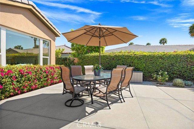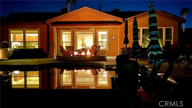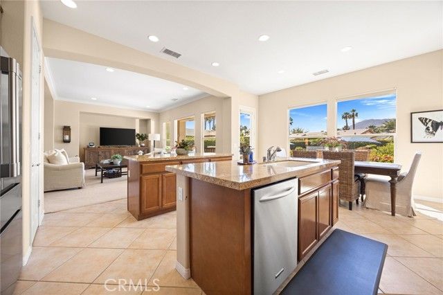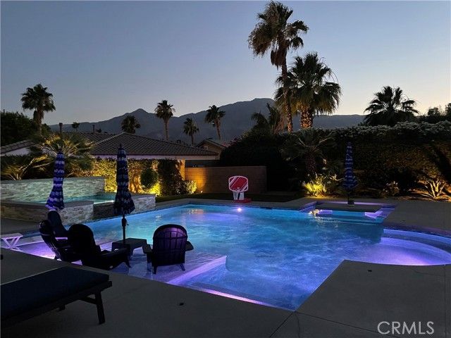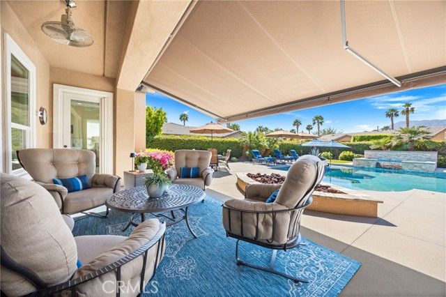 RESORT STYLE BACK YARD ON A PREMIUM LOT! MOUNTAIN VIEW! Located in the highly sought-after 55+ community of Trilogy at La Quinta, this reimagined Oreas floor plan is a true standout. The entry fireplace has been removed so the moment you step through the front door, you're welcomed by a wide-open great room that offers an immediate and breathtaking view of the resort-style backyard with mountains as the backdrop. The formal dining room has been thoughtfully enclosed and connected to the guest bathroom, providing another bedroom ideal for visitors. This versatile layout now features 3 bedrooms, a den/office off the entry, and a generous retreat off the primary suite—large enough to serve as a home office, gym, additional guest space or create a dream closet. High ceilings at 10 feet and 8-foot doors throughout enhance the sense of openness and luxury. Set on a premium lot, the backyard is your own private oasis. The saltwater pebble-finish pool and spa anchor a space designed for the ultimate in outdoor living. Enjoy a custom in-pool dining table, tanning ledge with lounge chairs, an in-pool curved conversation bench, a tranquil waterfall, and lush tropical landscaping. Enjoy shaded comfort under a covered patio with an added large retractable awning (with wind sensor), two ceiling fans, a built-in fire-pit, and natural gas BBQ hook up. The gourmet kitchen features double islands, pantry, granite countertops, stainless steel appliances, and a premium Wolf gas cooktop. The primary bedroom overlooks the backyard and mountains and has direct access to the back yard. Its en-suite bathroom includes dual vanities, a walk-in shower, walk-in closet, and a spacious retreat that can be converted to a golf cart garage or casita, if desired. As part of Trilogy at La Quinta, you’ll also enjoy a wealth of resort-style amenities, including a clubhouse, two on-site restaurants, a golf course, swimming pool, hot tub, a state-of-the-art fitness center with indoor walking track, a full-service spa with top-rated facials, pickleball, tennis, game room and so much more. Low HOA fee for the area with cable TV and internet included. No trash bill as it's covered in your property taxes. This one-of-a-kind home offers the best of desert living—comfort, elegance, and a lifestyle that feels like a permanent vacation. OPEN TO SELLING 80% FURNISHED, IF DESIRED.