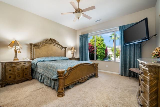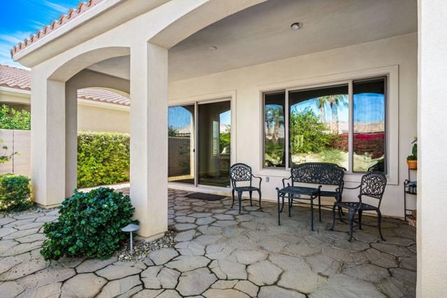 UNIQUE LANDSCAPING! Lovely rear patio WITH LIT WALKWAY PATH... Welcome to your dream desert oasis at 81850 Camino Cantos in Sun City Shadow Hills. This stunning single-family home offers the perfect blend of luxury and comfort, with 1,854 square feet of meticulously maintained living space. Step inside to discover an open floor plan featuring two spacious bedrooms with two beautifully appointed bathrooms. Let's not miss the separate bonus room which can easily function as a work area or just some additional comfortable living space. The interior boasts a combination of carpeting and tile floors that flow seamlessly throughout.The heart of this home is the gourmet kitchen, equipped with a gas stove, granite kitchen counters, an island kitchen, a pantry, and stainless steel appliances, making it a chef's delight. The master suite features a walk-in closet and a luxurious granite bathroom with double sinks and a relaxing soaking tub. A dedicated laundry room with gas dryer hook up add convenience to your daily routine.Step outside to your private garden oasis complete with a built-in barbecuea'a perfect setting for entertaining and enjoying the California sunshine. The home is equipped with central AC to keep you comfortable year-round, and a security patrol and gate provide peace of mind.Residents of this community enjoy an array of amenities including golf course, basketball court, billiards room, club house, bocce ball court, health club, on-site restaurant, and tennis courts.Embrace the lifestyle you've always dreamed of in this exceptional home. Schedule a showing today and make 81850 Camino Cantos your very own slice of paradise!Concrete with nighttime lighting.