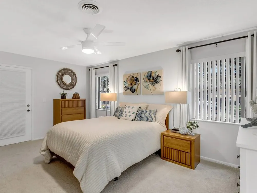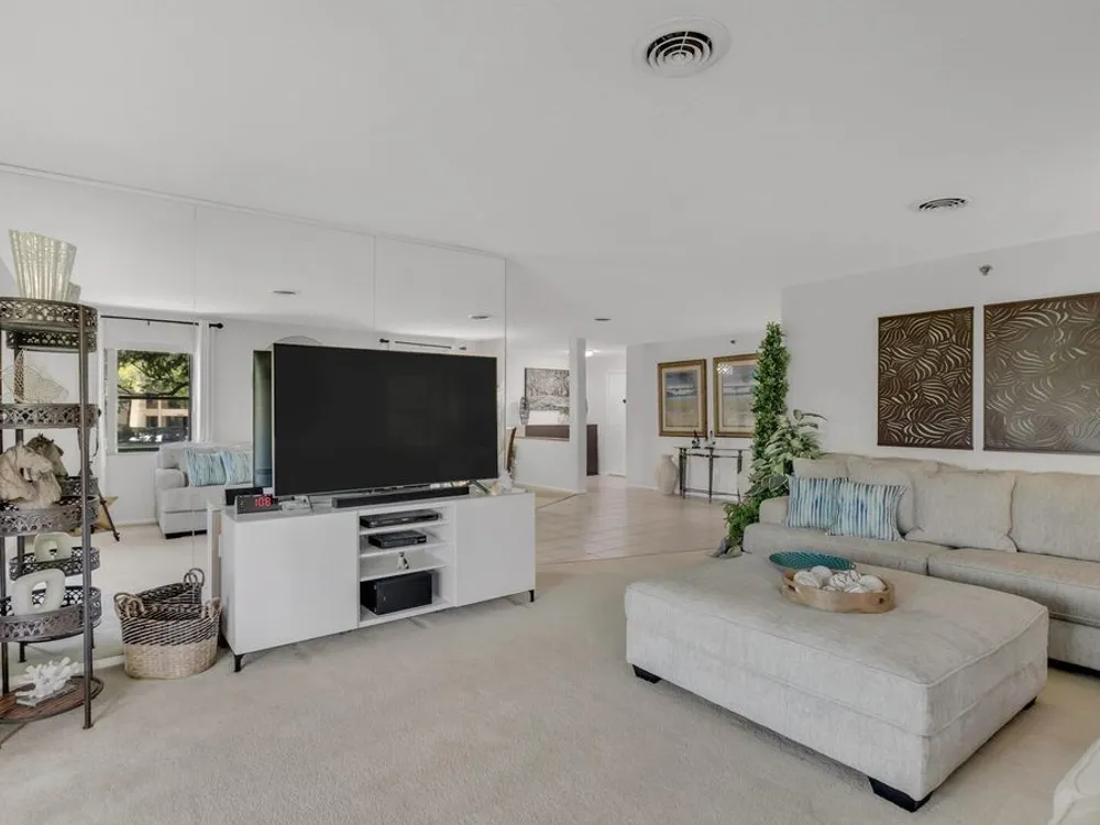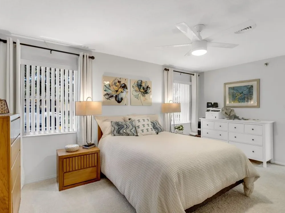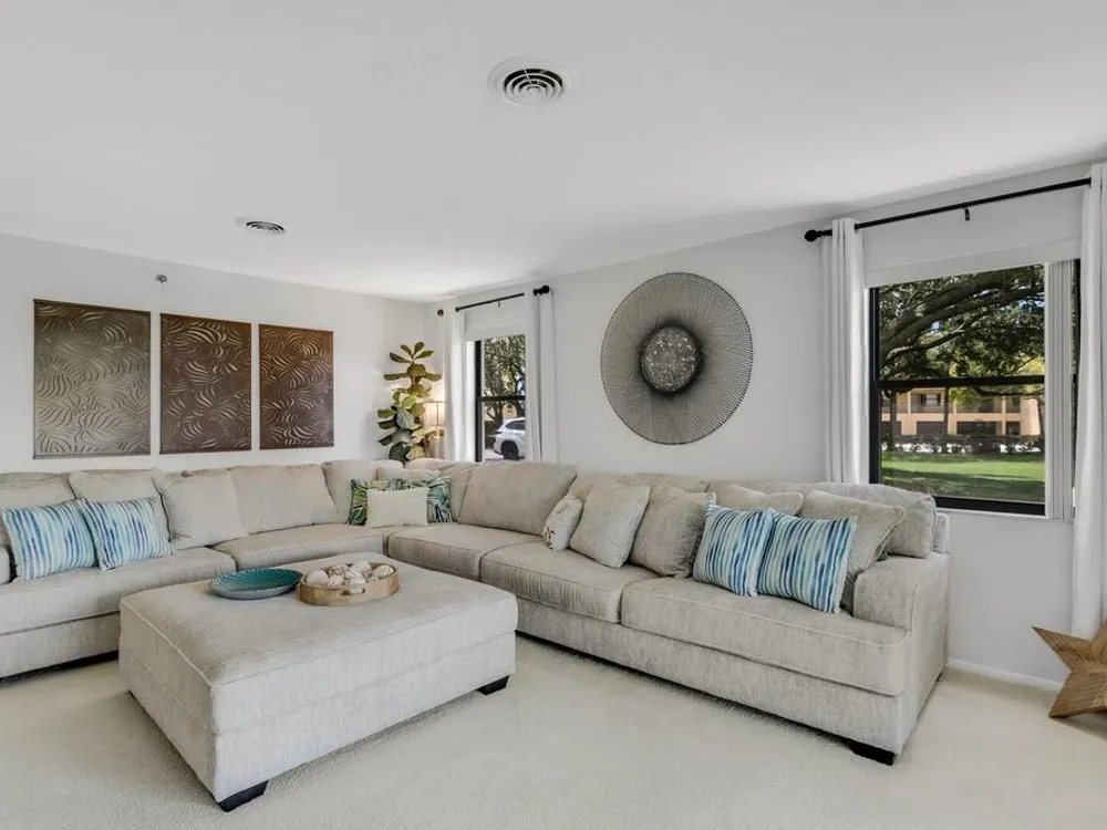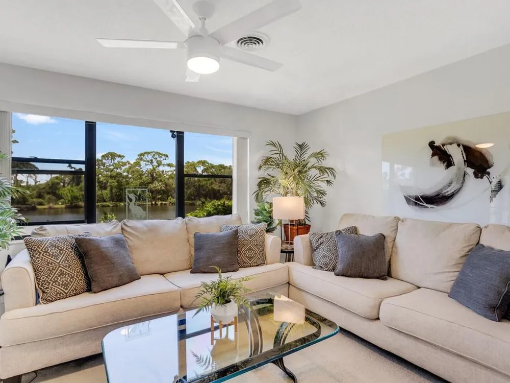 Don't Miss Out!! This is not your average condo – it’s a rare villa-style END UNIT with exceptional privacy, accessibility, and beauty. This FIRST FLOOR 2-bedroom, 2-bath WATERVIEW condo offers the comfort and feel of a villa, with plenty of room to accommodate guests. Owned by the same family since it was built and NEVER RENTED OUT, it has been meticulously cared for and filled with thoughtful details and an inviting layout. Enjoy the ease of DIRECT ACCESS FROM YOUR ASSIGNED CARPORT TO THE FRONT DOOR, the wheelchair assessable ramp allowing effortless entry with groceries and packages. A large foyer welcomes you into the home, leading to a formal dining room with mirrored wall and a spacious family room with tranquil pond views. The bright kitchen features white cabinets, a double sink, breakfast bar, closet pantry, and space for a petite table. Off the kitchen, a waterfront Florida room overlooks the serene pond and opens via a French door, to the BACK SCREENED PATIO—ideal as a four-season retreat. The primary suite boasts a WALK-IN CLOSET, private access to the FRONT PORCH, and en suite bath with a dressing area, shower stall and separate tub. The second bedroom offers a full-wall closet, and the hall bath includes a tub/shower combo. The laundry room with ample cabinetry and a laundry tub adds convenience. The front porch opens to the parking lot for easy entry and doubles as an extra storage space. This eliminates the need for stairs or an elevator, and a convenient wheelchair accessible ramp is also provided. Other perks include: NEW A/C in '25 as well as NEW interior paint, ceiling fans and lighting throughout. This home CAN BE SOLD FURNISHED, ready for you to move right in! Located in a 55+ community offering RESORT STYLE AMENITIES, including 6 pools (5 heated), tennis and pickleball courts, walking trails, fitness center, billiard room, and multiple community centers. High Speed Internet and Cable with streaming channels (HBO Max, Paramount, Peacock Premium, AMC+, Disney + HULU, Tennis Channel) are all included! This well maintained community is located minutes from the intercoastal and 15 minutes to Redington Beach, Madeira Beach, and Treasure Island.
