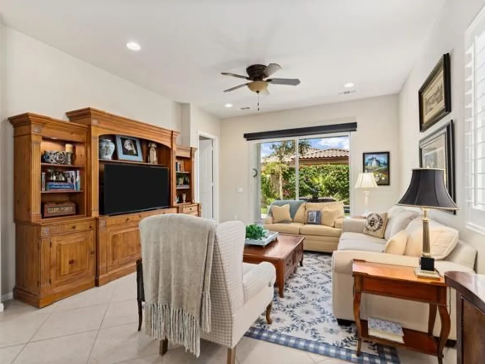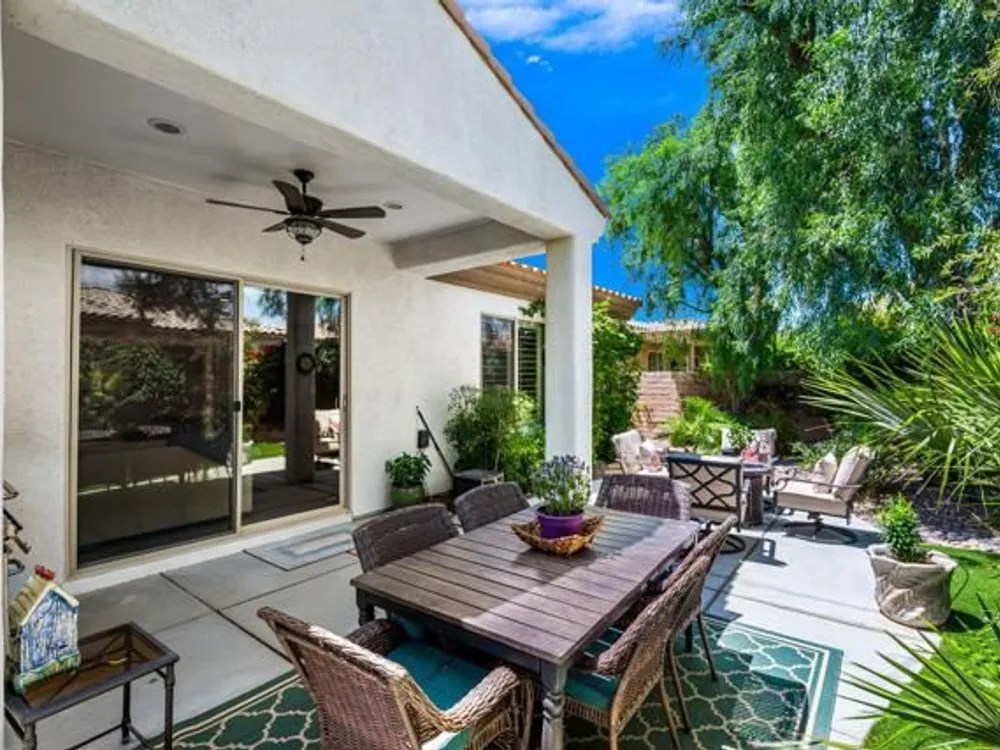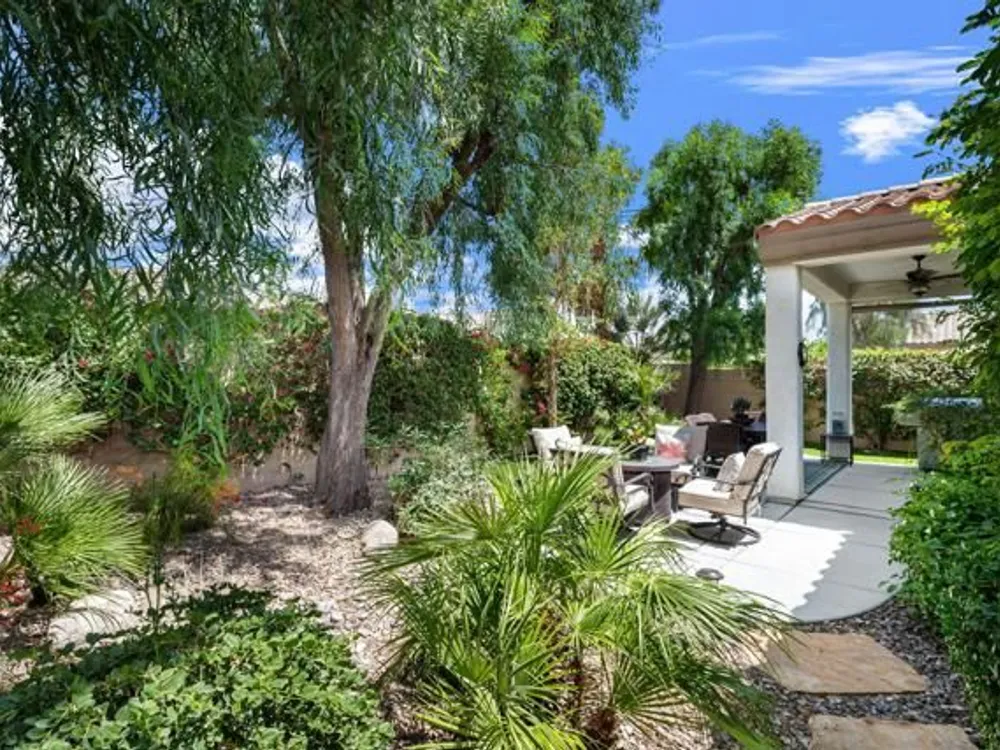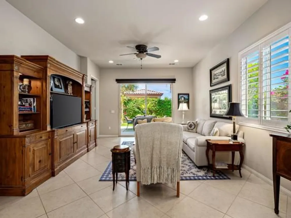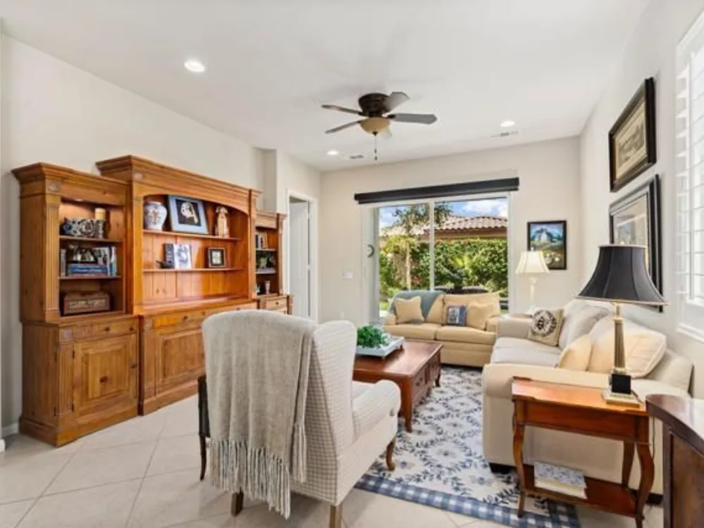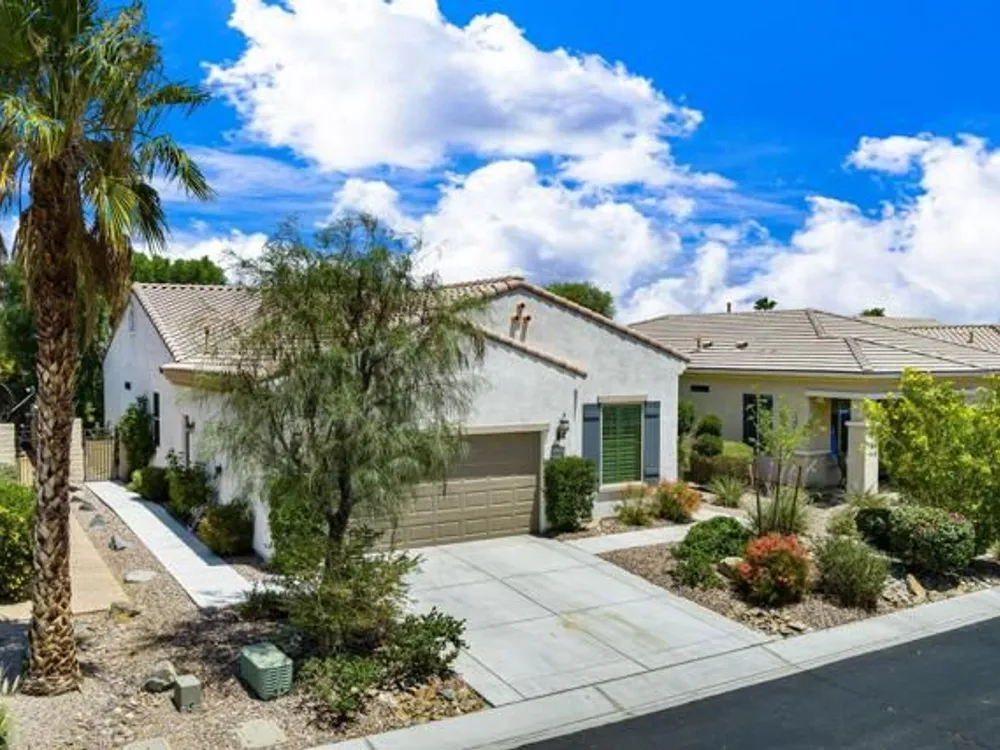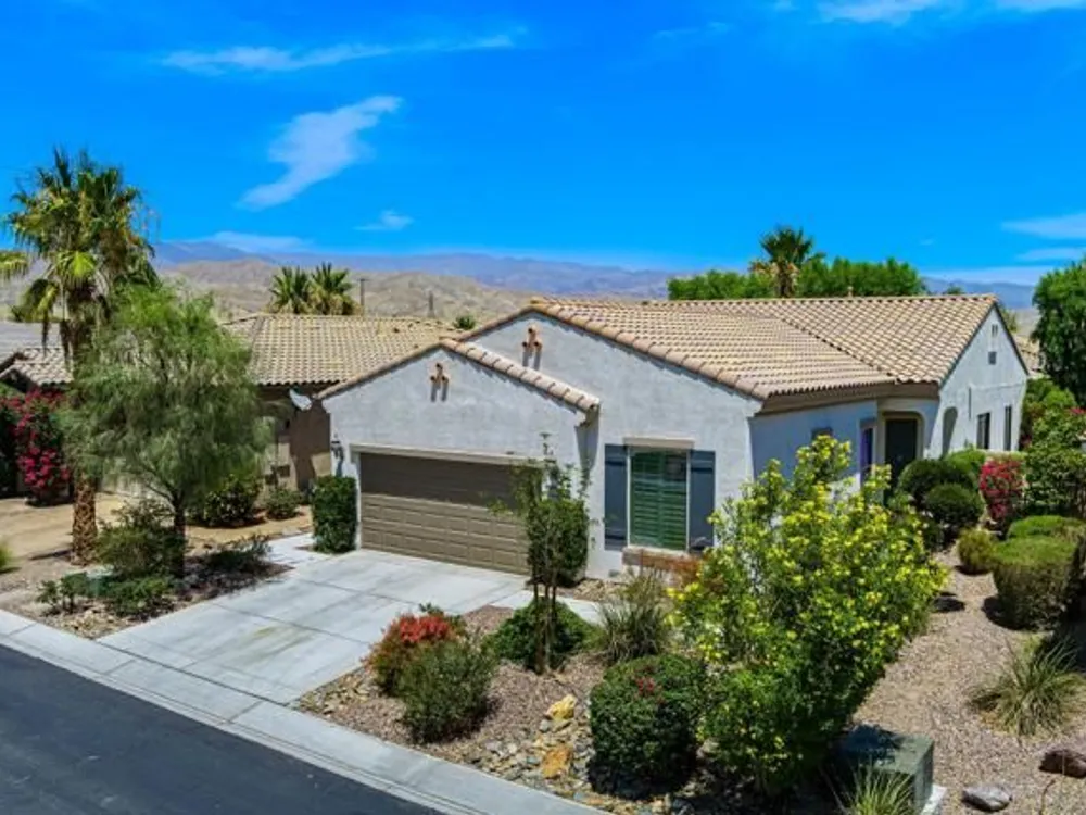 Located in the coveted 55+ neighborhood of Sun City Shadow Hills, this stunning 3-BEDROOM, 2-bath home offers the perfect blend of comfort, style, and function. The open-concept Inspiration floor plan features high ceilings, abundant natural light, and elegant wood-finish cabinetry throughout. A chef's kitchen shines with granite slab counters, stainless steel appliances, custom backsplash, and a built-in wine cooler. The primary bedroom with en-suite bath includes a CUSTOMIZED CLOSET while the guest rooms (one with an en-suite bath) are thoughtfully separated for privacy. Upgrades include PLANTATION WOOD SHUTTERS, designer lighting, diagonal-set tile flooring, plush bedroom carpet, ceiling fans, and a REMOTE SOLAR SHADE at the patio slider. Step outside to a private backyard oasis with covered and open patios, lush lawn, mature landscaping, and a drip system for easy care. The EXTENDED GARAGE offers GOLF CART SPACE and storage cabinets. The laundry room includes upper and lower cabinets and Electrolux washer and dryer. QUALITY FURNISHINGS and GOLF CART negotiable outside of escrow. Enjoy world-class amenities including golf, pools, fitness centers, and social clubs. Low HOA fees also include Internet access, security and use of the Clubhouse. Live the lifestyle you deserve--schedule your showing today!
