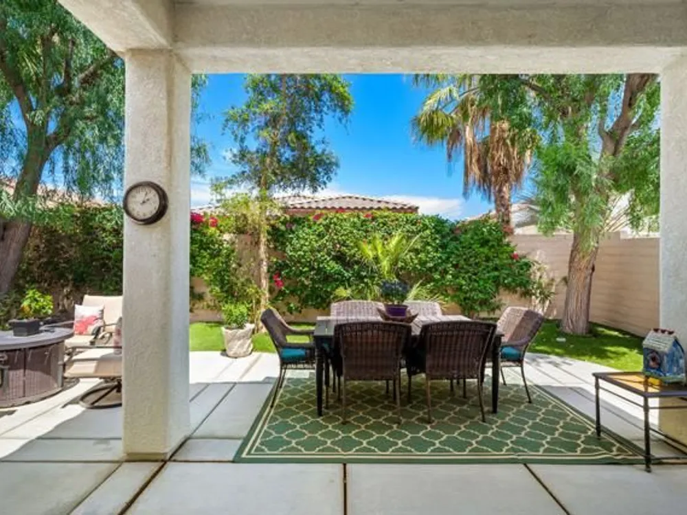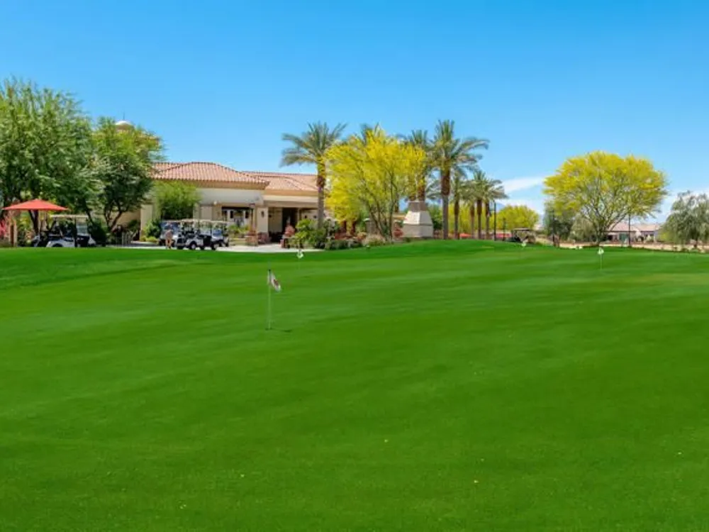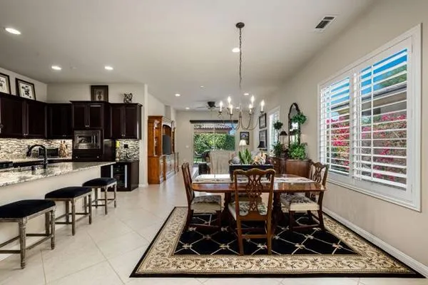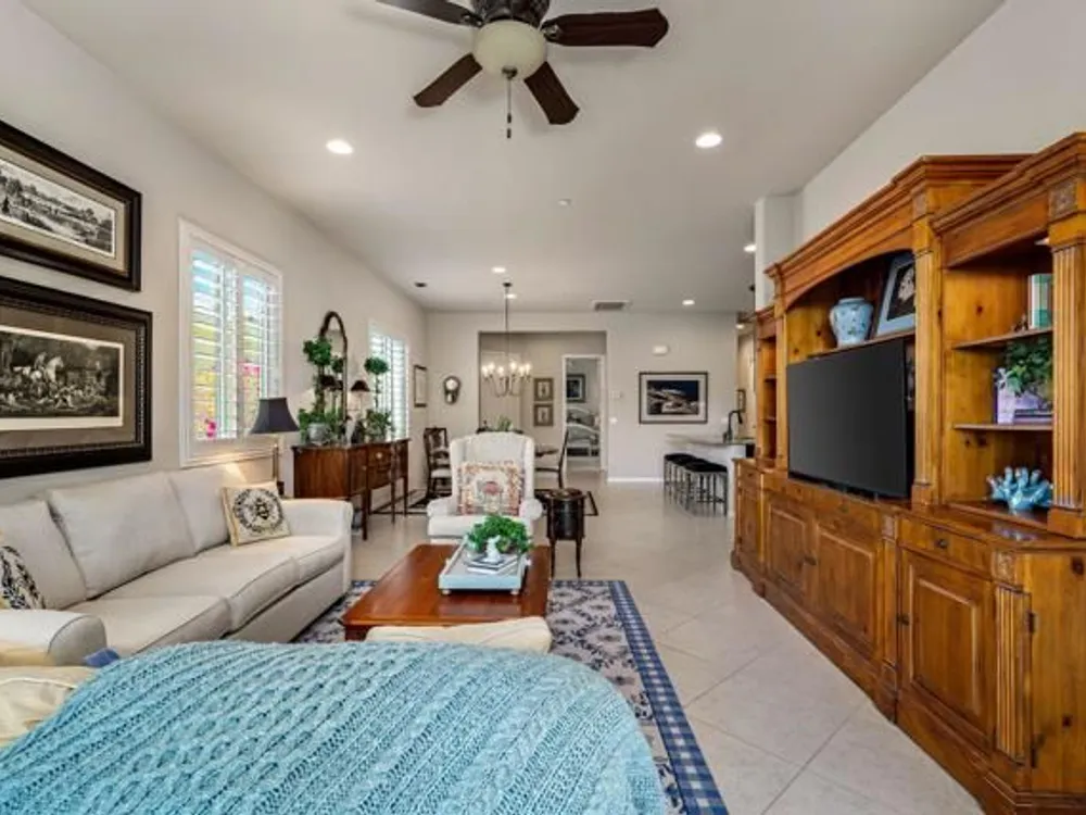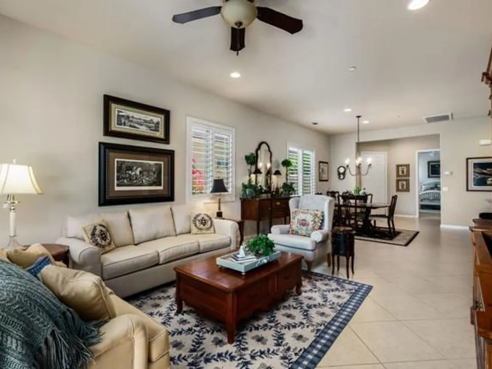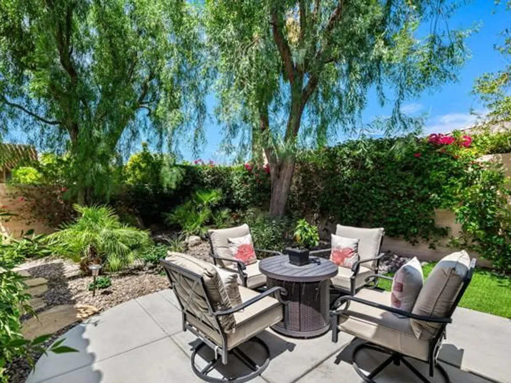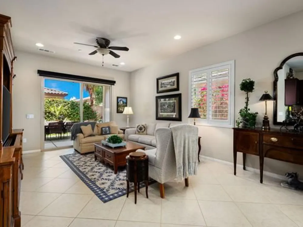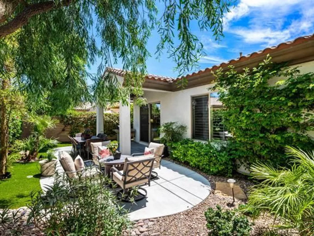 Located in the coveted 55+ neighborhood of Sun City Shadow Hills, this stunning 3-BEDROOM, 2-bath home offers the perfect blend of comfort, style, and function. The open-concept Inspiration floor plan features high ceilings, abundant natural light, and elegant wood-finish cabinetry throughout. A chef's kitchen shines with granite slab counters, stainless steel appliances, custom backsplash, and a built-in wine cooler. The primary bedroom with en-suite bath includes a CUSTOMIZED CLOSET while the guest rooms (one with an en-suite bath) are thoughtfully separated for privacy. Upgrades include PLANTATION WOOD SHUTTERS, designer lighting, diagonal-set tile flooring, plush bedroom carpet, ceiling fans, and a REMOTE SOLAR SHADE at the patio slider. Step outside to a private backyard oasis with covered and open patios, lush lawn, mature landscaping, and a drip system for easy care. The EXTENDED GARAGE offers GOLF CART SPACE and storage cabinets. The laundry room includes upper and lower cabinets and Electrolux washer and dryer. QUALITY FURNISHINGS and GOLF CART negotiable outside of escrow. Enjoy world-class amenities including golf, pools, fitness centers, and social clubs. Low HOA fees also include Internet access, security and use of the Clubhouse. Live the lifestyle you deserve--schedule your showing today!