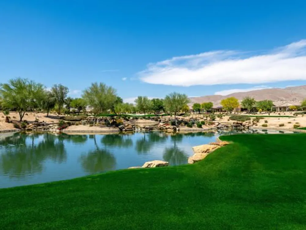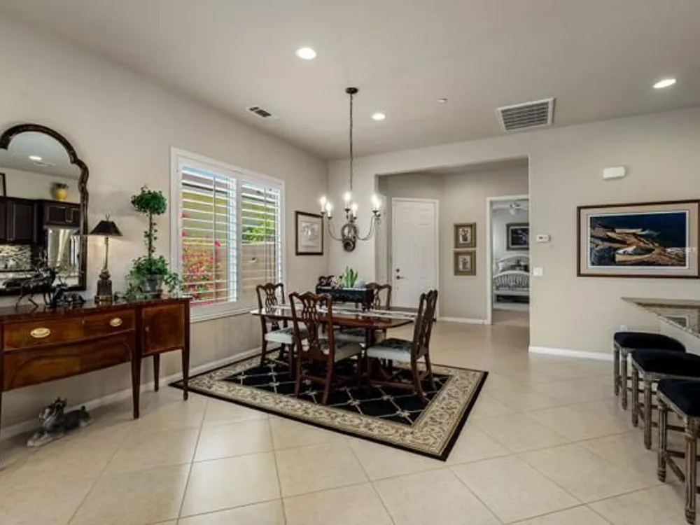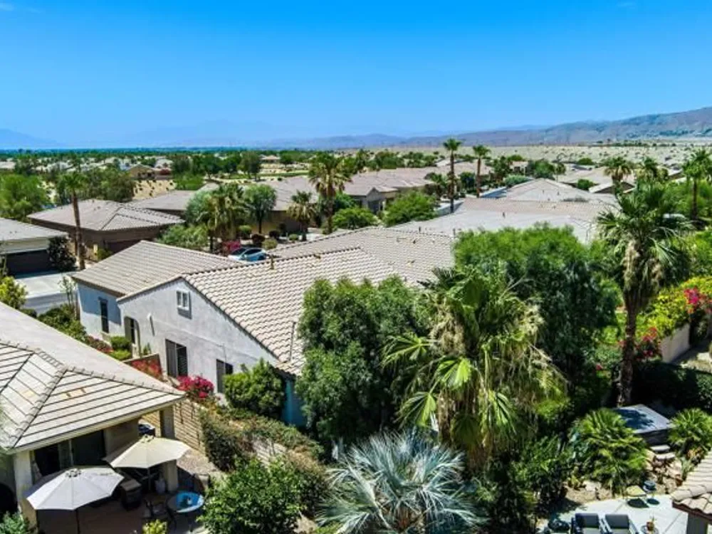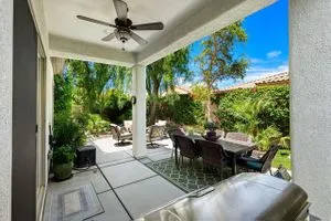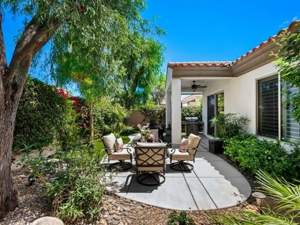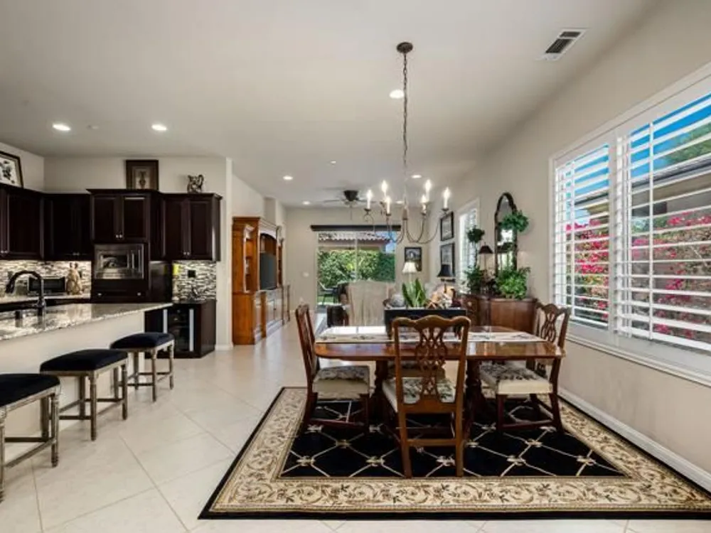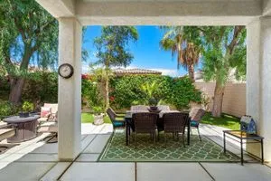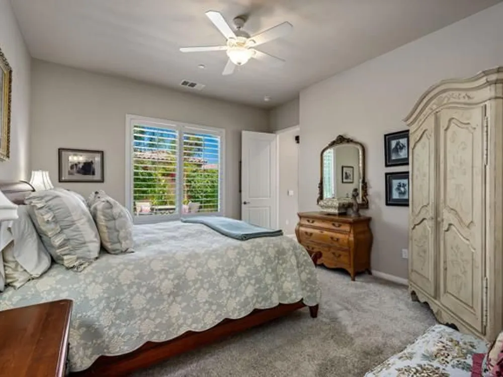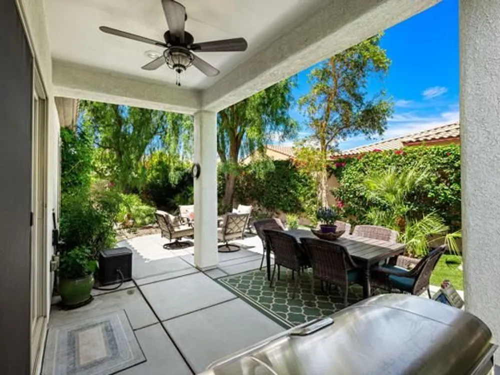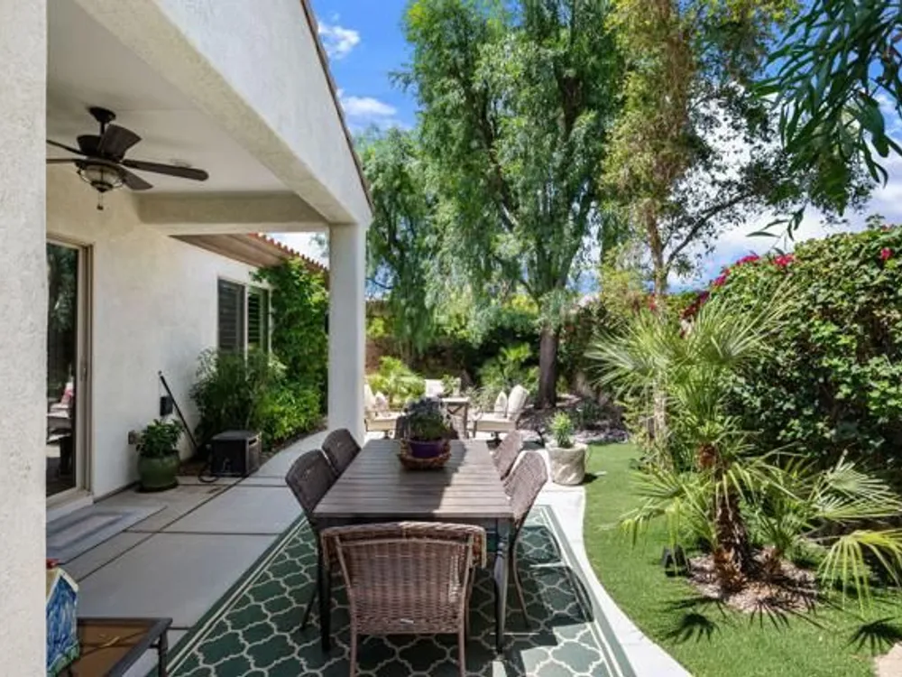 Located in the coveted 55+ neighborhood of Sun City Shadow Hills, this stunning 3-BEDROOM, 2-bath home offers the perfect blend of comfort, style, and function. The open-concept Inspiration floor plan features high ceilings, abundant natural light, and elegant wood-finish cabinetry throughout. A chef's kitchen shines with granite slab counters, stainless steel appliances, custom backsplash, and a built-in wine cooler. The primary bedroom with en-suite bath includes a CUSTOMIZED CLOSET while the guest rooms (one with an en-suite bath) are thoughtfully separated for privacy. Upgrades include PLANTATION WOOD SHUTTERS, designer lighting, diagonal-set tile flooring, plush bedroom carpet, ceiling fans, and a REMOTE SOLAR SHADE at the patio slider. Step outside to a private backyard oasis with covered and open patios, lush lawn, mature landscaping, and a drip system for easy care. The EXTENDED GARAGE offers GOLF CART SPACE and storage cabinets. The laundry room includes upper and lower cabinets and Electrolux washer and dryer. QUALITY FURNISHINGS and GOLF CART negotiable outside of escrow. Enjoy world-class amenities including golf, pools, fitness centers, and social clubs. Low HOA fees also include Internet access, security and use of the Clubhouse. Live the lifestyle you deserve--schedule your showing today!