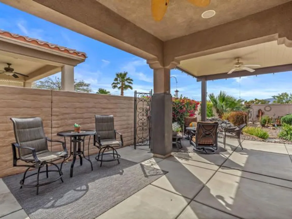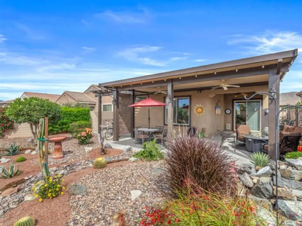 Beautifully appointed and popular Montoya plan in Sun City Shadow Hills C.C. This TURNKEY FURNISHED 2 bedroom, 2 bath PLUS DEN home (den being used as bedroom 3) features a leaded glass entry door with Invisa screen, plantation shutters, slab granite kitchen counters, stainless steel appliances, recently REPLACED A/C & FURNACE, pendant lighting, custom built-in shelving in the eating area, crown moldings, tall baseboards, large diagonal tile and luxury vinyl flooring throughout. The oversized SOUTH FACING rear yard with extensive concrete decking and sidewalk has attractive low maintenance desert landscaping and plenty of room for entertaining or to add your own pool. It also features an extended solid aluminum patio cover with fans, lighting and outlets which provides ample room for lounging and taking in the great mountain views! Additional features include, recent inside & outside painting, new mirrors and lighting in the bathrooms, Tankless water heater, laundry sink, surround sound speakers, LED lighting, designer ceiling fans and an oversized garage with loads of storage cabinets. A real gem of a find and located in Sun City Shadow Hills popular and Phase 3. Featuring both a full size 18 hole and a 18 hole par three golf course, Two clubhouses, 10 pickleball courts, tennis courts, fitness center, indoor & outdoor pools, basketball, Bocci courts, restaurant, billiards room, card rooms, social clubs and more.