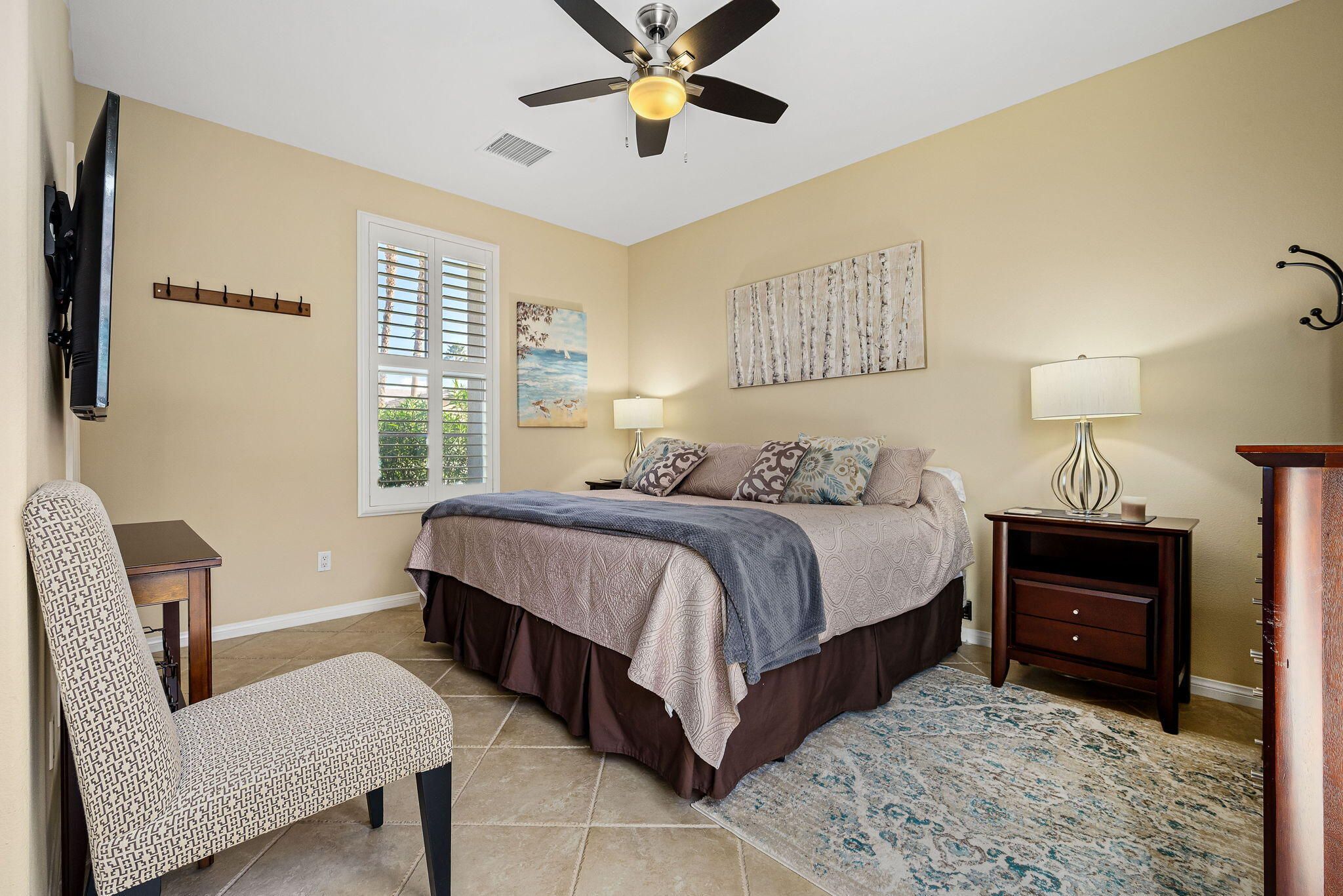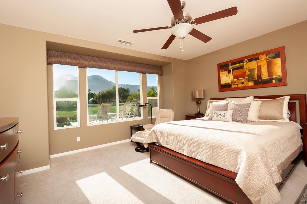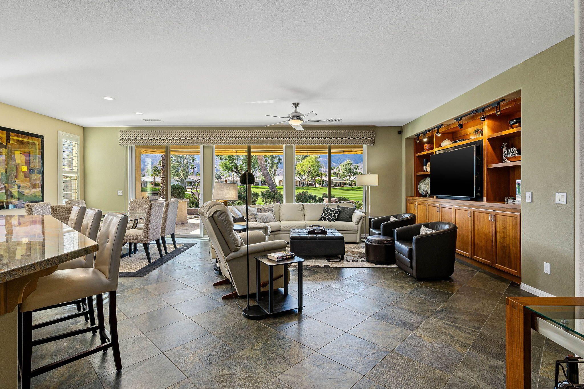 A rare Trilogy at La Quinta Monterey w/Casita premium golf course property prized for its breathtaking 180-degree mountain and 14th fairway views. The firepit, BBQ Station and raised patio captures mountain views, and daily live golf action. It's being sold fully furnished with a golf cart. Once inside, you're captivated by the immense mountain and golf course views. The great room features 9' ceilings, custom slate floors, superior quality built-in entertainment center with custom lighting. The kitchen is a cooks dream featuring stainless appliances, solid wood cabinets, loads of counter space, a large center island, and backsplash wrapped in rich slab granite. The large dining area with direct access to the kitchen and the covered outdoor patio is perfect for entertaining. Custom stone pavers, built-in barbecue station and raised patio with custom lighting is perfect for relaxing or dining out day or night, and the shimmering orange glow of the large rock firepit keeps you warm and cozy on cool winter evenings. The spacious primary bedroom suite offers amazing views of the mountains. The bath features dual vanities and custom stone surround in the shower and large walk-in closet. The main home guest bedroom is roomy and the second full bathroom also features a stone surround shower. The office features plantation shutters and custom solid wood desk and built-ins. A two car garage features tall cabinet custom storage and air conditioner.