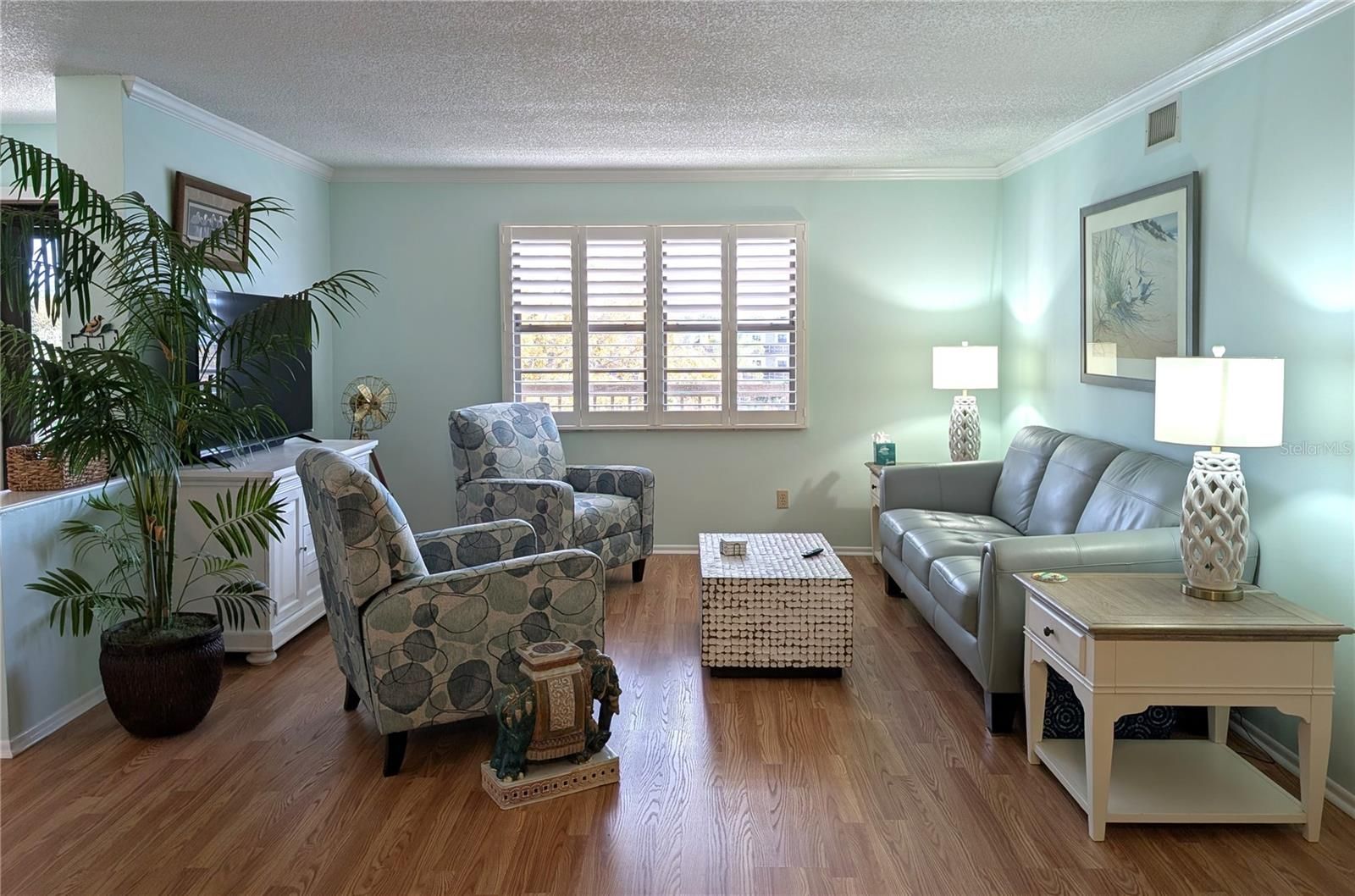 - Ceiling Fan(s), Crown Molding, Living/Dining Room, Main Level Primary, Thermostat, Walk-In Closet(s), Window Treatments