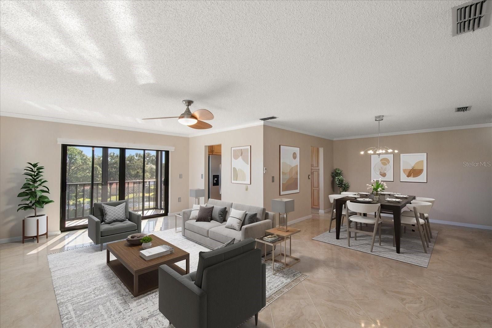 - Ceiling Fan(s), L-Shaped Dining Room, Living/Dining Room, Open Floorplan, Stone Counters, Thermostat, Walk-In Closet(s), Window Treatments