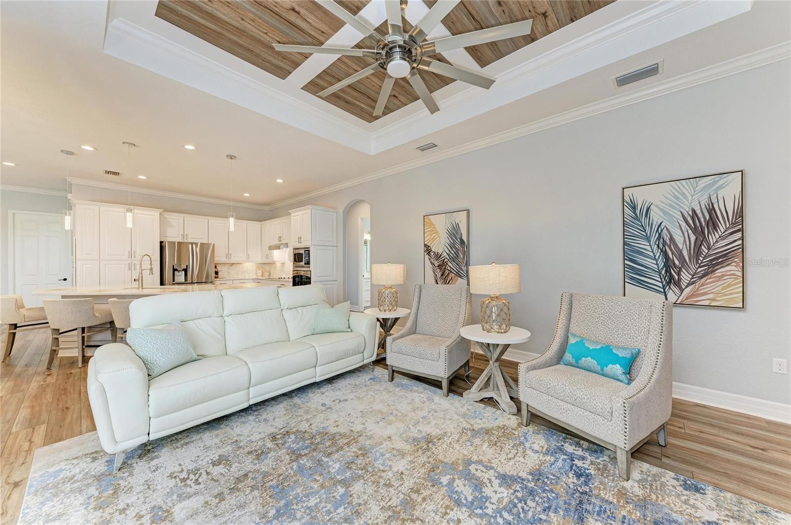 - Ceiling Fan(s), Coffered Ceiling(s), Crown Molding, Dry Bar, Eat-in Kitchen, Kitchen/Family Room Combo, Open Floorplan, Solid-Wood Cabinets, Stone Counters, Thermostat, Tray Ceiling(s), Walk-In Closet(s), Window Treatments