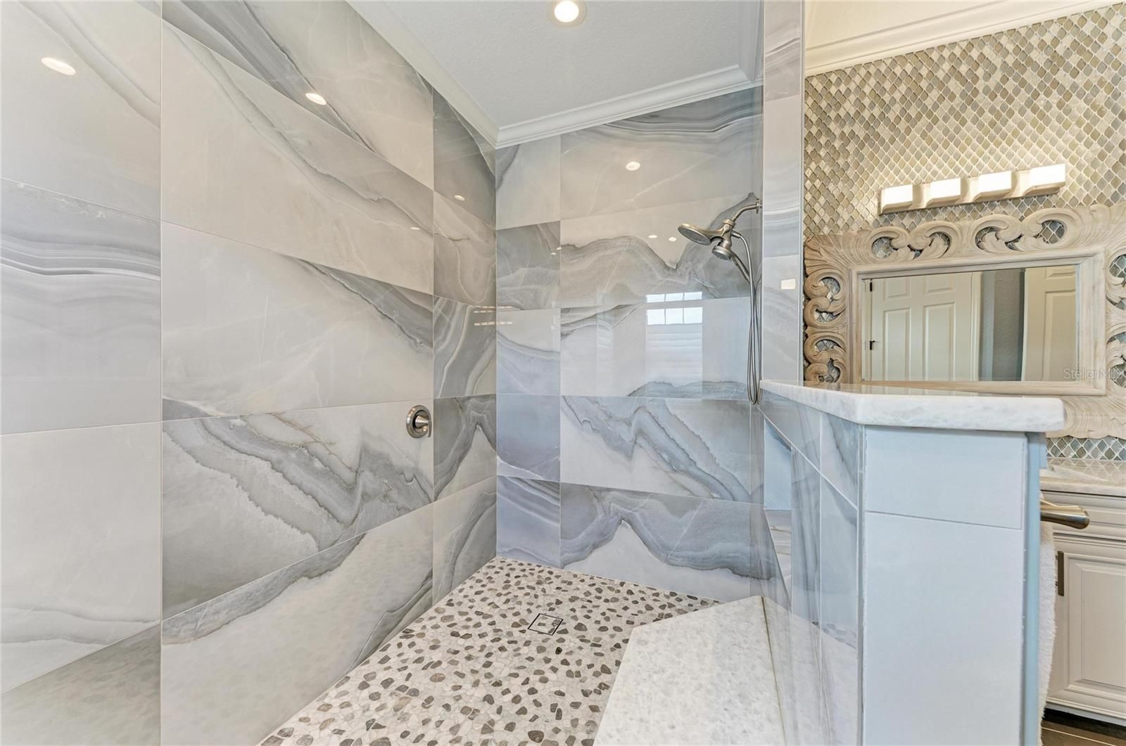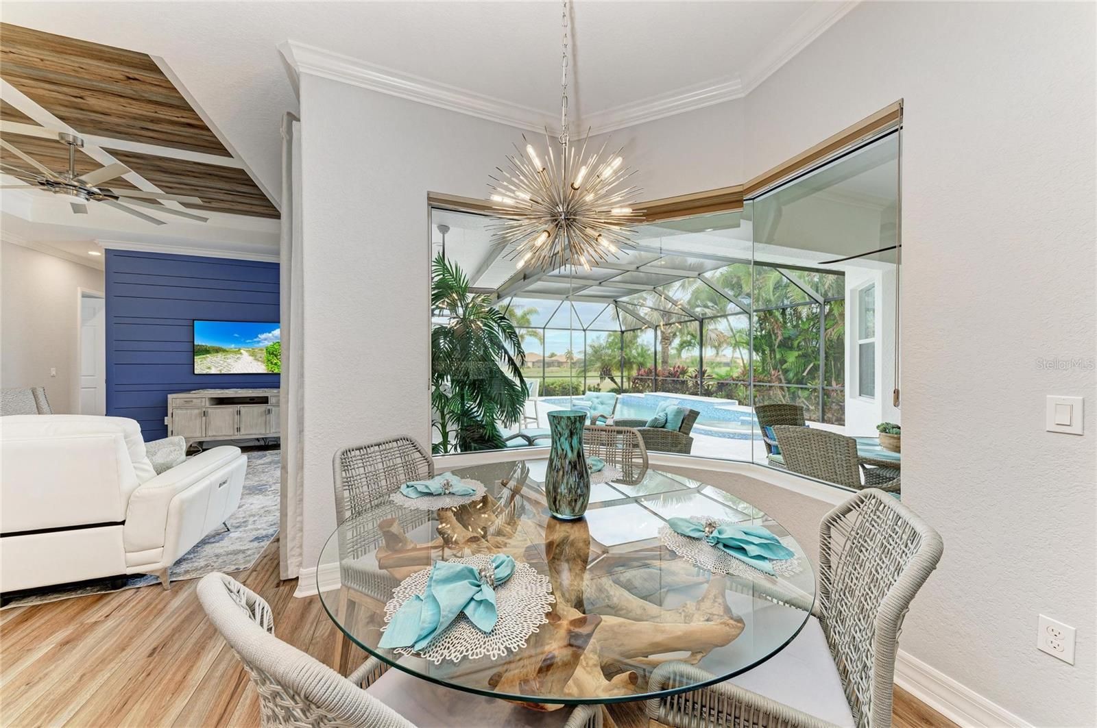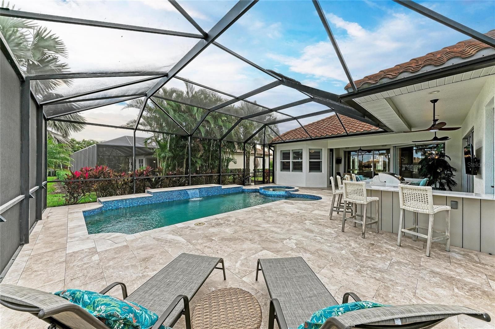 A truly remarkable, one-of-a-kind estate residence awaits in the exclusive, gated resort community of River Strand Golf & Country Club. Thoughtfully designed with over $230,000 in HIGH-END UPGRADES AND PROFESSSIONAL INTERIOR DESIGN, this extraordinary home commands attention from its prominent oversized corner lot and delivers an elevated lifestyle at every turn. Inside, the traditional floor plan has been masterfully reimagined. The wall once separating the dining room and kitchen has been removed, creating an open, sophisticated flow. A stylish office now graces the entry, while the former formal living area has been transformed into an impressive grand dining salon, complete with a chic dry bar—perfect for elegant entertaining. The chef’s kitchen is a showpiece, boasting brand-new custom cabinetry, counter-height quartz surfaces, and a beautifully designed pantry. Offered FURNISHED, this residence exudes luxury with custom lighting, designer feature walls, and quartz finishes carried through every guest bath. The primary suite is a true retreat, offering direct lanai access, a generous walk-in with a fully customized closet system, and a spa-inspired bath featuring a makeup vanity, new sinks and counters, statement mirrors, and a one-of-a-kind shower. Throughout the home, wide-plank luxury vinyl adds warmth and sophistication. Step outside to the gorgeous lanai designed for true resort-style living. A heated saltwater pool and spa with tanning ledge sits atop pristine travertine pavers, while a brand-new custom outdoor kitchen—complete with built-in grill, beverage cooler, and bar—invites effortless entertainment. All of this is framed by the beautiful golf and water views that River Strand is known for creating your own serene retreat! Additional upgrades include full interior and exterior paint, custom window treatments and blinds, and an enhanced three-car garage featuring epoxy flooring and custom cabinetry. Three beautifully appointed guest suites and two full guest baths—one serving as a convenient pool bath—ensure comfort for all. River Strand itself is a crown jewel, offering 27 holes of championship golf, a refined CLUBHOUSE with fine dining and a grille room, two resort pools with spas, six satellite pools, dual fitness centers, exceptional tennis and pickleball facilities and numerous social and fitness events and activities. The club is currently undergoing a multi-million-dollar transformation, promising refreshed amenities including an enhanced clubhouse, expanded pool and tiki bar dining, and elevated outdoor dining. Perfectly located just minutes from I-75, The Marketplace with Costco, Target and an exciting lineup of new restaurants and shops. All this and close to the stunning beaches of Florida’s Gulf Coast. You will love calling this your next home, once you experience River Strand at its best, you may never want to leave!