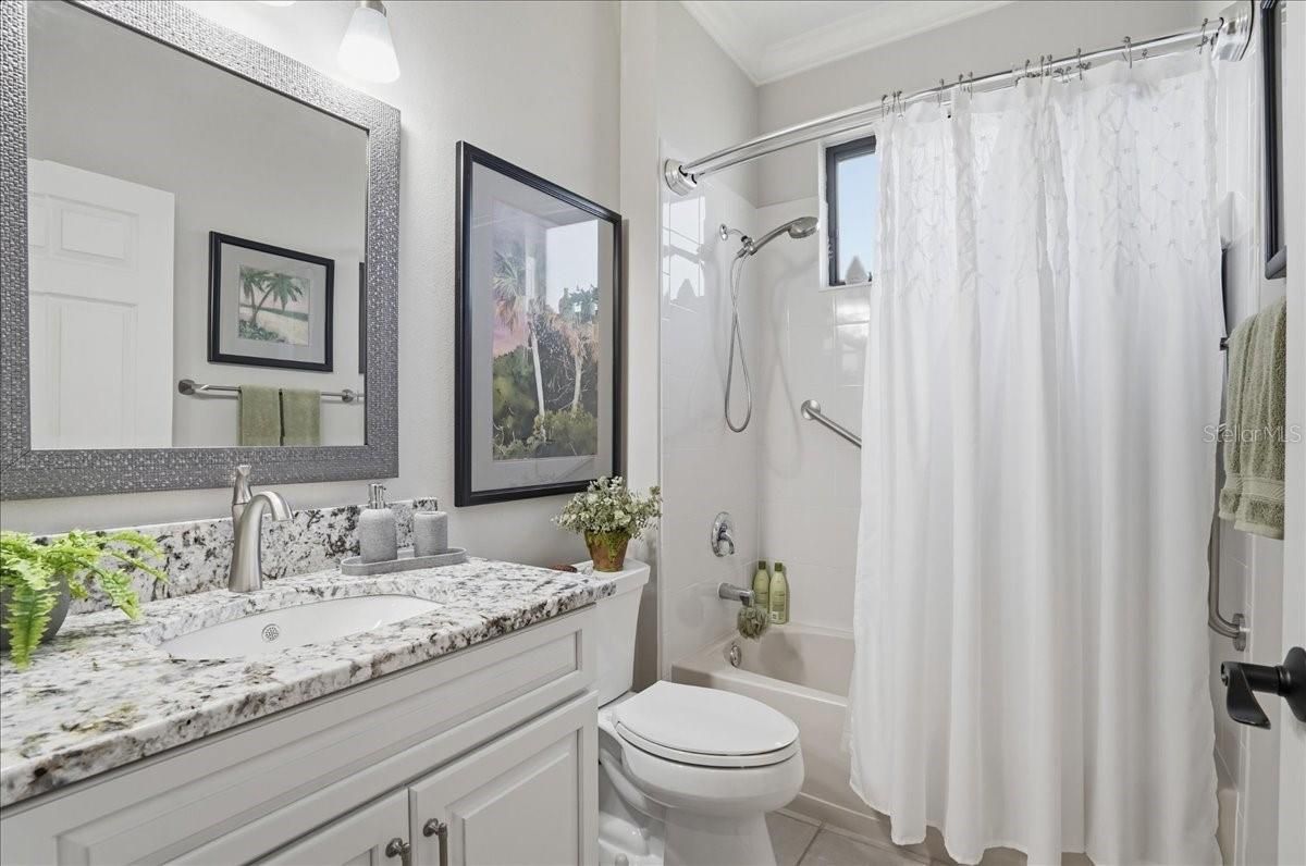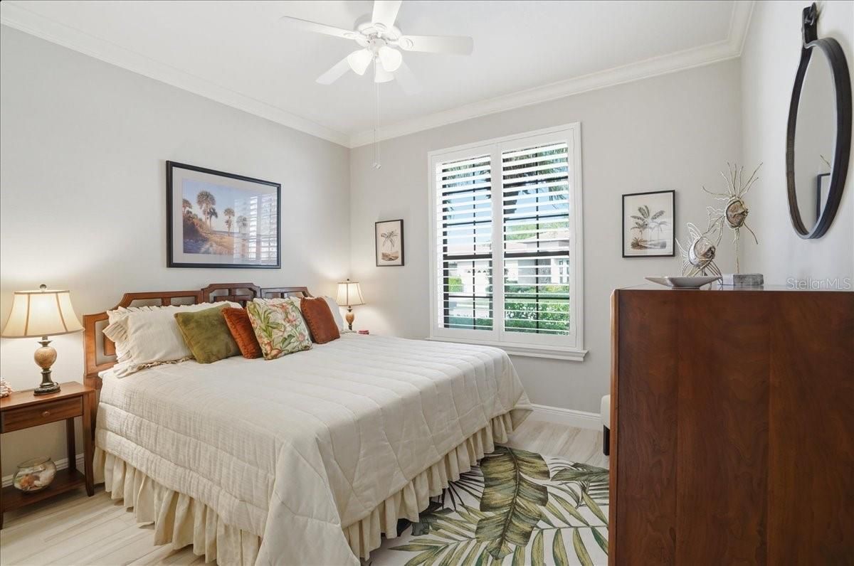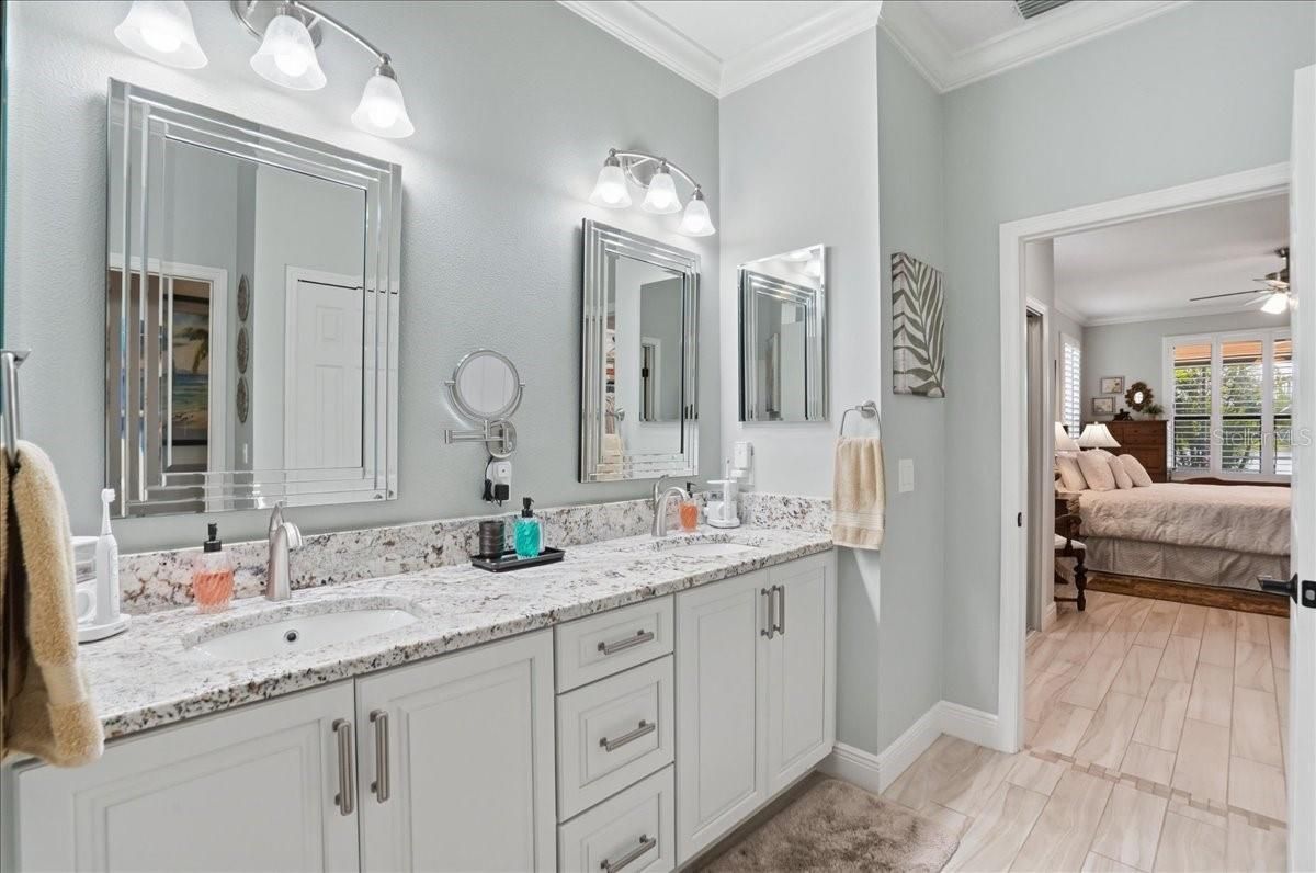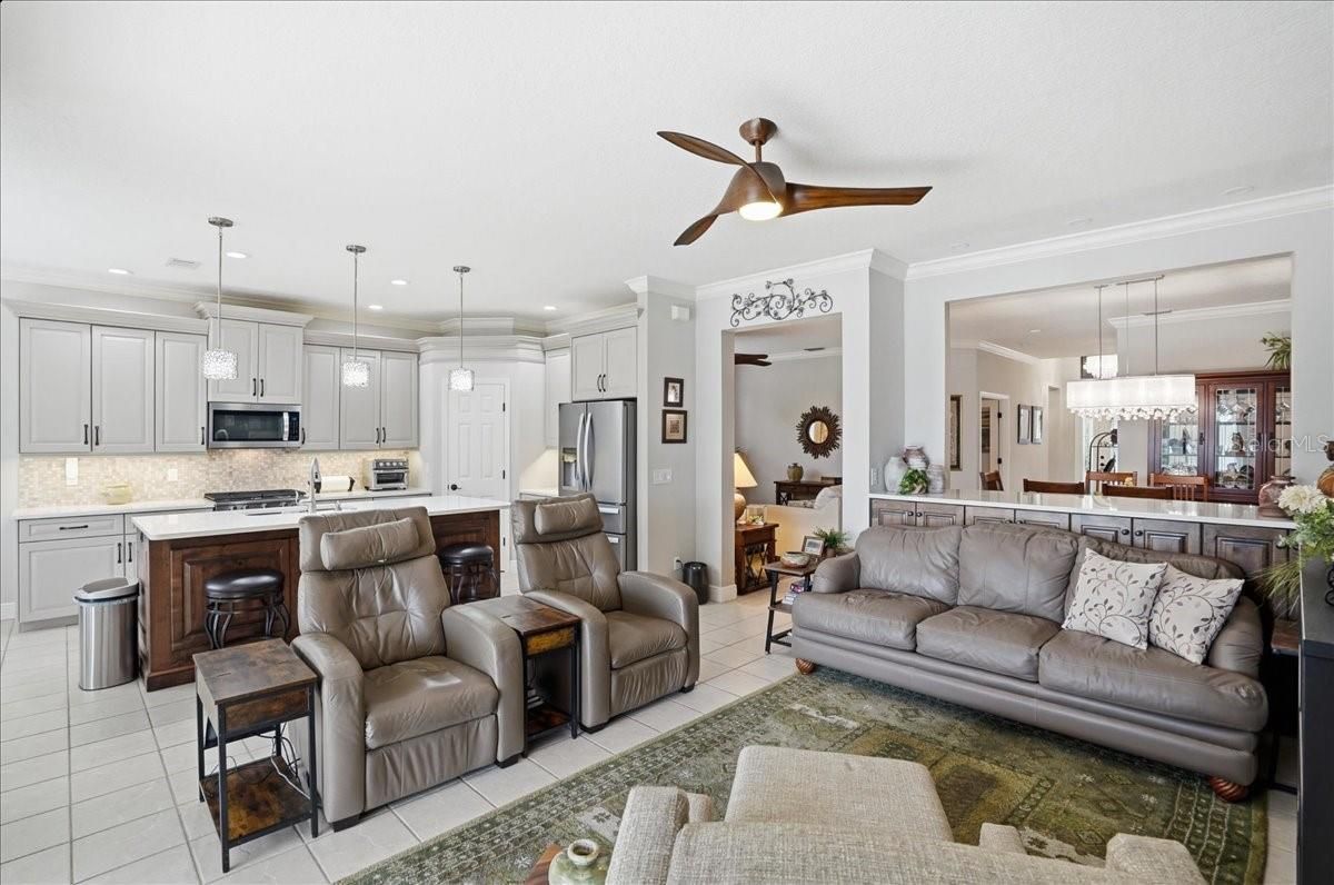 AN ABSOLUTE SHOWSTOPPER OF A HOME! Welcome to this magnificent 3 bedroom, 2 bath residence, ideally located in the lively Lakeridge Falls community, designed for those aged 55 and over. This home artfully combines comfort and convenience showcasing a plethora of upgraded features that reflect a model home quality. Situated on a serene pond with expansive water views, this lot provides an exceptional level of privacy within the gated community. The gourmet kitchen, the heart of the home, boasts elegant quartz countertops, complemented by an upscale Whirlpool appliance suite with a centerpiece 5-burner gas range (complete with griddle), and stylish two tone cabinetry. The spacious quartz-topped island offers seating and plenty of cook-prep area. Whether you’re a seasoned chef or love hosting friends and family, this kitchen is sure to impress, and sits adjacent to a cozy breakfast nook area where you can relax and enjoy the outdoor views with your morning beverage. A pass-through opening between the living and dining areas features a matching quartz counter, alongside built-in cabinetry that is perfect for storing games, dining ware, or seasonal decor for easy access. The primary bedroom sits off the lanai and features dual closets, and an ensuite bath with a spacious twin sink granite top vanity, private water closet, and easy walk in shower. Both bathrooms in the home have been tastefully upgraded, highlighting modern fixtures and finishes that exude sophistication. Two additional bedrooms are situated at the opposite end of the home for added guest and homeowner privacy. Inside, elegant crown molding and plantation shutters grace every room, adding an extra touch of refinement, and the elevated electrical package ensures abundant lighting options throughout. Two distinct living areas mean you have the flexibility to create spaces for relaxation, entertaining, or pursuing hobbies. Each space is crafted with both comfort and functionality in mind. Tile flooring flows seamlessly throughout the home, making it easy to maintain and perfect for Florida living. The AC unit, installed in 2020, ensures efficient cooling, and the garage includes a new garage door and motor, and handy ceiling-anchored shelves plus ample cabinetry for storage and organization. With a sturdy tile roof, and over 2,000 square feet of living space, this home offers ample room to enjoy with the comfort of NOT being in a flood zone. Step outside to the screened lanai, where you can bask in the picturesque pond views. The remote-controlled retractable awnings allow you to manage sunlight, crafting your ideal outdoor retreat, whether you prefer basking in the sun or enjoying the shade. The lanai floor has even been refinished, enhancing your outdoor experience. This home has been meticulously maintained, ensuring it remains in pristine condition, ready for you to move in and embrace the lifestyle you deserve with the fun and convenient (and recently renovated) community amenities that are offered. Ideally located a short drive to UTC, airport options, sought after dining, every kind of shopping and of course the exciting areas of Downtown Sarasota, Bradenton and world renown beaches! Don’t miss the opportunity to own this extraordinary home, which beautifully blends modern amenities with the tranquility of private waterfront living. Experience the best that Lakeridge Falls has to offer—schedule your tour today!