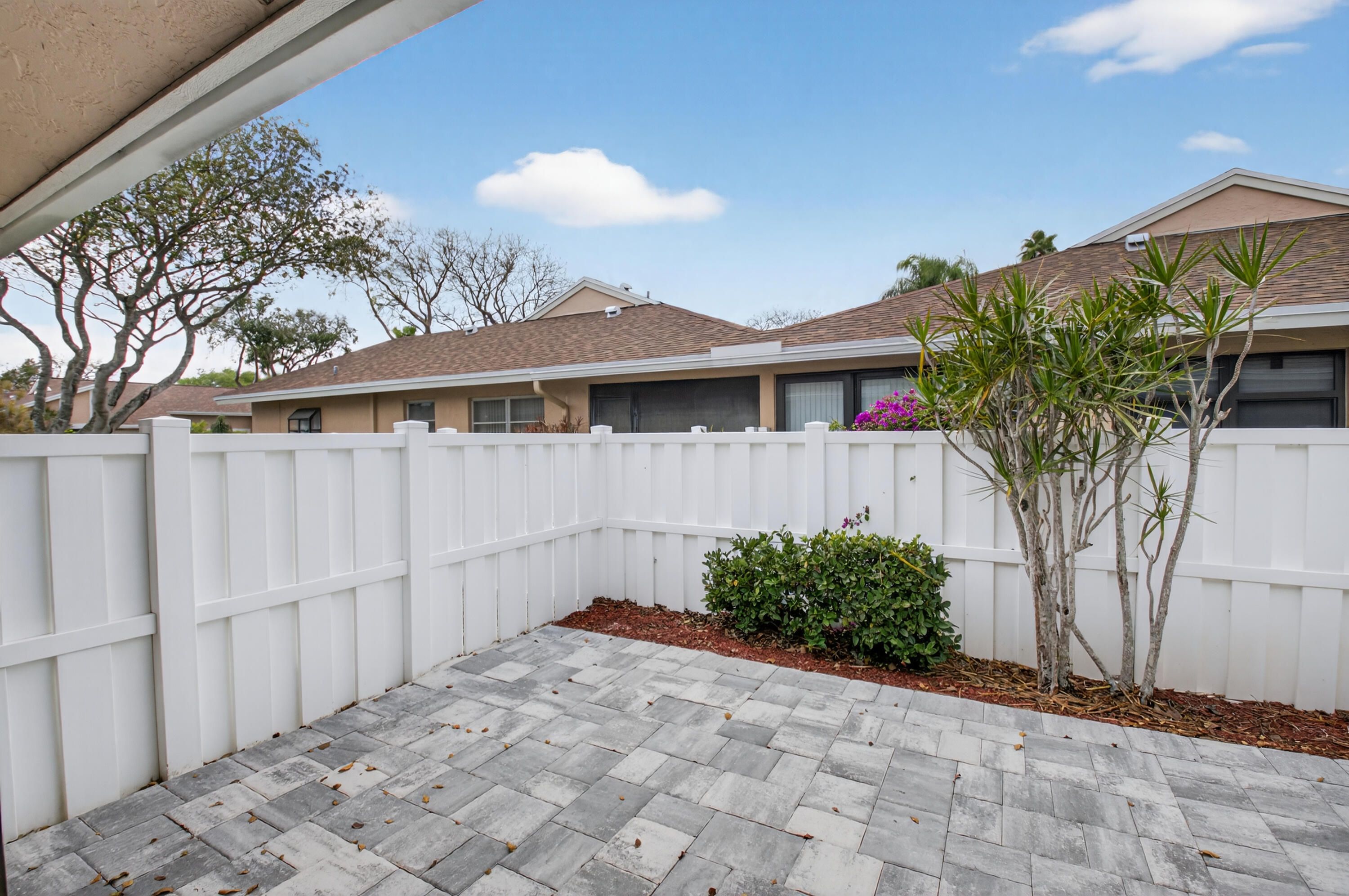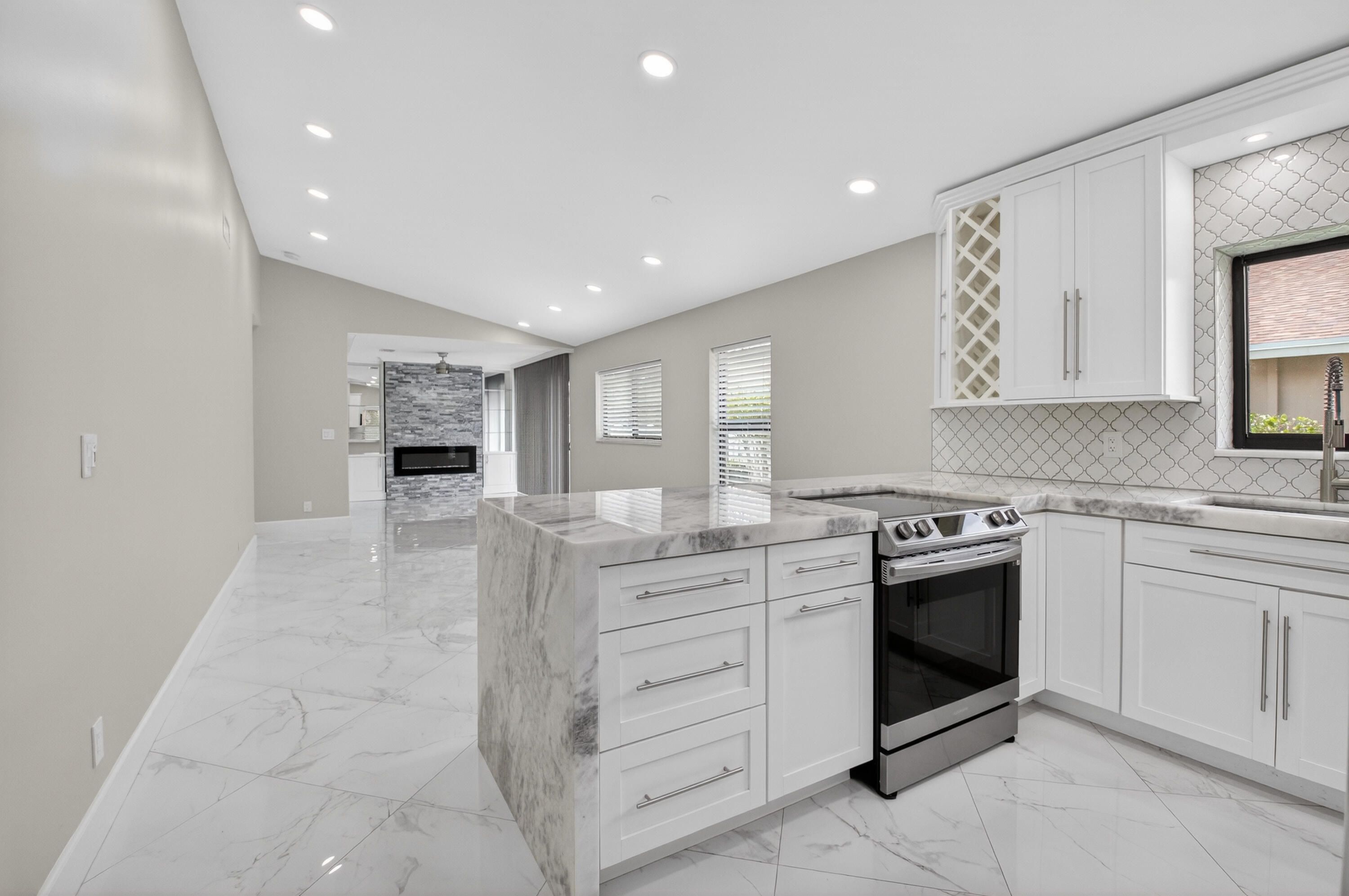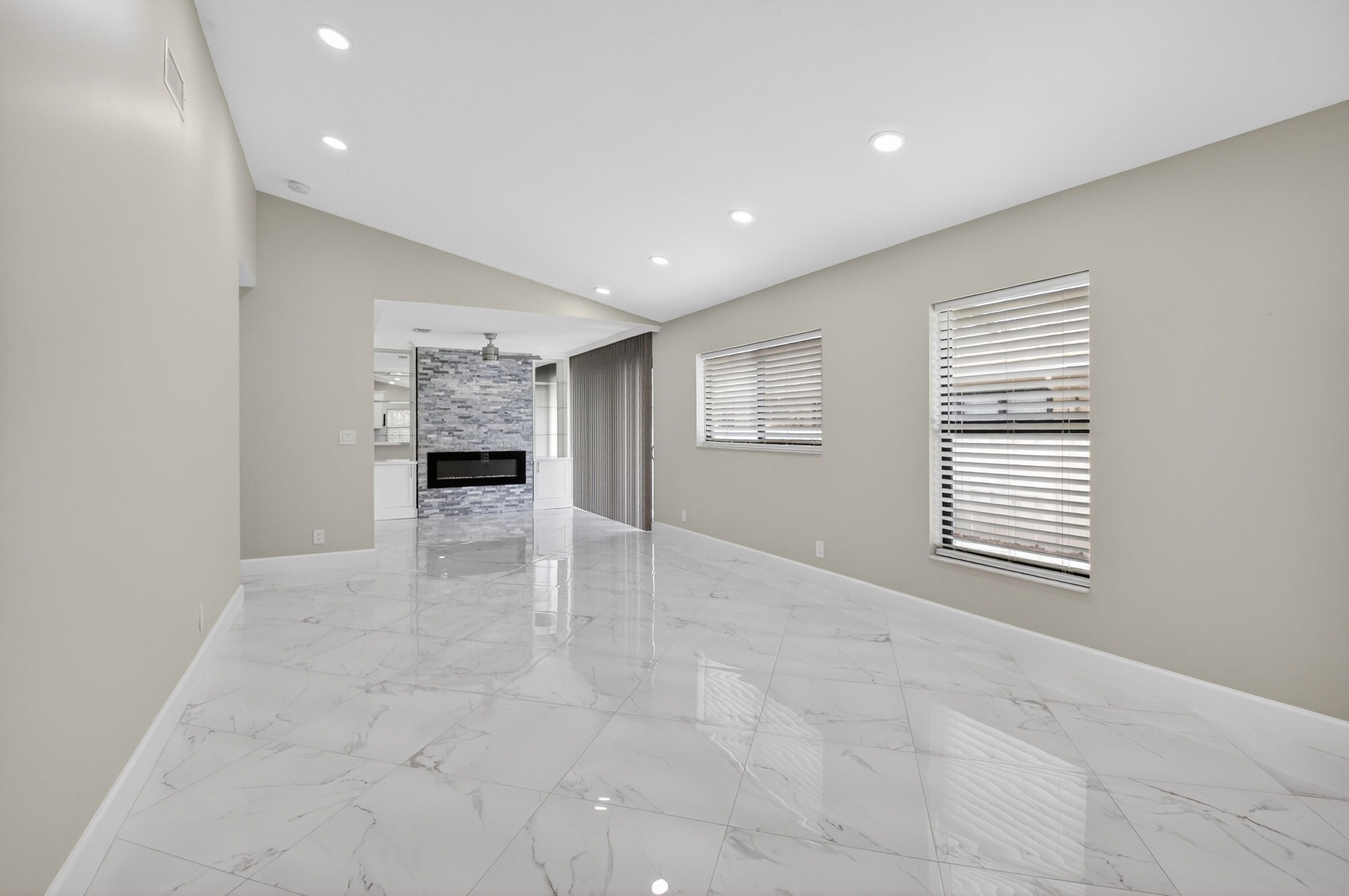 Spectacular fully renovated villa showcasing high-end designer finishes throughout. Custom quartz countertops and cabinetry, solid core doors, and impact windows provide style, quality, and peace of mind. Spacious primary suite offers a luxurious soaking tub, dual sinks, walk-in shower, and two closets including a large walk-in. This 2-bedroom, 2-bath home plus den features a decorator fireplace and a large paver patio perfect for entertaining. Enjoy all new high-efficiency appliances, NEW ROOF, AC, and HOT WATER HEATER. Located in the gated community of Whisper Walk with lush landscaping and resort-style amenities including clubhouse, Olympic-size heated pool, tennis, pickleball, and more. Close to shopping and major roads.