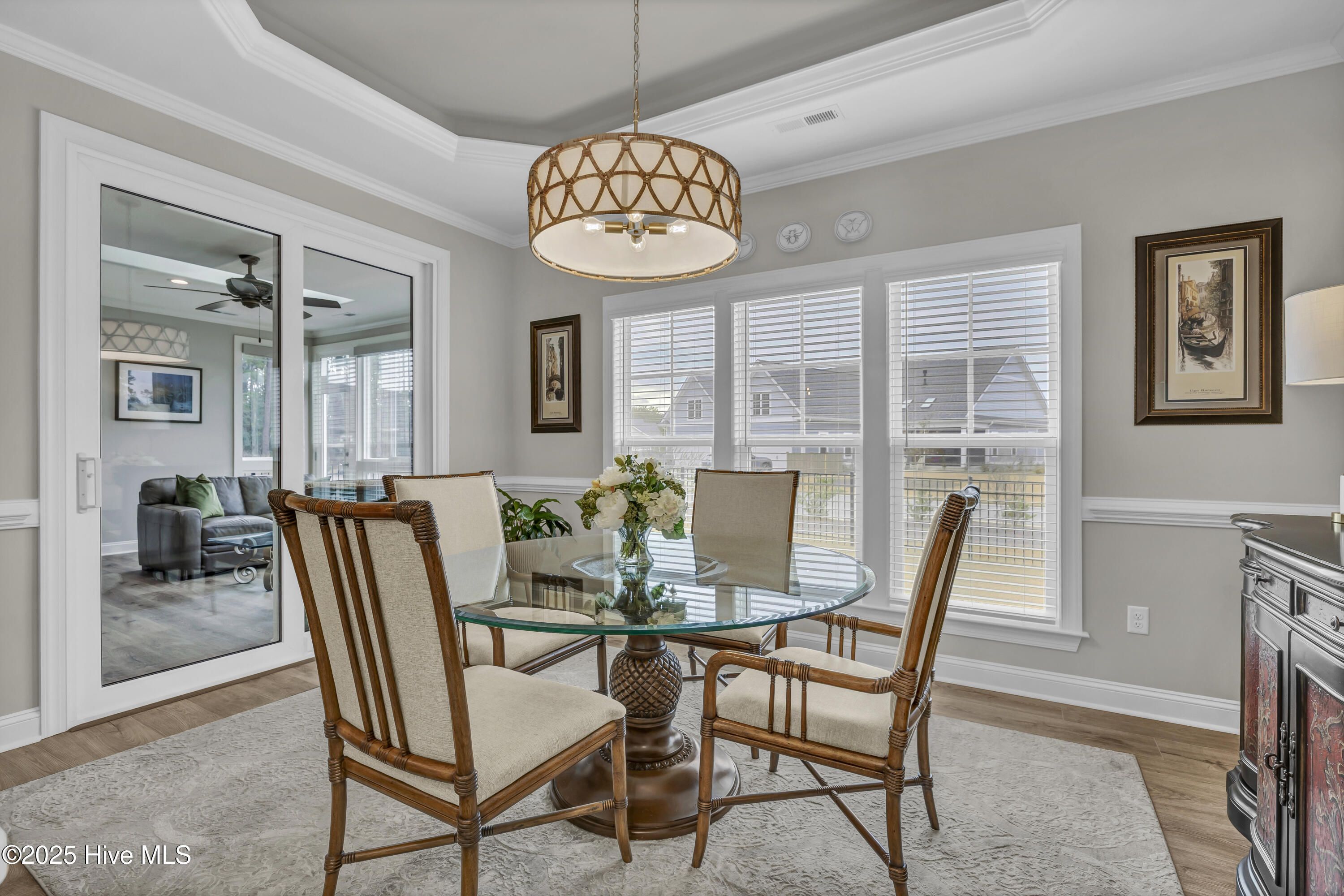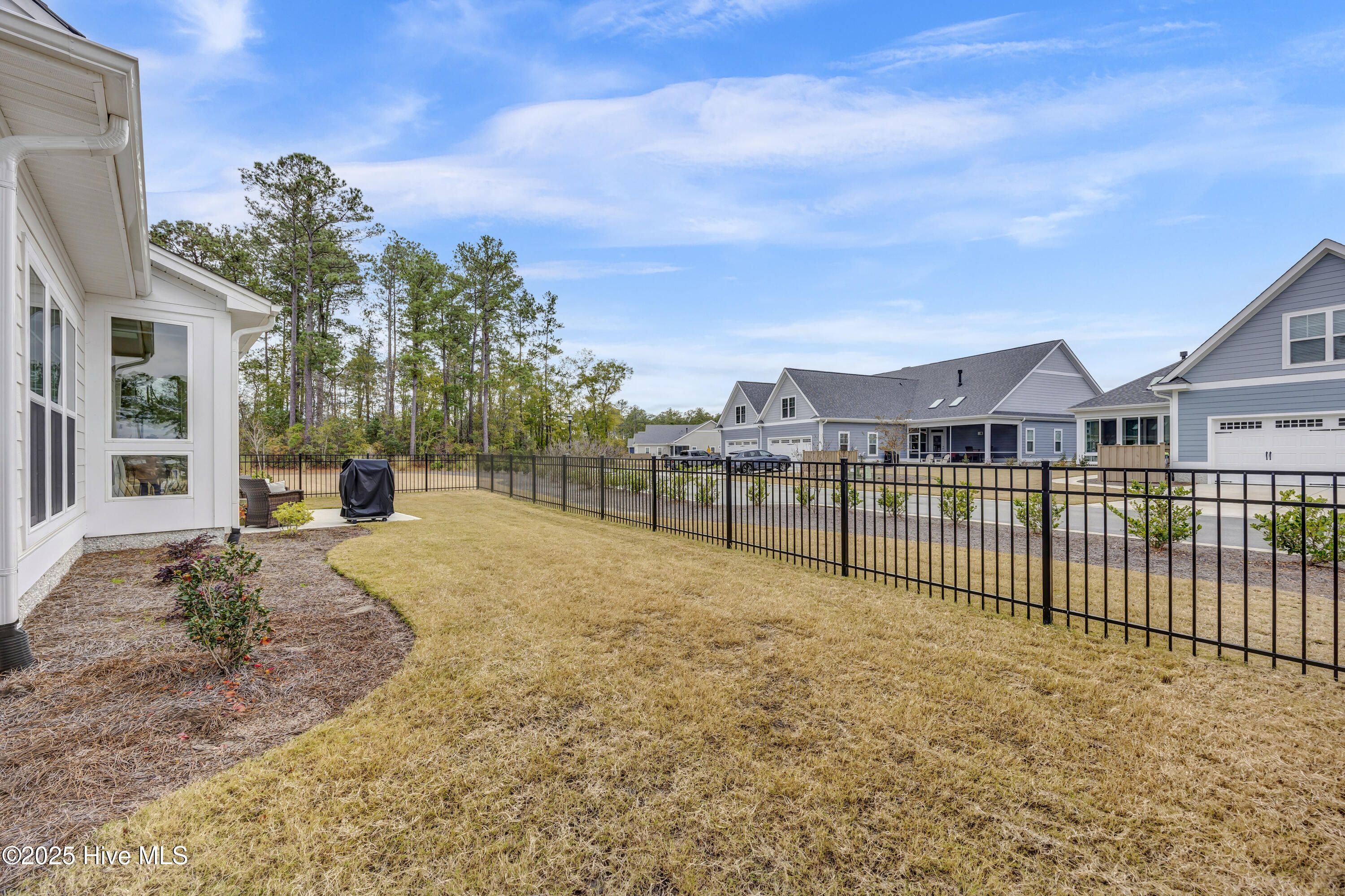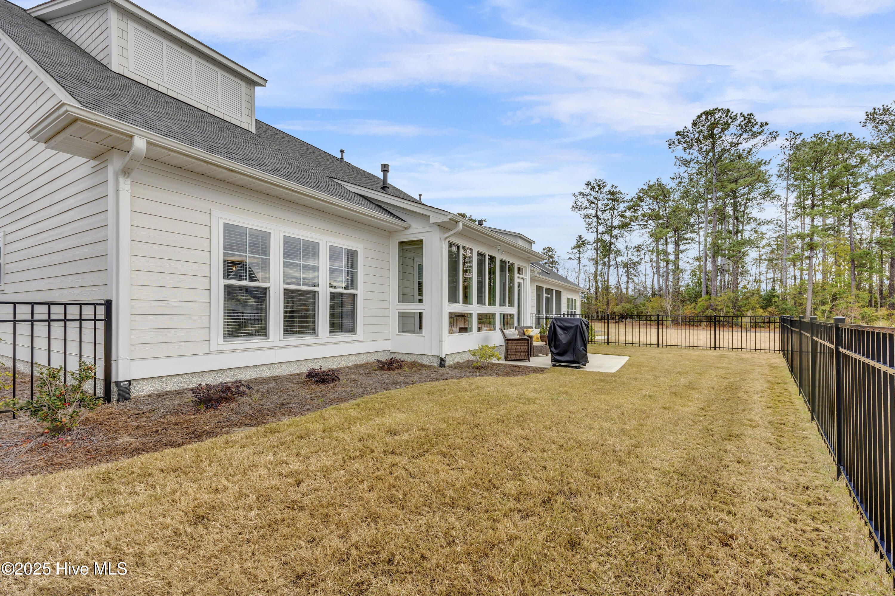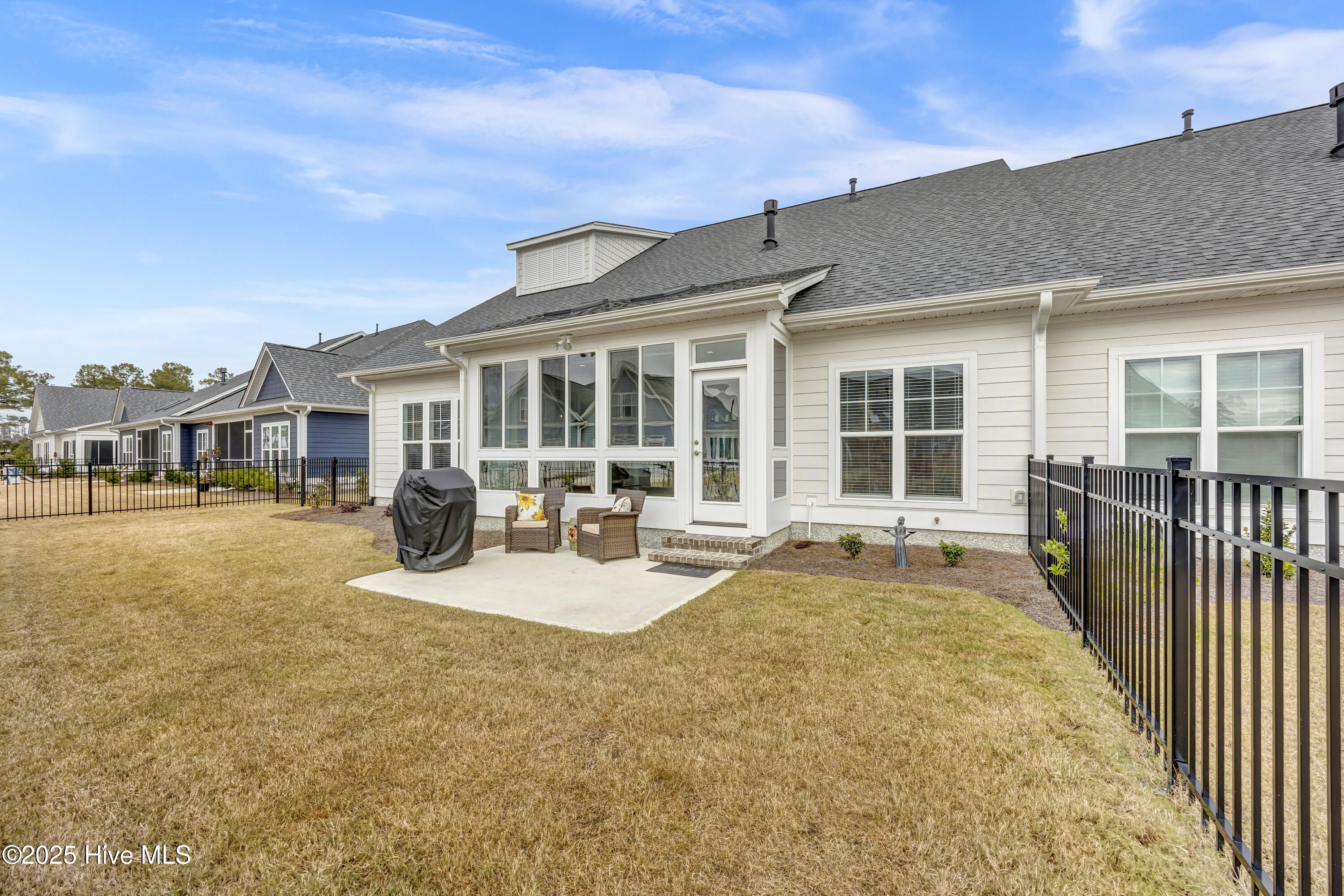 Discover low-maintenance living in this Collington Towns duplex that blends charm and coastal flair. Located in the highly sought-after community of Brunswick Forest, this property offers exceptional comfort, custom upgrades, and access to world-class, resort-style amenities. Step inside to an inviting open layout featuring 7'' hardwood floors, crown molding, and a stunning coffered ceiling in the living room. A natural gas fireplace with brick surround and a built-in bookshelf adds warmth and architectural charm. The chef's kitchen is ideal for entertaining, showcasing raised cabinetry, quartz countertops, subway tile, a natural gas range, and thoughtful custom lighting. Wood shelving throughout the home adds both style and functionality. Retreat to the finished sunroom, complete with telescoping doors, screens, and UV-protected windows, offering year-round enjoyment. The primary suite features a tray ceiling and a beautifully designed bath with quartz counters and raised vanities. Additional highlights include a whole-home dehumidifier, a fenced backyard with patio, conditioned storage, a utility sink in the garage, and a generous attic storage area. Located in an amenity-rich community offering a fitness center, tennis and pickleball courts, three pools, kayaking opportunities, and the renowned Cape Fear National Golf Course, this home is the perfect blend of comfort, convenience, and coastal lifestyle.