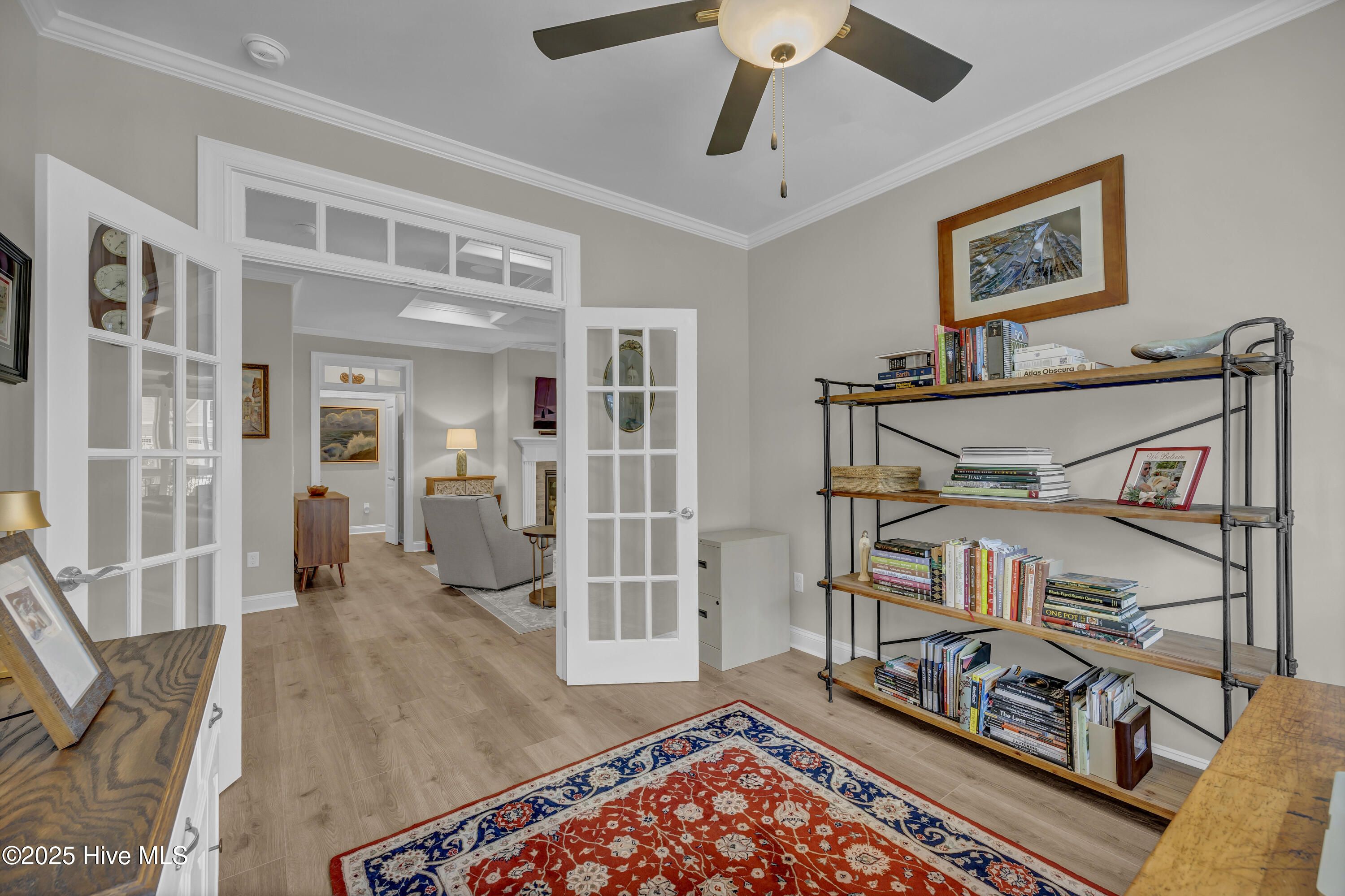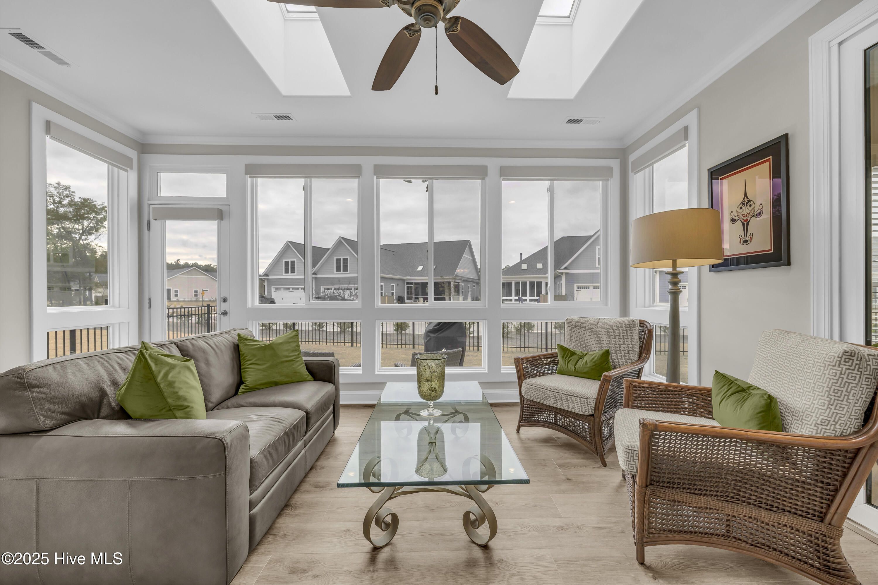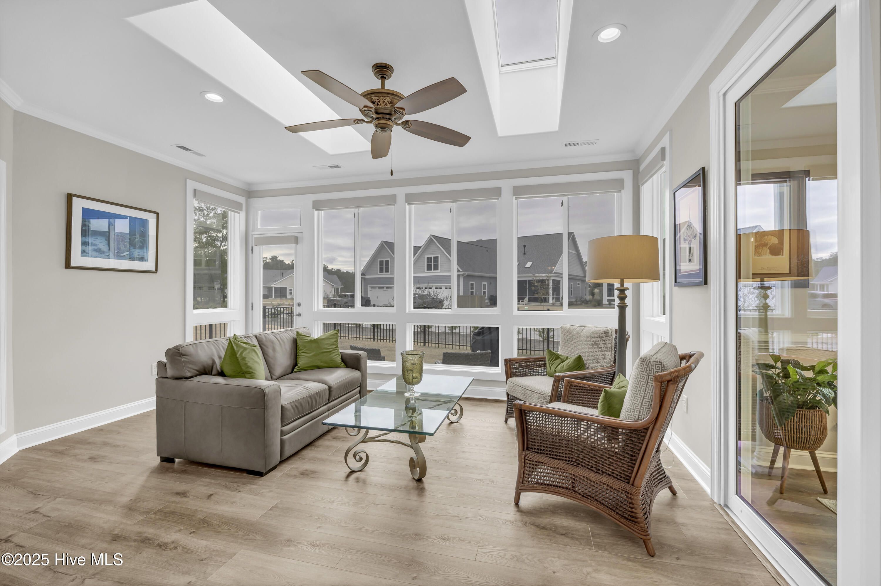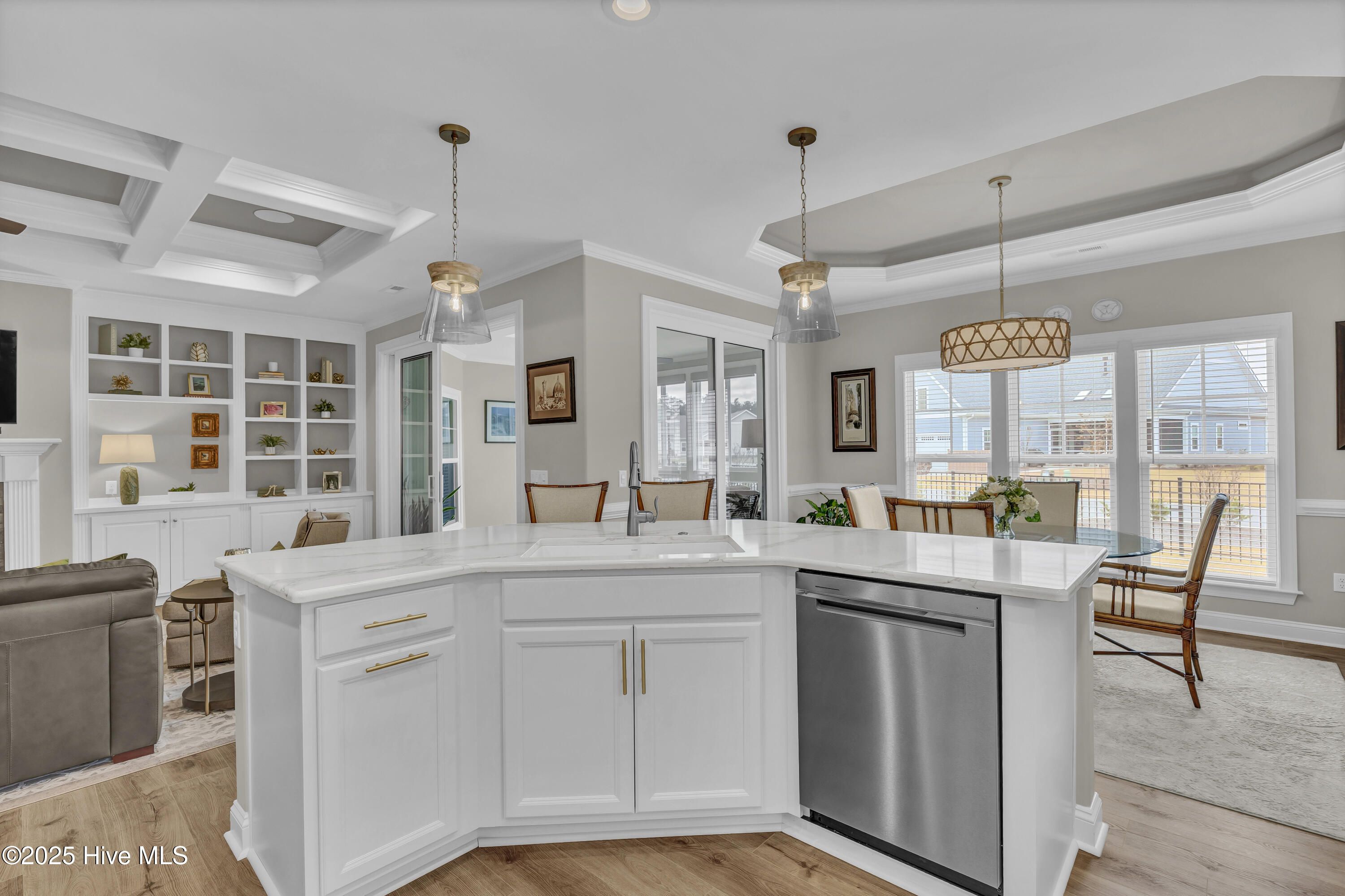 Discover low-maintenance living in this Collington Towns duplex that blends charm and coastal flair. Located in the highly sought-after community of Brunswick Forest, this property offers exceptional comfort, custom upgrades, and access to world-class, resort-style amenities. Step inside to an inviting open layout featuring 7'' hardwood floors, crown molding, and a stunning coffered ceiling in the living room. A natural gas fireplace with brick surround and a built-in bookshelf adds warmth and architectural charm. The chef's kitchen is ideal for entertaining, showcasing raised cabinetry, quartz countertops, subway tile, a natural gas range, and thoughtful custom lighting. Wood shelving throughout the home adds both style and functionality. Retreat to the finished sunroom, complete with telescoping doors, screens, and UV-protected windows, offering year-round enjoyment. The primary suite features a tray ceiling and a beautifully designed bath with quartz counters and raised vanities. Additional highlights include a whole-home dehumidifier, a fenced backyard with patio, conditioned storage, a utility sink in the garage, and a generous attic storage area. Located in an amenity-rich community offering a fitness center, tennis and pickleball courts, three pools, kayaking opportunities, and the renowned Cape Fear National Golf Course, this home is the perfect blend of comfort, convenience, and coastal lifestyle.