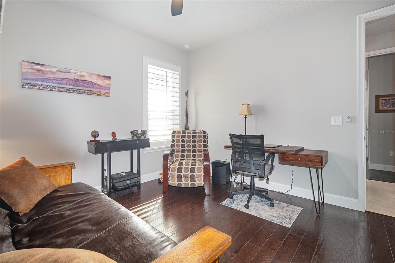 - Ceiling Fan(s), Kitchen/Family Room Combo, Main Level Primary, Stone Counters, Thermostat, Window Treatments