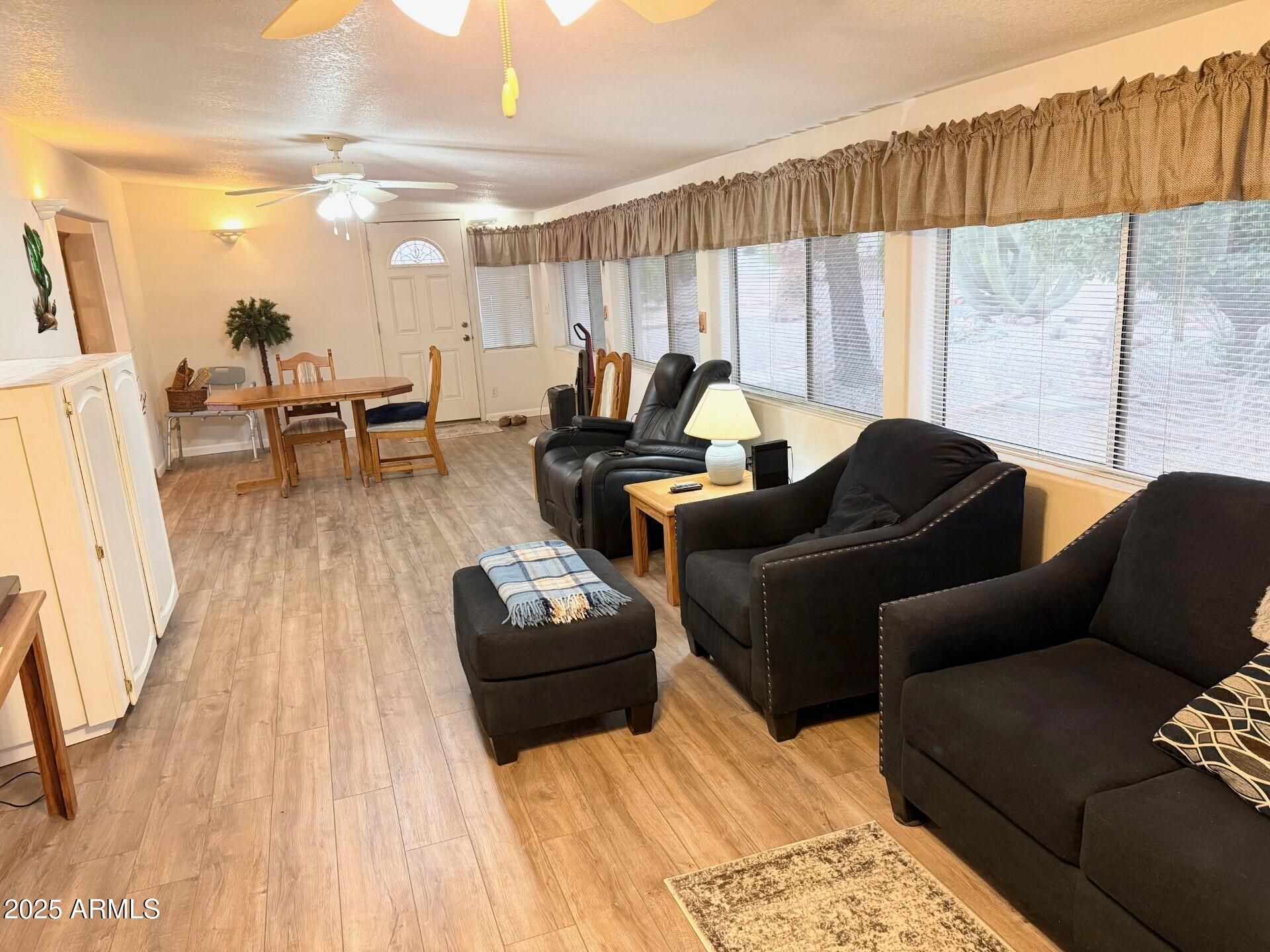 Welcome Home! Great Location, Beautifully maintained home in the desirable 55+ gated community of Fountain of the Sun. 2 Bedroom, 2 Bathroom, 2 Car Garage, Bright, open layout with Laminate flooring, Luxury Vinyl Flooring in AZ Room & Bedrooms, and a spacious Arizona room for added living space. The Open Kitchen provides lots of Storage and a Separate Pantry, Nice Sized Primary Suite, Primary Bathroom with Walk‑In Shower. Nice Sized Guest Bedroom, Guest Bathroom with Tub/Shower, Large Inside Laundry with Wash Tub, Washer and Dryer included, Enjoy low‑maintenance desert landscaping, a Covered Back Patio, Community amenities include golf, pool/spa, fitness center, pickleball, clubhouse, and 24/7 guarded entry. Perfect for full‑time or seasonal living.