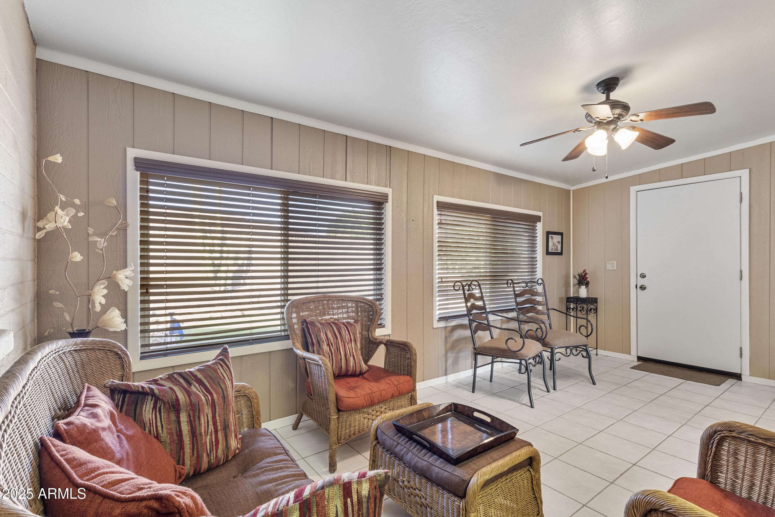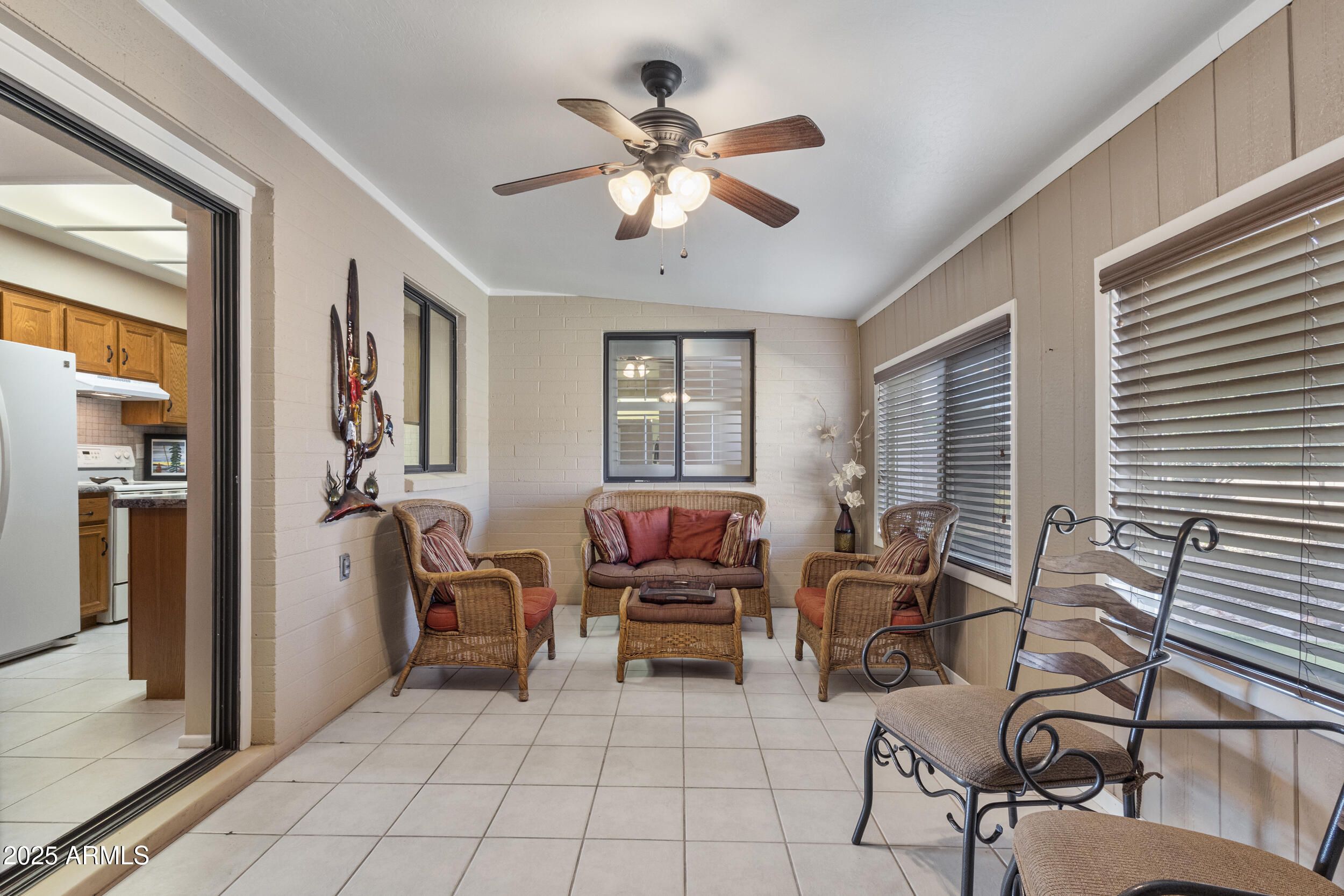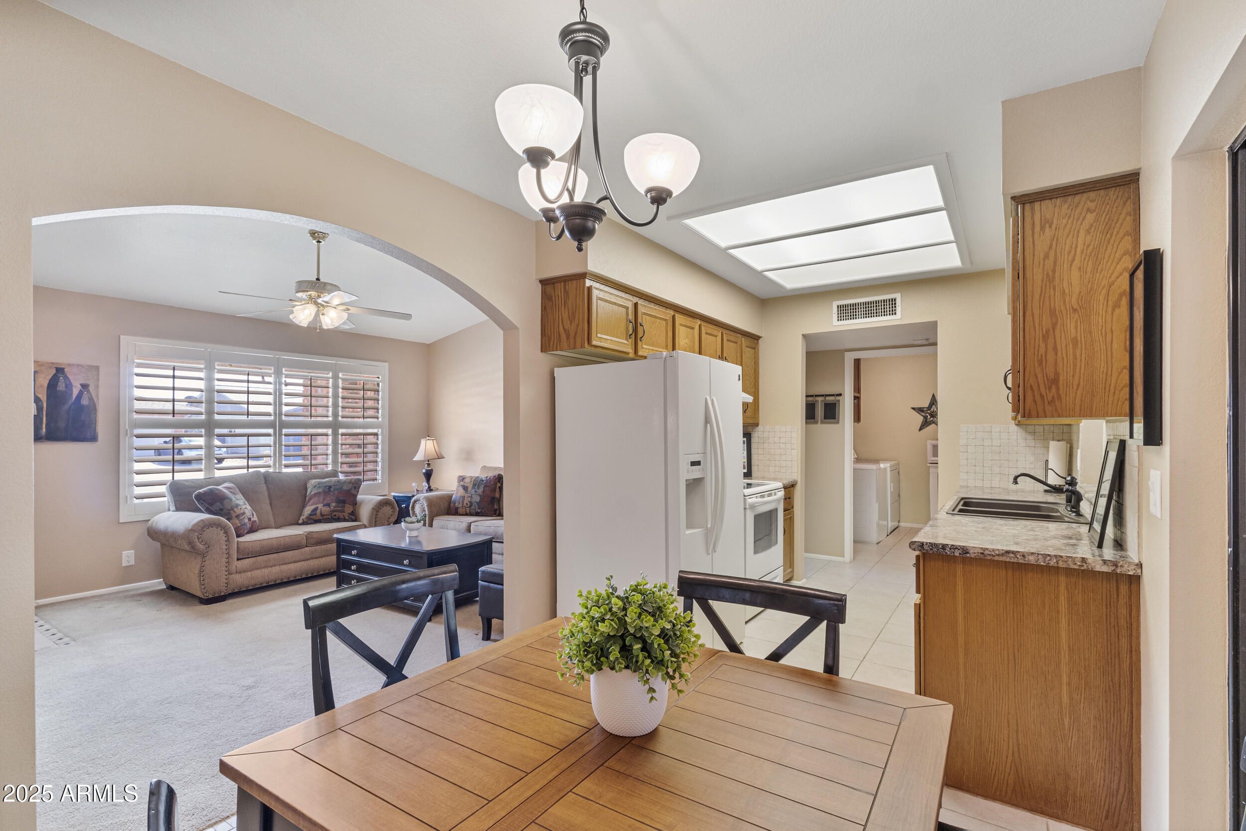 Located in Sunland Village East, a premier 55+ golf community in East Mesa, this split bedroom floorplan has 2-beds, 2-baths and is move-in ready! Enjoy vaulted/updated ceilings, plantation shutters, and fresh interior/exterior paint. The kitchen includes refinished cabinets, updated hardware, porcelain tile flooring and backsplash, and laminate counters. Additional upgrades include a new roof (2023), new garage door opener, newer security screen doors, modern light fixtures, ceiling fans, thermostat, and a new washer. The Arizona Room provides extra space for hobbies and entertaining. The relaxing, private backyard features a full block wall, low-maintenance landscaping, and low-voltage lighting. Furnished and ready for its new owner! This community offers amenities and clubs for all!
