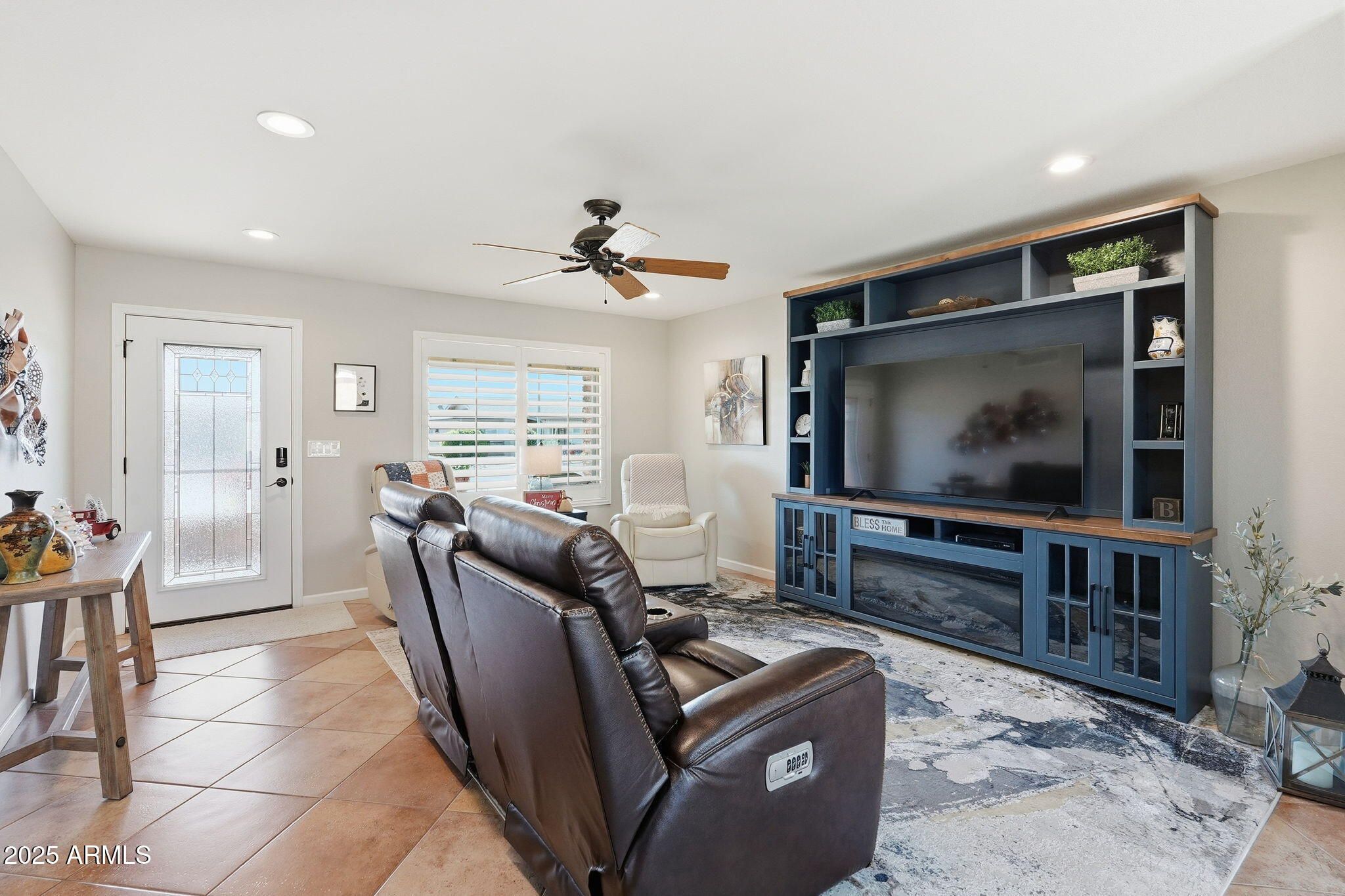 Pride of ownership is your gain in this beautifully updated 2-bedroom, 2-bath home featuring a backyard oasis with a 15x30 heated & cooling pool—perfect for fun, relaxation, and entertaining; embracing the SVE lifestyle. With over $70,000 in thoughtful upgrades, this home is completely move-in ready—just bring your toothbrush! Some of the updates include Andersen windows, new HVAC with WiFi thermostat, gutters, water softener, water heater, replacement garage door & opener, and coated floors on the garage, front patio, side walkway, and back patio (see upgrade list). The backyard shines with expansive pavers, covered and uncovered seating areas, and an outdoor bar—ideal for soaking up the Arizona sun or hosting friends for the big game. Enter through the south-facing coated front patio and enjoy abundant natural light streaming across the home to the north-facing patio door. Tile flooring throughout (no carpet) creates a clean, cohesive feel. The remodeled kitchen is stylish and functional, featuring light maple cabinetry, coordinating backsplash, high-end granite countertops, and an expanded area with built-in pantry, hutch, and desk. The dining area offers views of the landscaped backyard and living room. Behind 9-panel privacy glass doors, the spacious primary bedroom boasts a California Closets walk-in and a remodeled bath with dual sinks, quartz countertops, high-end fixtures, and a luxurious tiled shower. The guest bedroom includes his-and-her closets and is conveniently located near the updated guest bath with a beautifully tiled shower, quartz countertops, and modern fixtures. Plantation shutters throughout provide light control. You have to see the immaculate double epoxy-coated garage which includes storage cabinetry. This home truly needs nothing just unpack, relax, and start enjoying everything Sunland Village East has to offer.