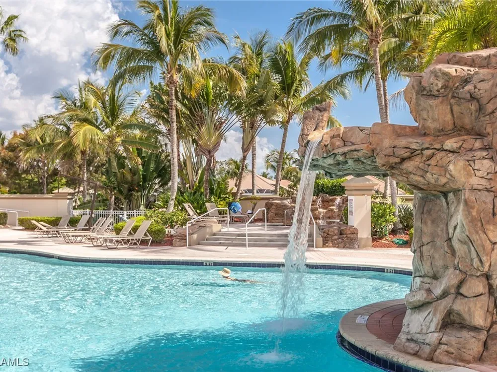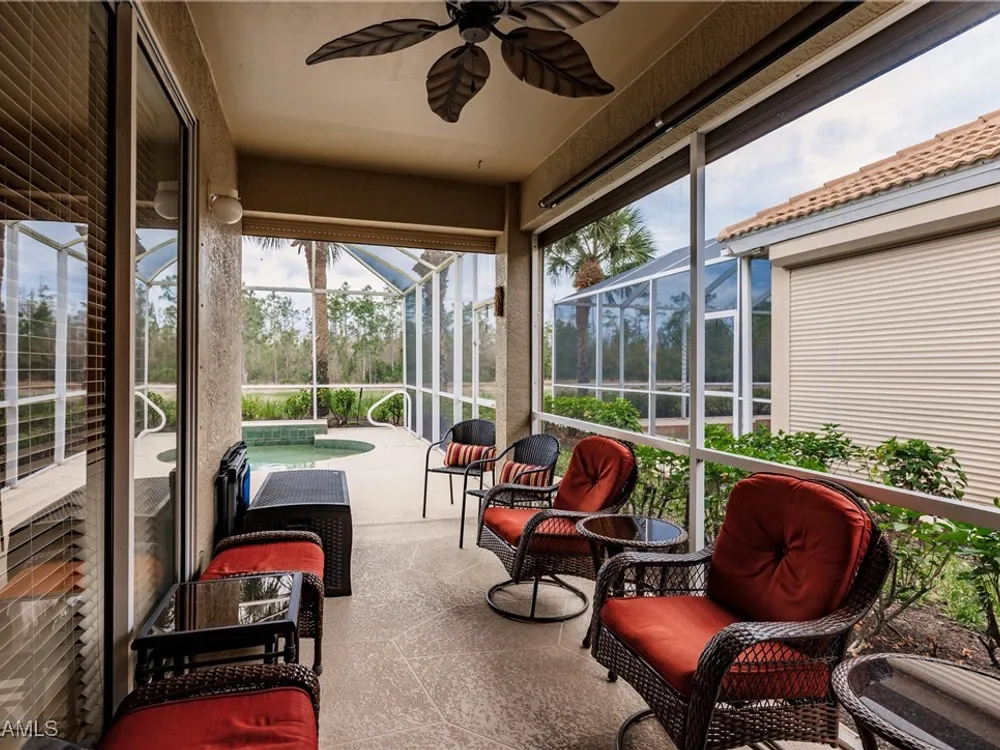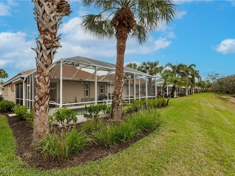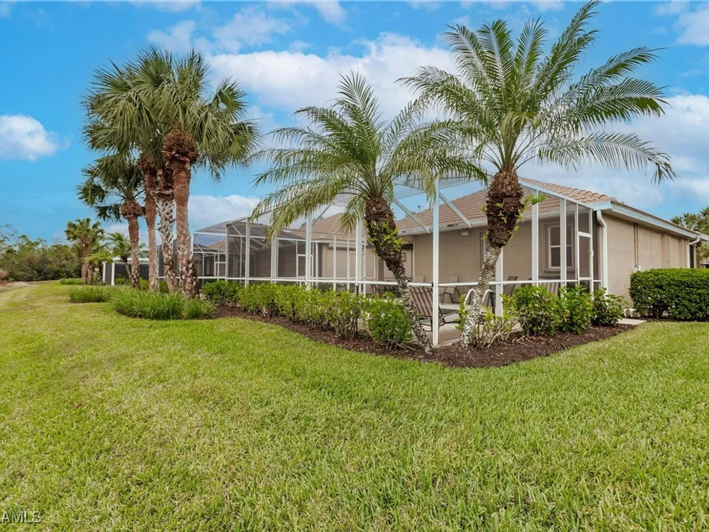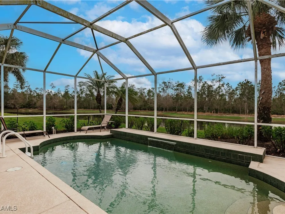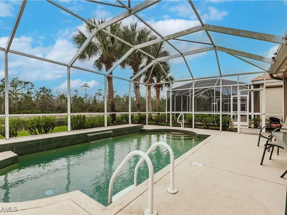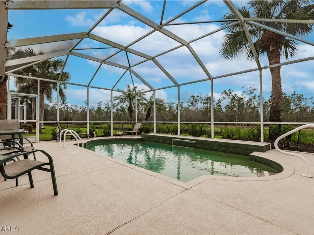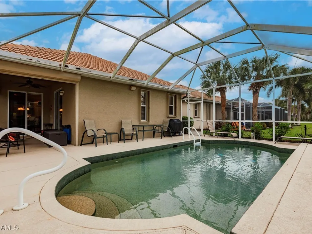 Enjoy your own tropical oasis with this nice waterfront TURNKEY home with soothing pool and relaxing waterfall feature. Brand NEW AC in 2024, refrigerator 2020, water heater 2019 and new pool pump in 2024!! Nice privacy screen on the lanai and screened in front entry, to welcome the Florida breezes. This is a Social Membership property, so you can enjoy all the amenities except golf without the high fees of a golf membership or golf assessment, yet plenty of local golf courses to play at your own leisure. Great location too.. only steps to the pool!! The Legends is a prestigious private country club that offers a wide array of amenities and eating options such as bocce, tennis, pickleball, sports bar, fine dining, exercise facility with tons of classes to choose from along with a gorgeous outdoor sunset grill aside a refreshing lagoon style pool with a waterfall. Convenient location too.. close to shopping, dining, entertainment, I75 and SWFL International Airport. Resort Style living to it's finest, MOVE IN READY and waiting for you to call it home!!