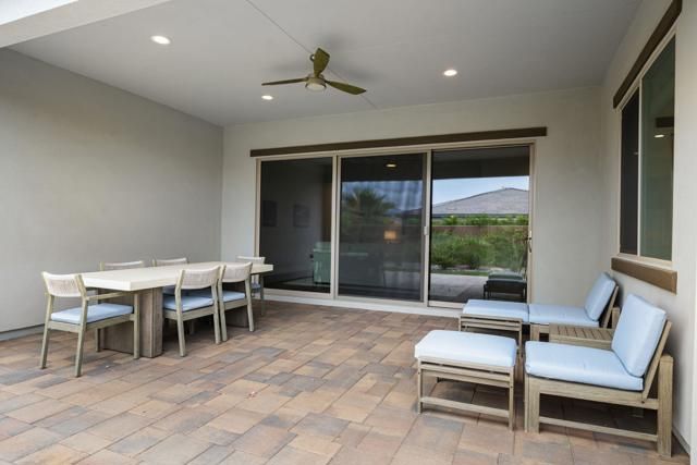 Experience resort-style living at its finest in the gated 55+ community of Trilogy Polo Club with this highly upgraded Proclaim model showcasing a solar lease system, 3 bedrooms plus den/office, 2.5 baths, and approximately 2,141 sq. ft. of beautifully designed living space. Upgrades include a new Sony/Sonos entertainment system in the living area and primary bedroom. Also included is a new LG front loading washer/dryer and upgraded custom designed California Closets storage units in the primary bedroom, second and third bedrooms, and garage. This residence features an open-concept floor plan filled with natural light, seamlessly blending indoor and outdoor living through expansive sliders that open to a covered paver patio, perfect for entertaining or relaxing against the backdrop of the Santa Rosa Mountains. This residence enjoys a southern exposure in the back patio and backyard enhancing enjoyment in the winter months. The chef's kitchen is a true showpiece with upgraded cabinetry, quartz countertops, stainless steel appliances, and an oversized island with seating, flowing effortlessly into the great room and dining area. The primary suite offers a spa-like retreat with a granite dual-sink vanity, chic tiled shower, and spacious walk-in closet, while two guest bedrooms share a stylish bath. Additional highlights include a powder room, golf cart garage, laundry room with a sink, luxury vinyl plank flooring, ceiling fans, solar, and numerous upgrades throughout. Residents of Trilogy Polo Club enjoy an exceptional array of amenities, including a modern clubhouse with a restaurant, fitness center, resort and lap pools, tennis, pickleball, golf simulator, poker/billiards room, culinary and art studios--all designed to elevate the desert lifestyle.