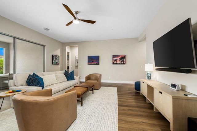 Experience resort-style living at its finest in the gated 55+ community of Trilogy Polo Club with this highly upgraded Proclaim model showcasing a solar lease system, 3 bedrooms plus den/office, 2.5 baths, and approximately 2,141 sq. ft. of beautifully designed living space. This residence features an open-concept floor plan filled with natural light, seamlessly blending indoor and outdoor living through expansive sliders that open to a covered paver patio, perfect for entertaining or relaxing against the backdrop of the Santa Rosa Mountains. The chef's kitchen is a true showpiece with upgraded cabinetry, quartz countertops, stainless steel appliances, and an oversized island with seating, flowing effortlessly into the great room and dining area. The primary suite offers a spa-like retreat with a granite dual-sink vanity, chic tiled shower, and spacious walk-in closet, while two guest bedrooms share a stylish bath. Additional highlights include a powder room, golf cart garage, laundry room with a sink, luxury vinyl plank flooring, ceiling fans, custom California closets in the bedrooms and garage, solar, and numerous upgrades throughout. Residents of Trilogy Polo Club enjoy an exceptional array of amenities, including a modern clubhouse with a restaurant, fitness center, resort and lap pools, tennis, pickleball, golf simulator, poker/billiards room, culinary and art studios--all designed to elevate the desert lifestyle.