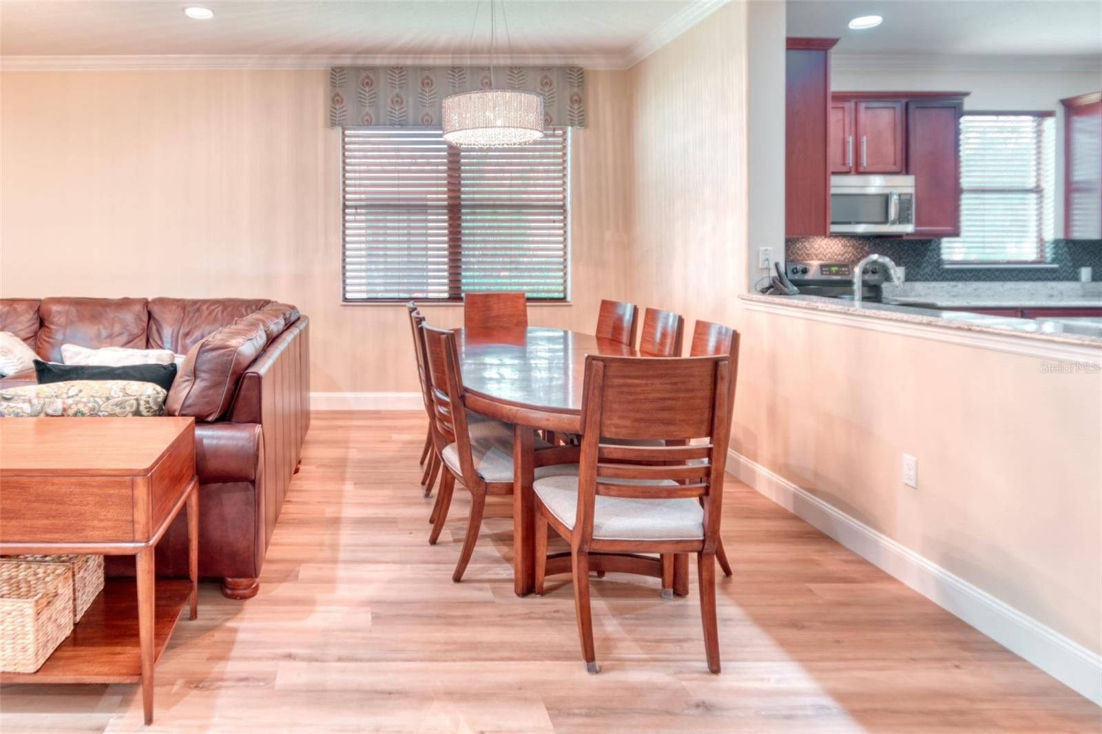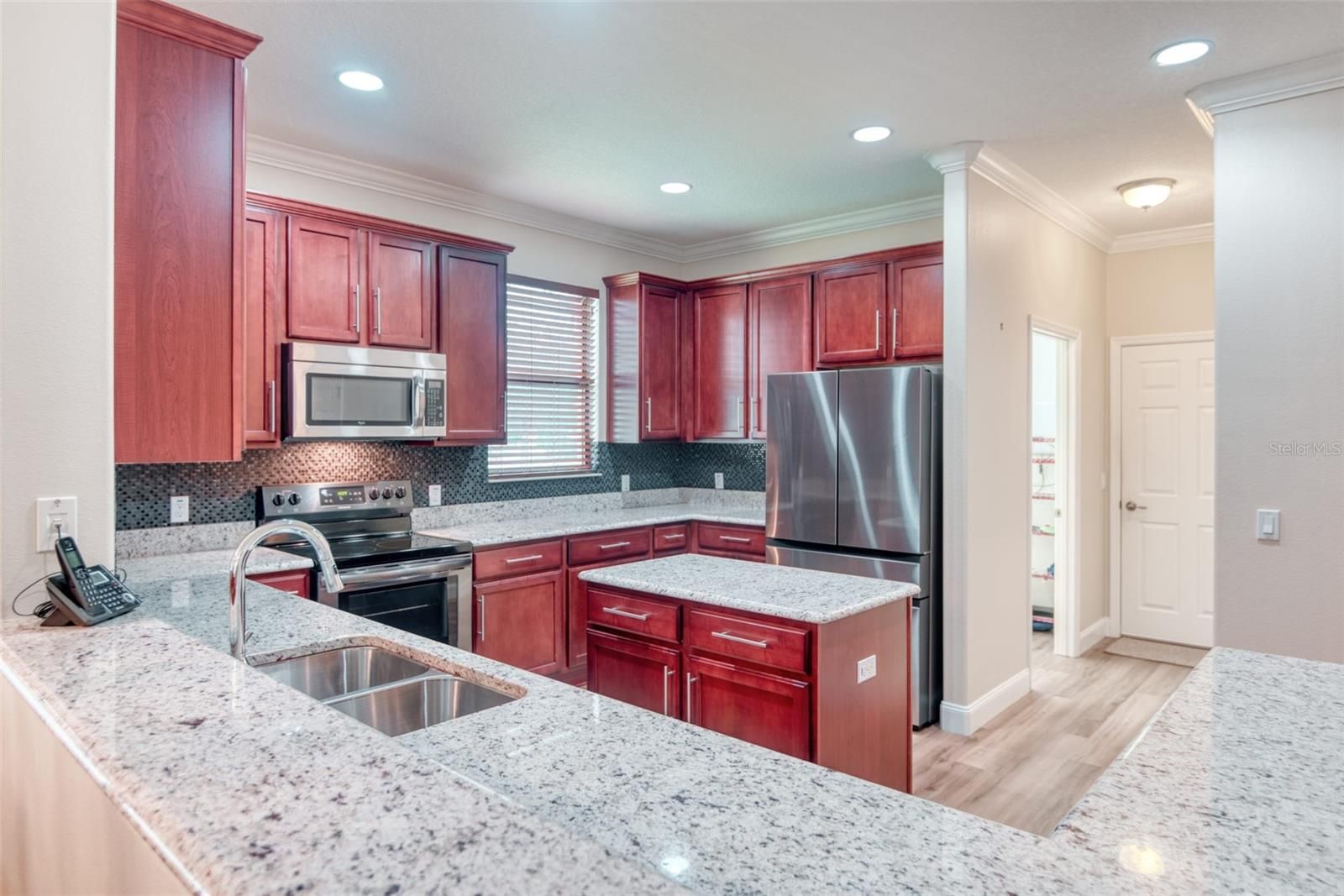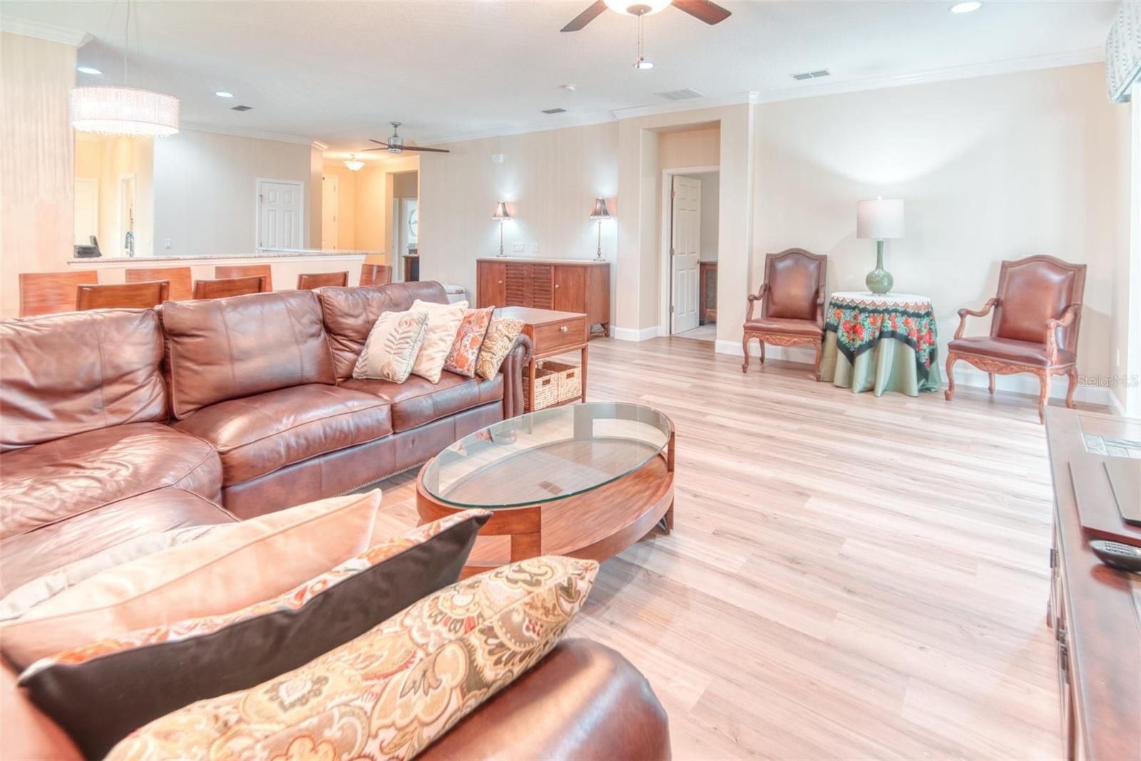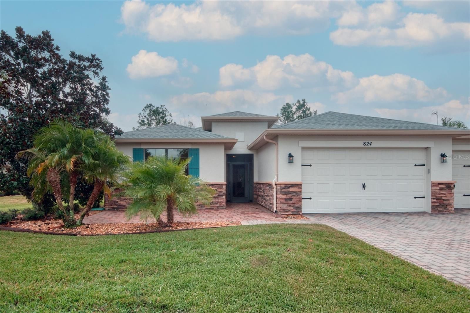 Priced to Sell! Located in a quiet section of Solivita on a peaceful conservation-view lot near the resort-style Palms Amenity Center, this beautifully upgraded 3-bedroom, 2-bath SAFI model welcomes you with a striking stone façade and a 2023 roof. Luxury plank flooring extends through the two front bedrooms and all common areas, creating a warm and cohesive living space. Crown molding accents the living, dining, and kitchen areas for an elevated touch. The chef’s kitchen shines with granite countertops, a breakfast bar, center island, large walk-in pantry, and a stylish tile backsplash. Appliances are in like-new condition, including a Bosch dishwasher and Samsung refrigerator with dual ice makers. The spacious primary suite features two walk-in closets and an en-suite bath with dual sinks and a walk-in shower. Step out to the screened lanai and enjoy serene conservation views—perfect for unwinding or entertaining. Additional highlights include garage shelving, an insulated garage door, and generous space for two cars plus a much desired golf cart garage. This thoughtfully upgraded home is move-in ready and perfectly situated for comfort, convenience, and natural beauty. Solivita is a gated and guard-monitored 55+ master-planned community situated on 4,300 acres and boasts 150,000 square feet of resort-style amenities such as golf, 2-18 hole Golf courses, 2 state-of-the-art fitness centers, and various dining options. Residents can also enjoy 14 heated pools, amenity complexes, neighborhood centers, pickleball, tennis, bocce, and shuffleboard courts, along with miles of walking and bike paths. Over 200 Clubs, with Art, Education and cultural classes for you to enjoy! Join the "Solivita Family" and make this home your home today! Just outside of Solivita is a state are Hospital and many doctors offices. Also just outside of the gate is the new Poinciana Lakes shopping center with Outback, First Watch, Sprouts Market, Ross, Burlington, Bojangles, Sage Dental, TD bank, 5 below, Petco, Five Guys and many more.