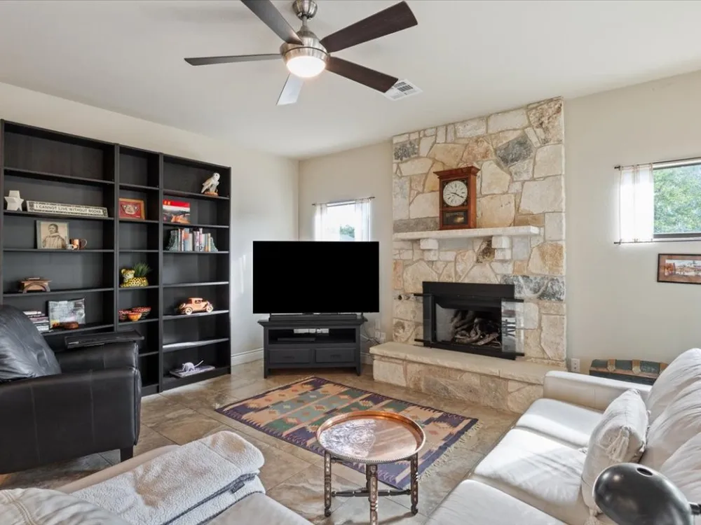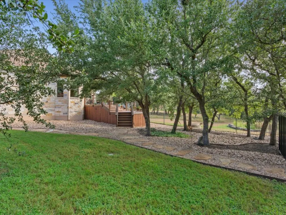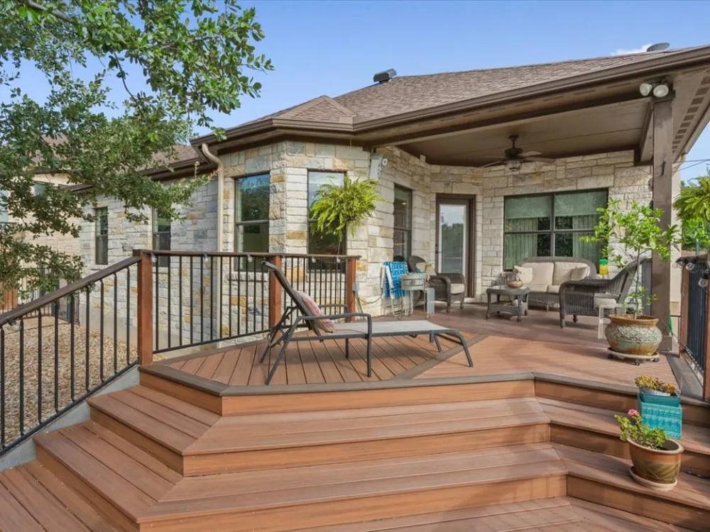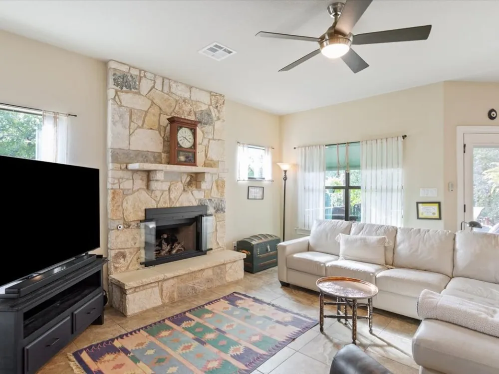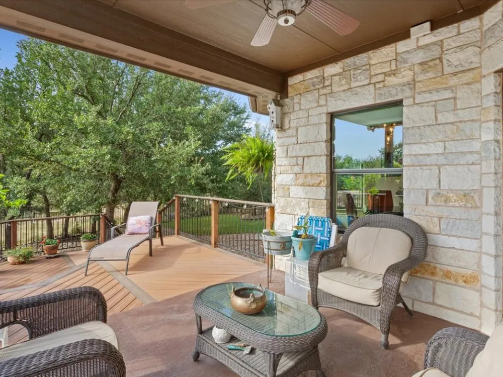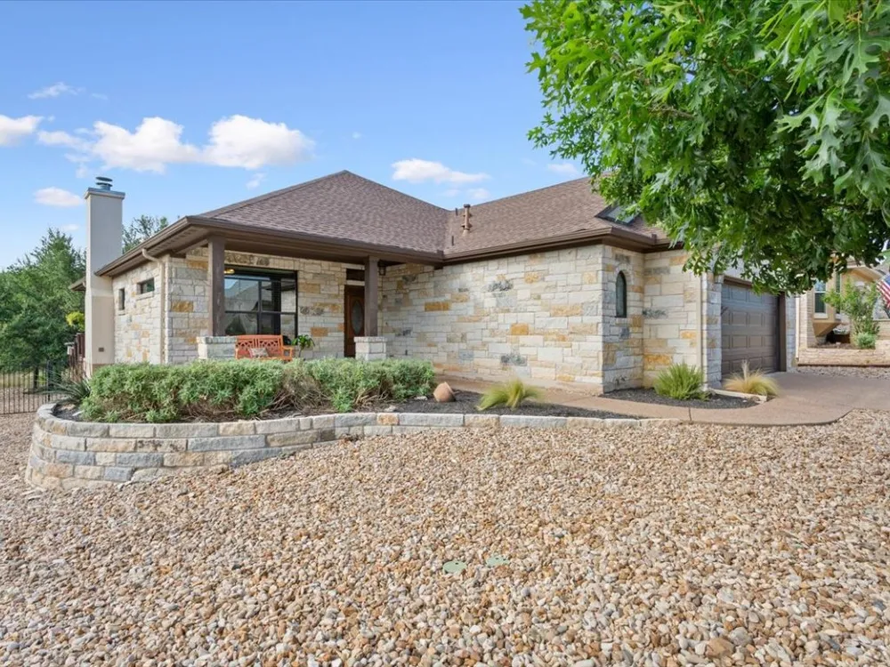 Set against a stunning greenbelt in the 55+ Heritage Oaks community, this Jimmy Jacobs-built home offers serene outdoor living with expansive, multi-level Trex decking with storage below, KoolCote front and rear patios, a flagstone walkway in a fully fenced yard. Enjoy morning coffee on the front porch or relax back on the deck while taking in the peaceful views—nature is truly part of this home! Inside, the open floor plan features 2 bedrooms, 2 bathrooms, and a large office with French doors. The living area is anchored by a dramatic stone-to-ceiling gas fireplace, dining space with fabulous views, and the kitchen showcases granite countertops, and a gas range. All appliances convey. The oversized primary suite includes dual vanity, walk-in shower, a spa tub, and a spacious walk-in closet for him and her. Updates include a new roof in 2020, a garage door opener in 2025, an insulated garage door, and an epoxy-coated garage floor. Heritage Oaks residents enjoy a vibrant community lifestyle. The amenities include- clubhouse featuring a ballroom with full commercial kitchen facilities, a state-of-the-art fitness center, a billiards and dart room, and a library/game room. Walking trails and a variety of community activities make it easy to stay active and connected. Close to Lake Georgetown and the infamous Georgetown Square, this home blends a great floor plan with exceptional outdoor spaces and views you’ll love coming home to.