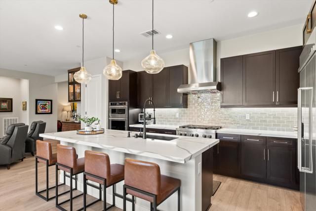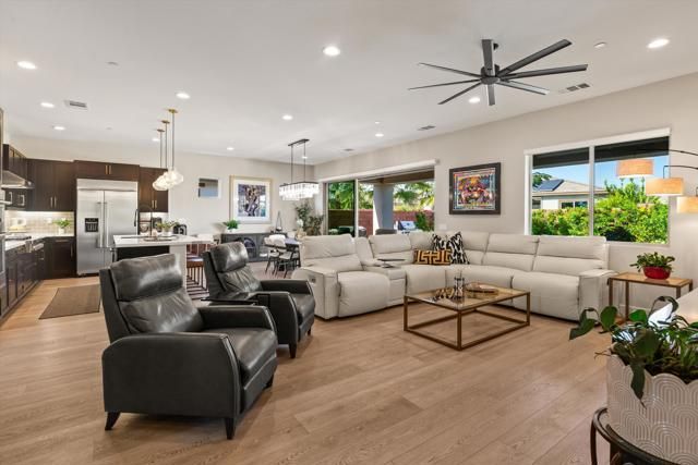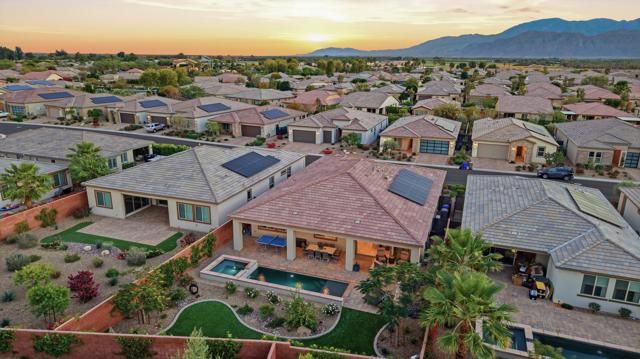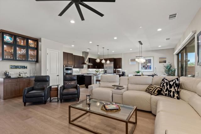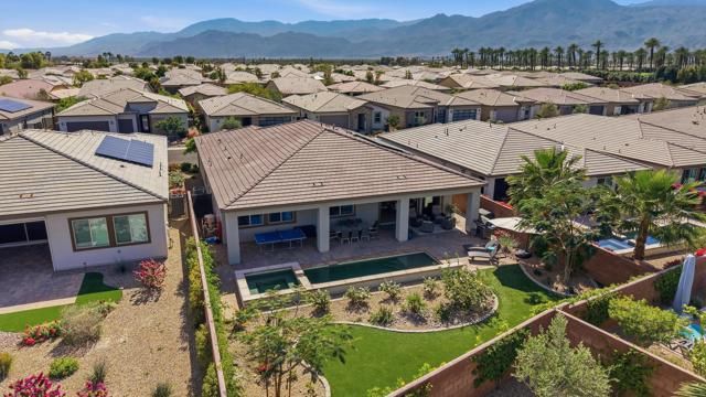 Located within the vibrant Trilogy Polo Club community, this beautifully appointed 3-bedroom, 3-bath residence, built in 2023, sits on an oversized lot and offers a seamless blend of modern design, comfort, and resort-style living. An open-concept floor plan centers around a spacious living area with a dramatic triple slider, opening directly to the professionally landscaped backyard, creating effortless indoor / outdoor flow. The chef's kitchen boasts an oversized island, six-burner gas range, and a custom dry bar just off the kitchen, creating a perfect space for entertaining. Enjoy the backyard with large private pebble-finish pool and spa (with removable pool fence), covered patio for shaded dining, and loads of colorful flora. The large private primary suite overlooks the pool and includes a spa-like bath with dual vanity, walk-in tile shower, a large walk-in closet designed by California Closets. Two spacious guest rooms and baths offer plenty of private space for visiting guests to unwind. The two-car garage plus dedicated golf cart bay features epoxy floors and built-in shelving, providing both style and function. With its oversized yard, newer construction, and prime location within Trilogy Polo Club, this home offers an exceptional opportunity to enjoy the best of desert living. Additional features include automated blinds in the living room, solar, tankless water heater, garage mini-split, and color-changing LED lighting accents the home's exterior, creating a striking presence after sunset. Polo Club membership available to transfer for a fee and gives you access to fitness center, pickleball, tennis, and all the other perks available. The best of desert living awaits!
