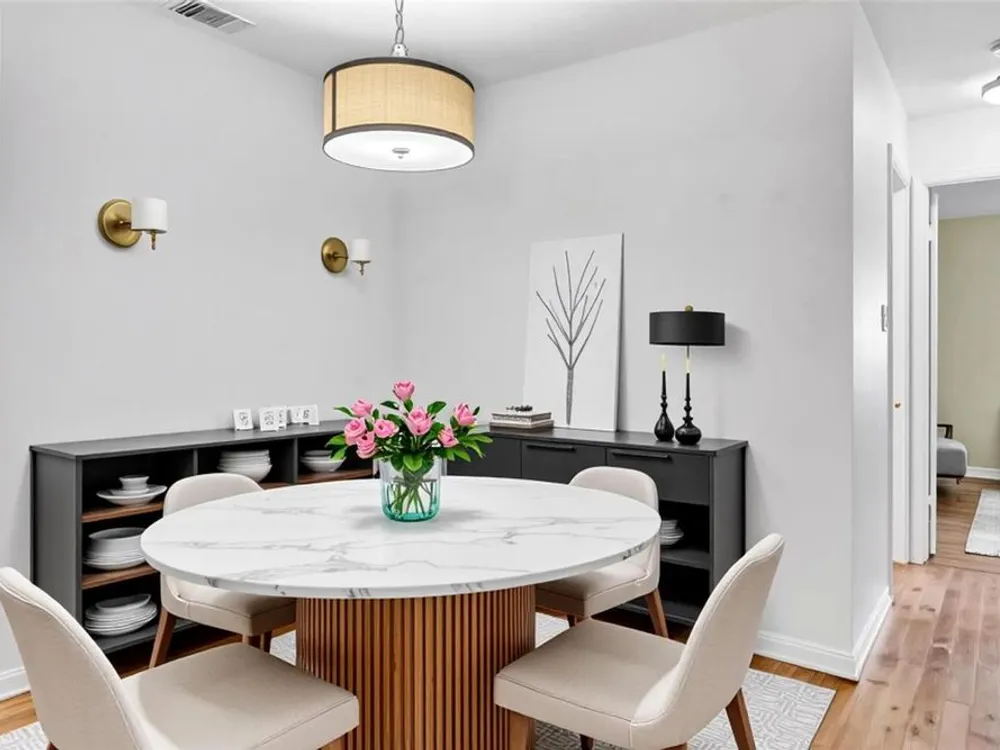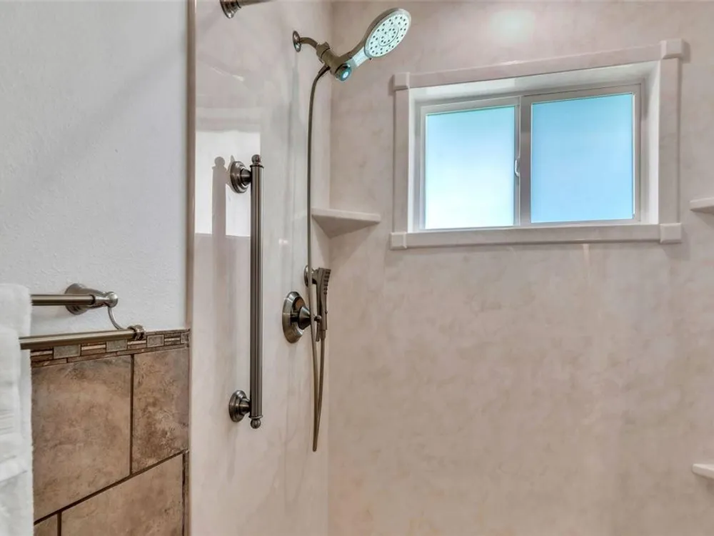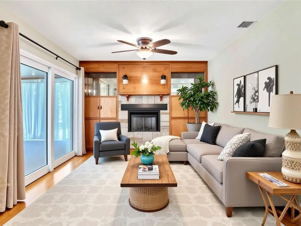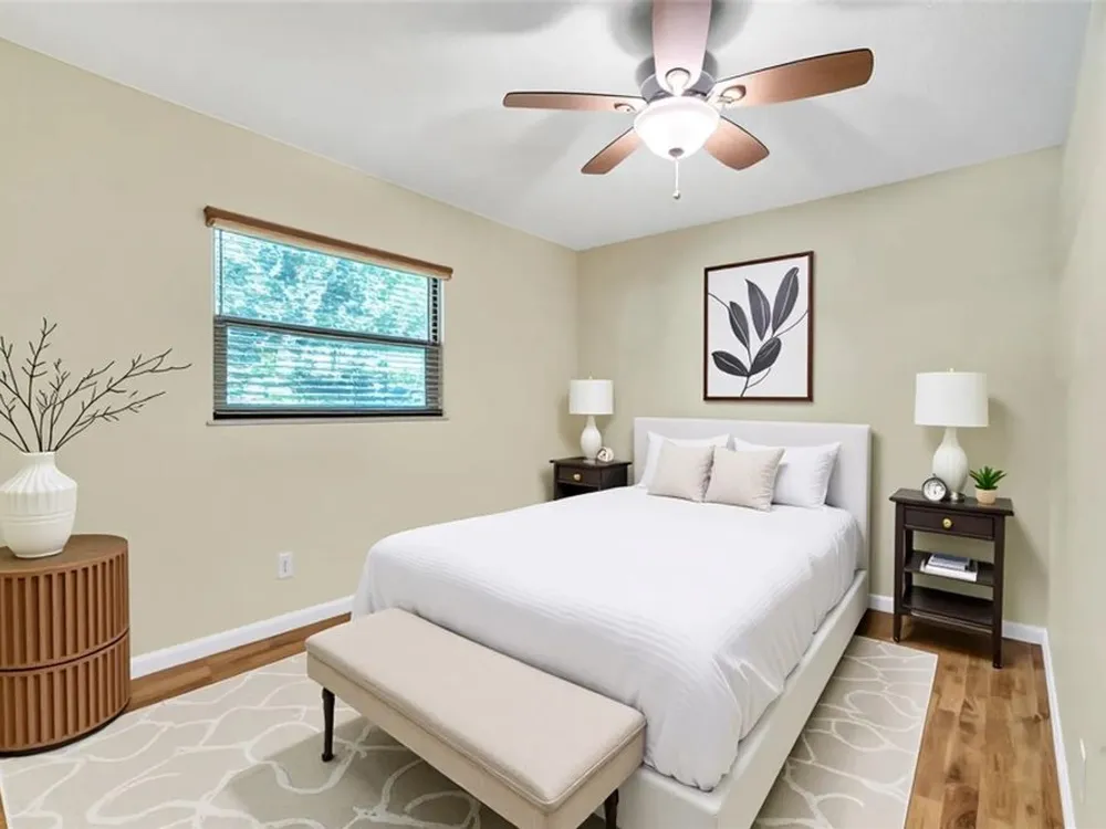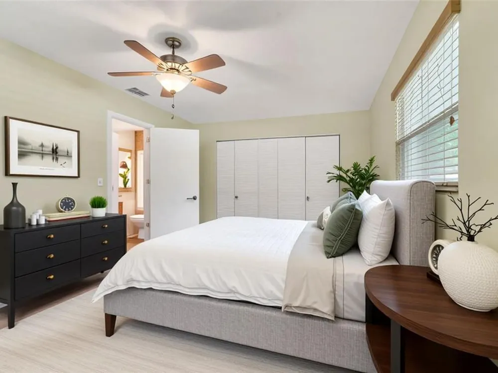 - Ceiling Fan(s), Living/Dining Room, Main Level Primary, Solid Surface Counters, Solid-Wood Cabinets, Split Bedrooms, Stone Counters, Thermostat, Walk-In Closet(s), Window Treatments