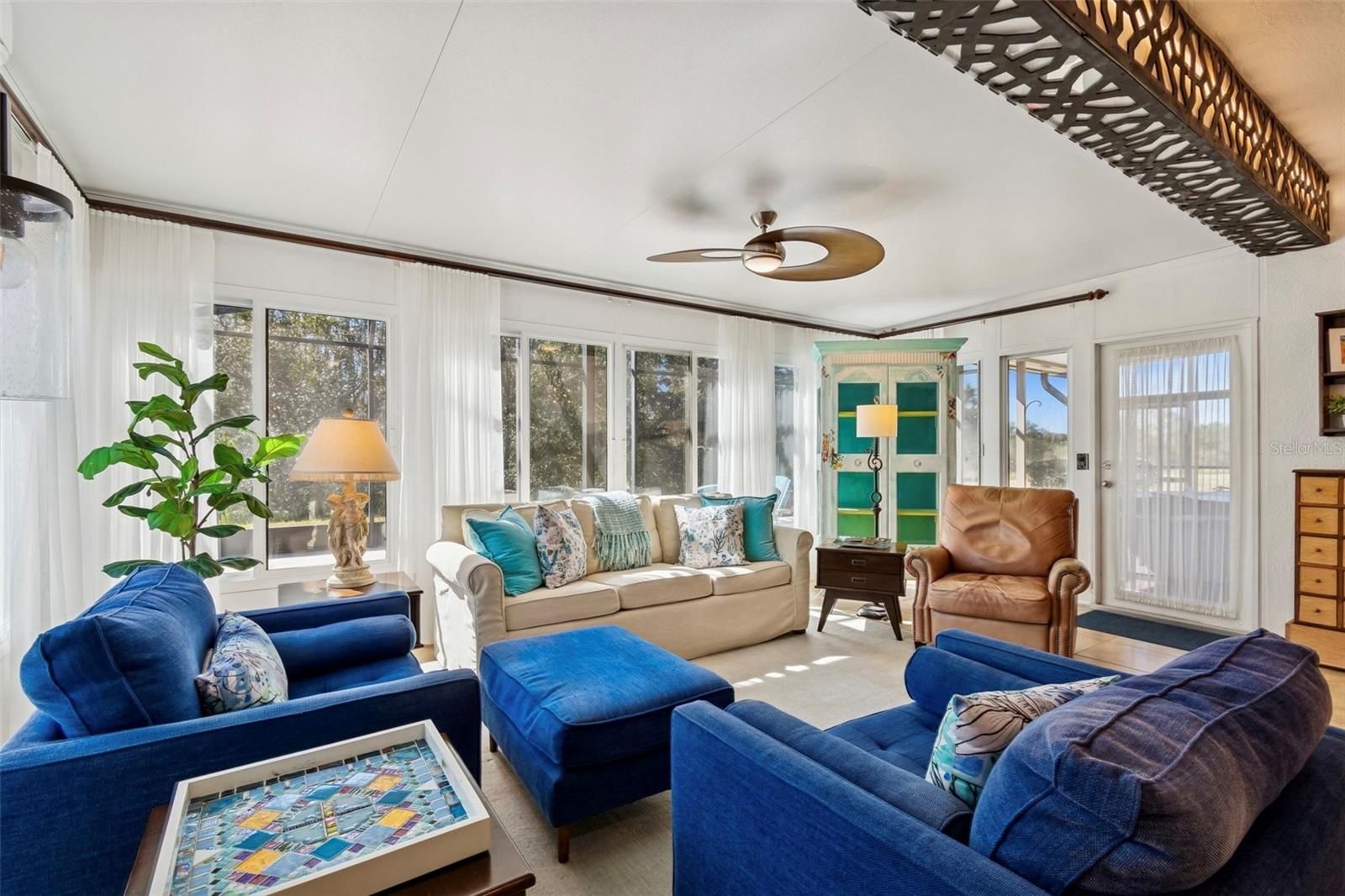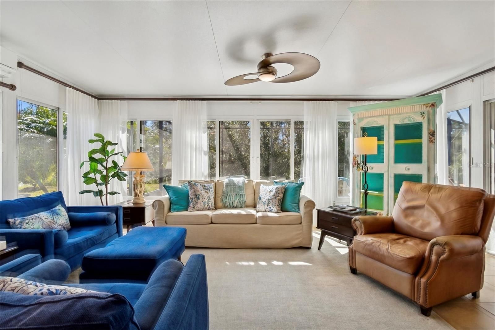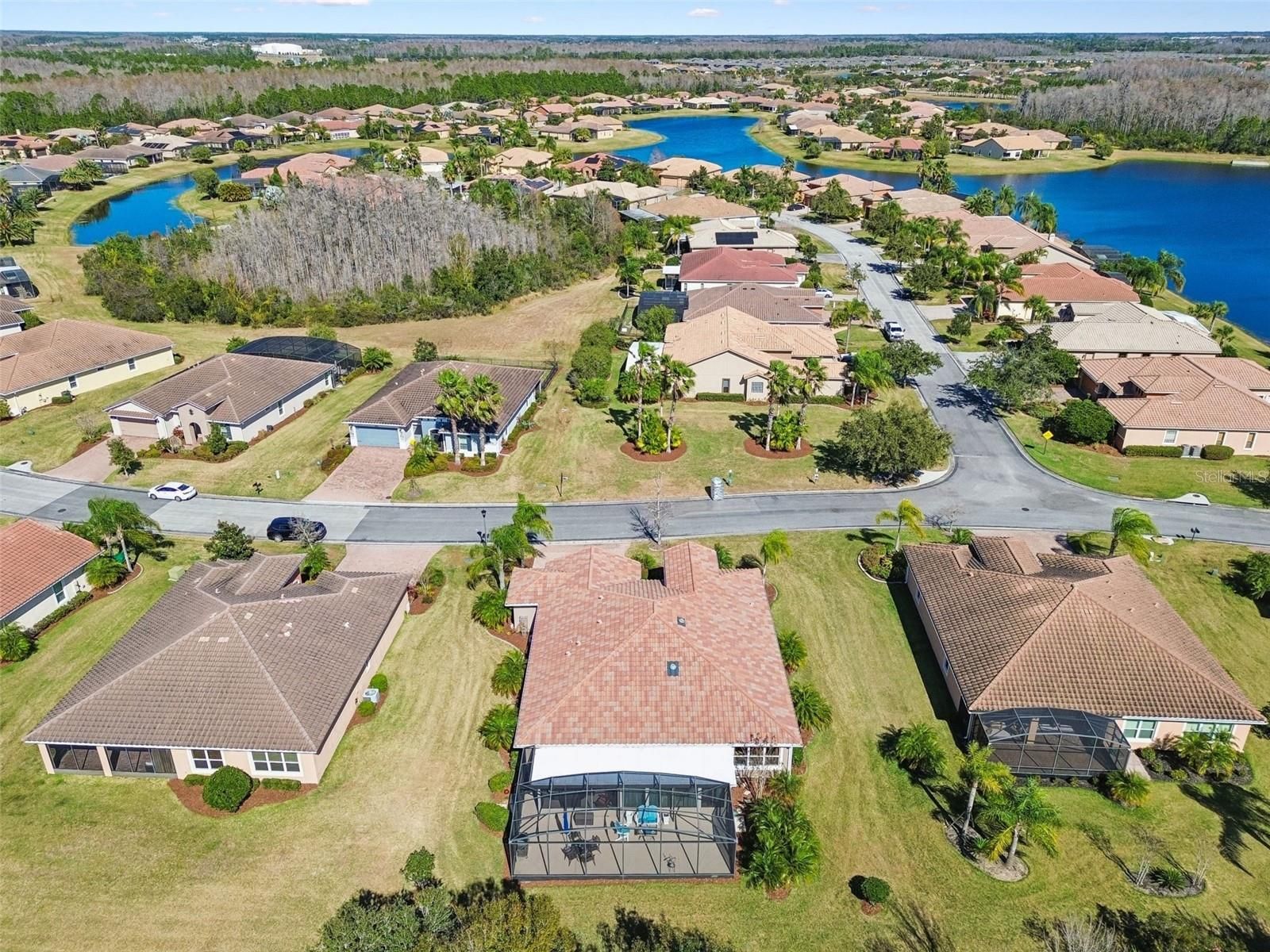 One or more photo(s) has been virtually staged. Stunning 4-bedroom, 3-bath Sorano model set on a private, LUSH conservation lot in Portofino Estates, complete with a designated GOLF CART GARAGE. This exceptional home features an OPEN FLOOR PLAN designed for both comfort and entertaining, including a cozy FOUR-SEASON SUNROOM with CERAMIC TILE floors, a separate covered and screened area WITH A HOT TUB, and a large SCREENED, EXTENDED lanai—perfect for enjoying Florida living year-round. Step through the elegant LEADED GLASS front door into an open foyer that opens to a spacious living room featuring soaring 12-foot ceilings, CERAMIC TILE flooring, and TWO SOLAR TUBES that flood the space with natural light. The living room opens directly to the gourmet kitchen, which boasts 42-inch cabinetry, QUARTZ countertops, STONE BACKSPLASH, a breakfast island, a large pantry, and stainless steel appliances—including TWO wine refrigerators. The adjacent SUN-FILLED dinette offers peaceful conservation views and is ideal for casual meals or afternoon card games. The glass-enclosed sunroom is a true showstopper, featuring a comfortable seating area and a designated bar space—perfect for entertaining and gatherings. This space is CLIMATE-CONTROLLED with its own MINI-SPLIT system, while a decorative LIGHTED BEAM and upgraded lighting add warmth and ambiance, making it truly the perfect space!! The spacious PRIMARY SUITE features a TRAY ceiling that adds both charm and elegance. The attached ENSUITE BATH offers a large TILED WALK-IN shower with BENCH seating, raised vanities with DUAL SINKS, a linen closet, and a private commode. The generous WAK-IN CLOSET includes custom built-ins and provides convenient ACCESS to the laundry room through a separate door. The laundry room is well-appointed with a UTILITY SINK, storage cabinetry, and a WASHER and DRYER that are included in the sale. An office/den with DOUBLE-DOOR entry is located at the front of the home and overlooks the front yard, where you can enjoy the soothing sound of a trickling fountain just outside the window. This versatile space may also be used as an additional bedroom or craft room. The three additional bedrooms feature durable VINYL PLANK FLOORING and are located near full baths, offering comfort and privacy for family members or guests. Additional upgrades include a WHOLE HOUSE WATER SOFTENER, HVAC replaced in 2023, 8 foot doors, ROUNDED CORNERS, screened-in front porch, and the EXTERIOR was painted in 2022. Schedule your private viewing of this fantastic home in an award-winning 55+ community featuring resort-style pools, a fitness center, pickleball and tennis courts, over 200 clubs and so much more! The HOA: - maintains the LANDSCAPING & IRRIGATION systems in the common areas as well as at individual homesites - maintains the roads throughout the community - PROVIDES SECURITY with gate guards and mobile patrols including the Polk County Sheriff - allows AUTOMATED GATE ACCESS for residents via license plate readers - provides residents with Fiber Optic Internet & TV service.***Poinciana Lakes Plaza is a MAJOR NEW SHOPPING CENTER directly across from the Solivita Main Gate. It features Sprouts Grocery, TJ MAXX, Ross, Burlington, Rack Room Shoes, 5 Below, Ulta, Outback, First Watch, 5 Guys, Panda Express, Bojangles, Jersey Mike's Subs, 5 Guys, Papa John's Pizza, Burrito Bar, Cold Stone Creamery, Urgent Care, Dentist, Hand & Stone Massage, America's Best Eyeglasses, Crunch Fitness, Hair Cuttery, Petco, TD Bank, PLUS MORE TO COME.***