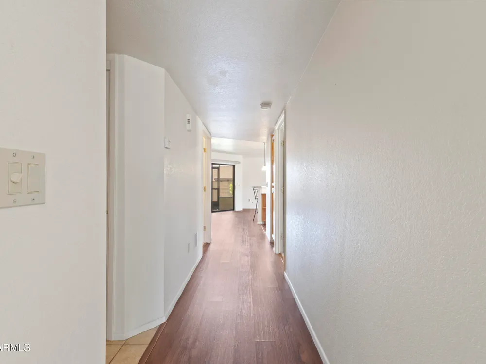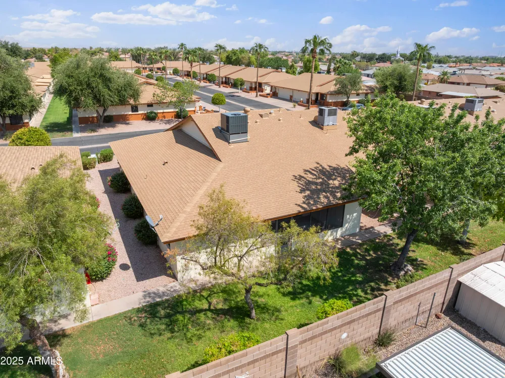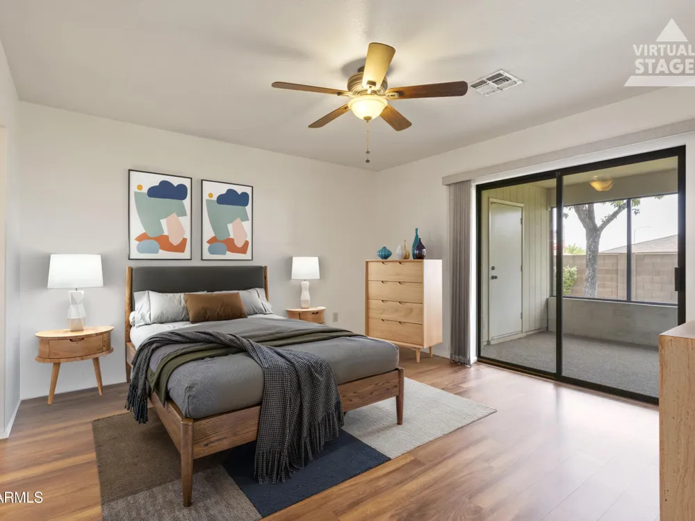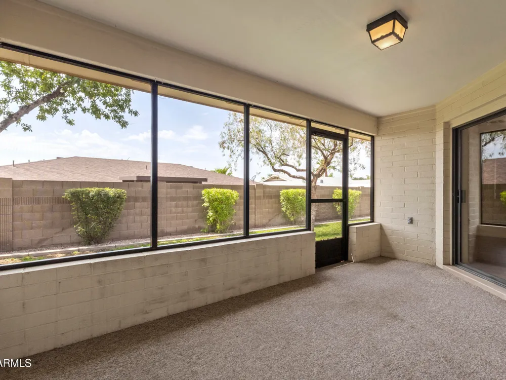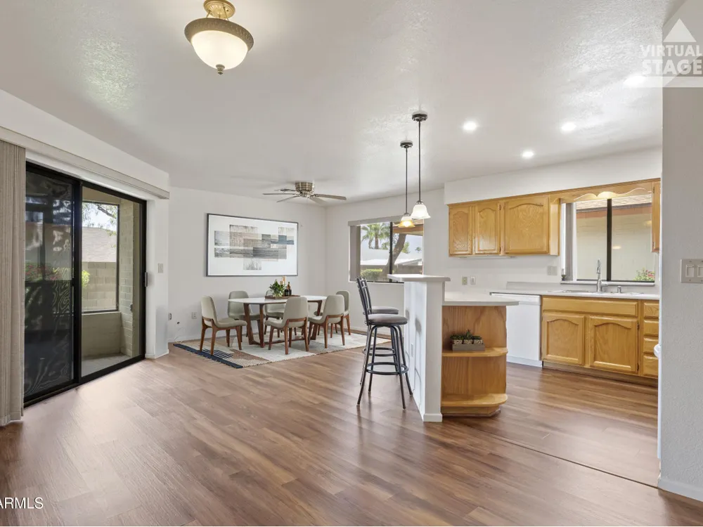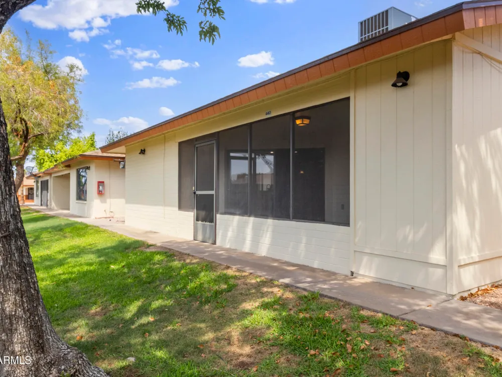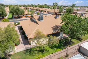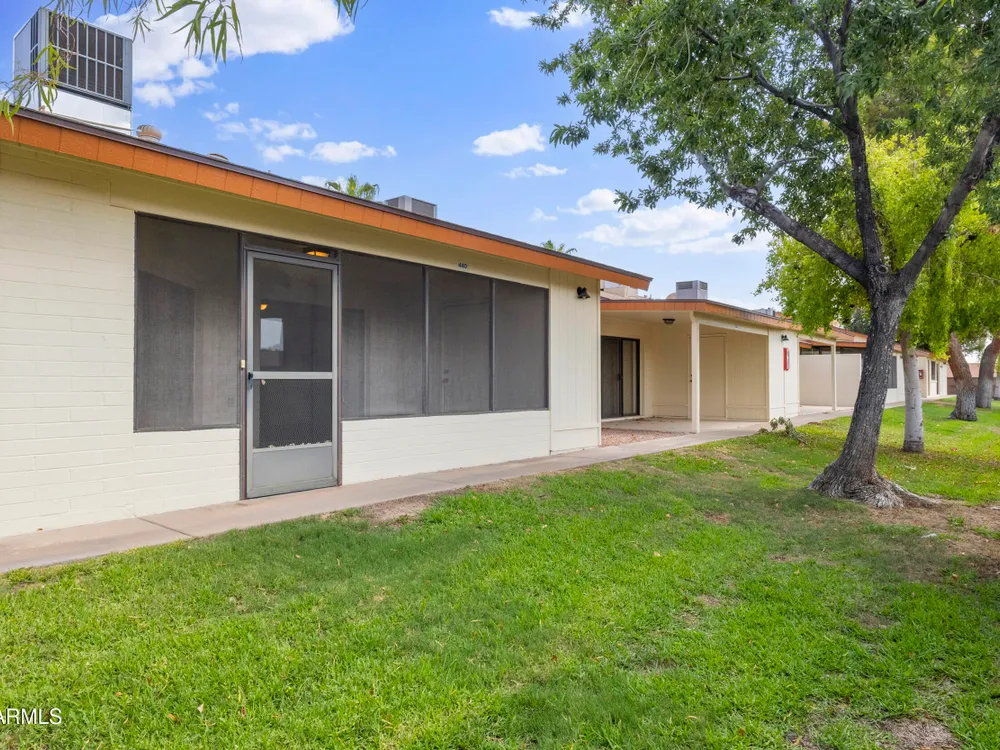This charming corner unit home in the Sunland Village East Golf Community offers 2 bedrooms, 2 baths, a 2-car garage with 1,376 sqft + 145 sqft Arizona room. The NEW HVAC was installed in Feb 2025. Inside, you'll find wood-like flooring with tile in the bathrooms and laundry room, plus oak cabinets in the kitchen, bathrooms, and laundry room for a warm, classic touch. The enclosed patio provides privacy and a relaxing space with peaceful greenbelt views. Unlike most patio homes in the community, you do not face a neighboring home when enjoying your back patio space. With access to top-notch amenities including pools, fitness facilities, pickleball courts, tennis courts, hobby rooms, and countless clubs there is something for everyone.