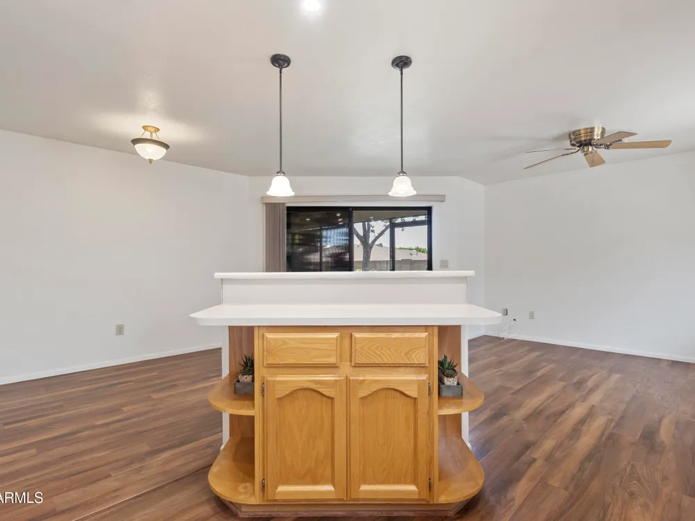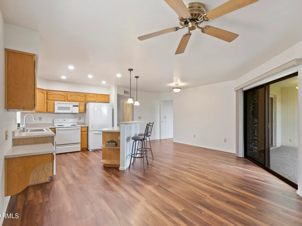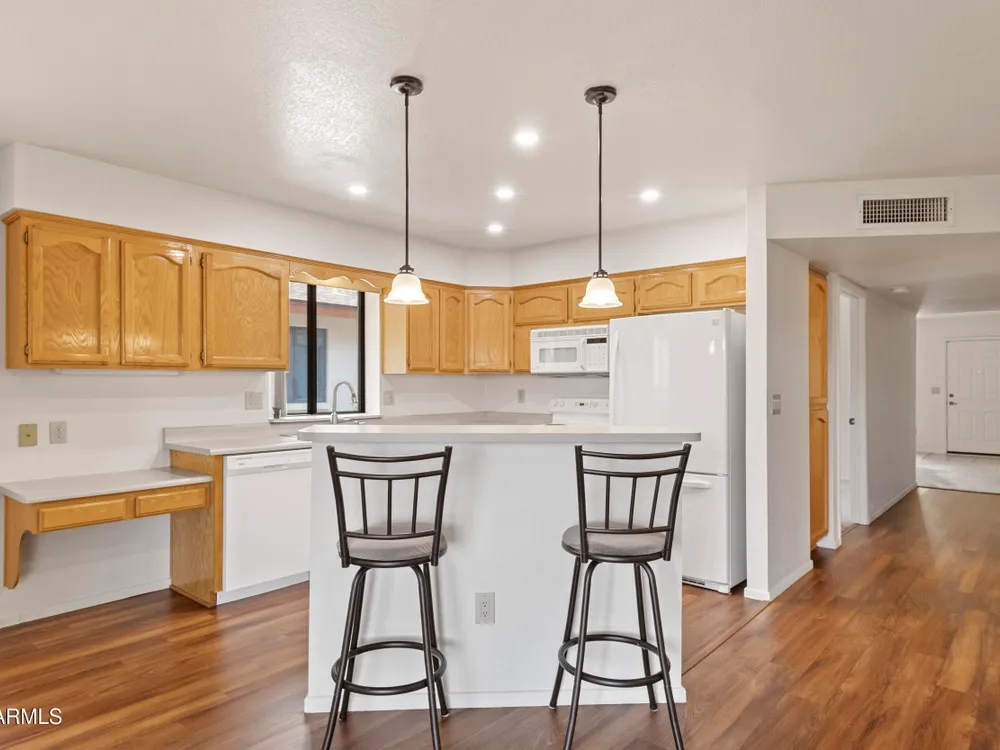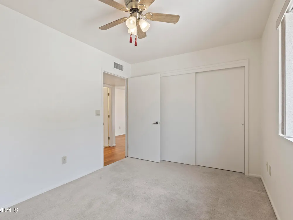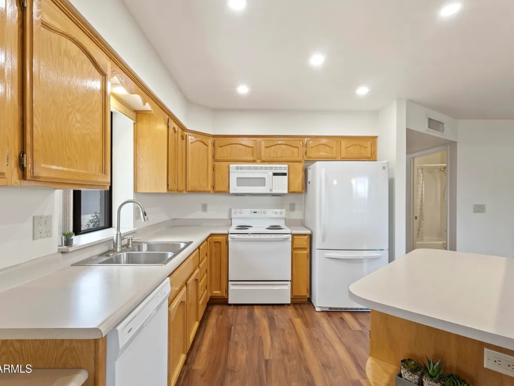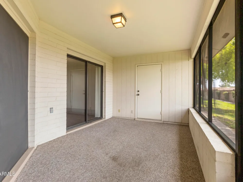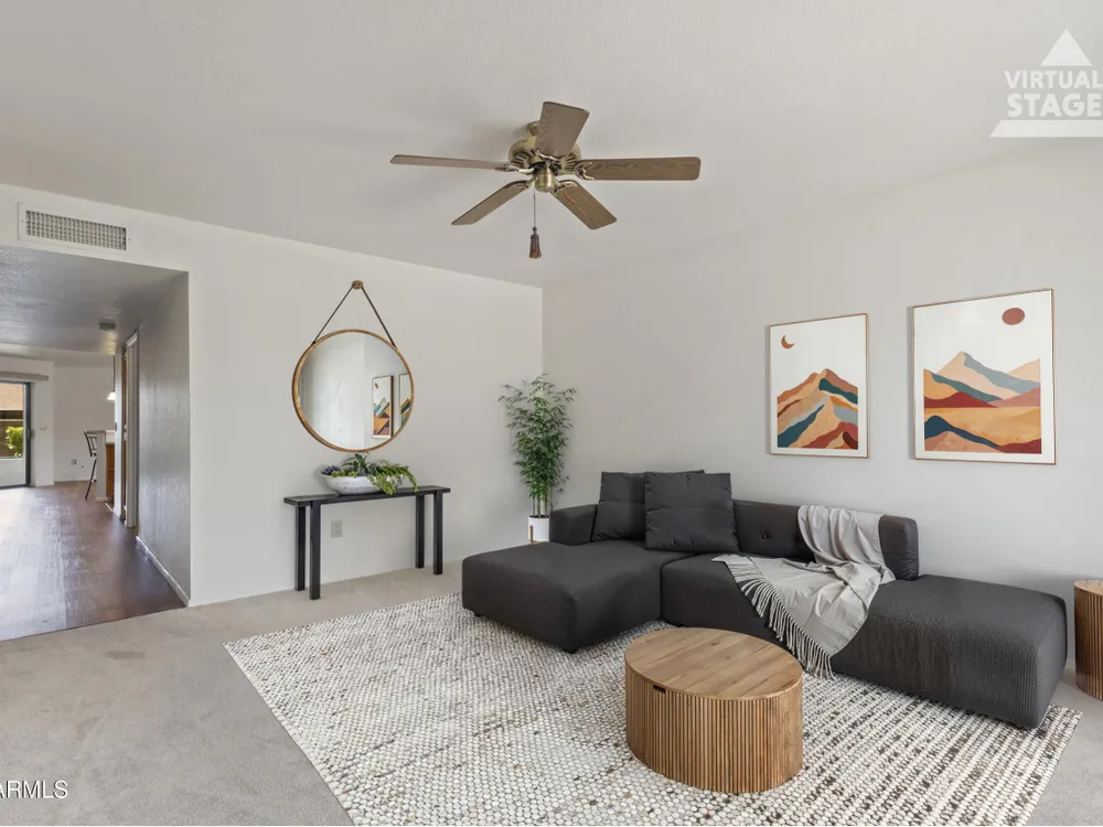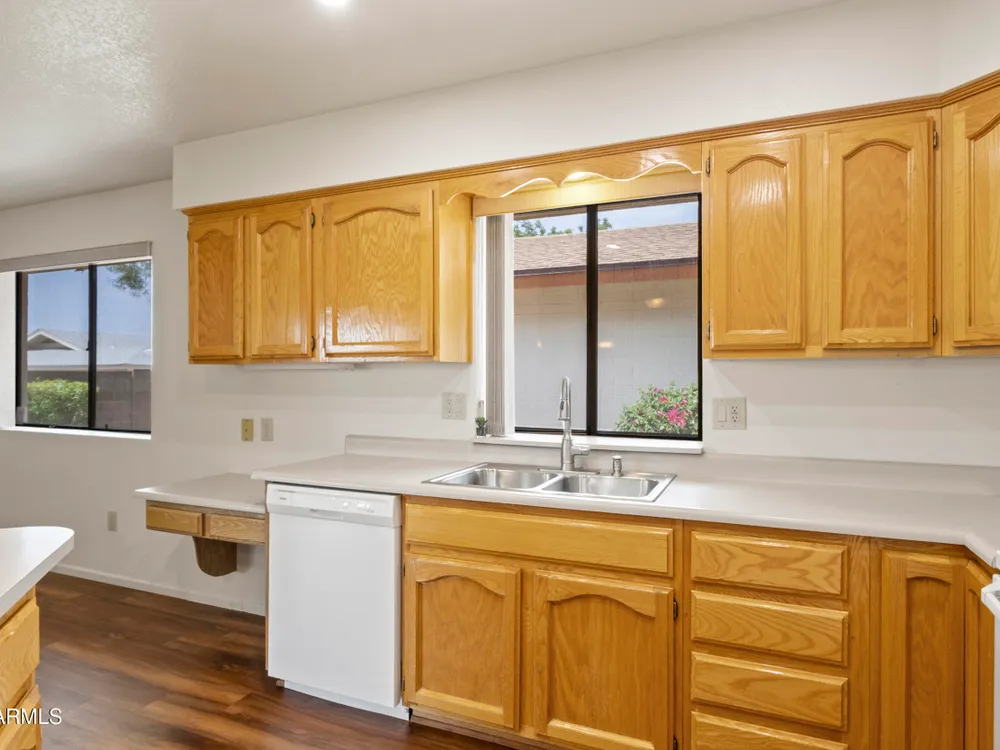 This charming corner unit home in the Sunland Village East Golf Community offers 2 bedrooms, 2 baths, a 2-car garage with 1,376 sqft + 145 sqft Arizona room. The NEW HVAC was installed in Feb 2025. Inside, you'll find wood-like flooring with tile in the bathrooms and laundry room, plus oak cabinets in the kitchen, bathrooms, and laundry room for a warm, classic touch. The enclosed patio provides privacy and a relaxing space with peaceful greenbelt views. Unlike most patio homes in the community, you do not face a neighboring home when enjoying your back patio space. With access to top-notch amenities including pools, fitness facilities, pickleball courts, tennis courts, hobby rooms, and countless clubs there is something for everyone.
