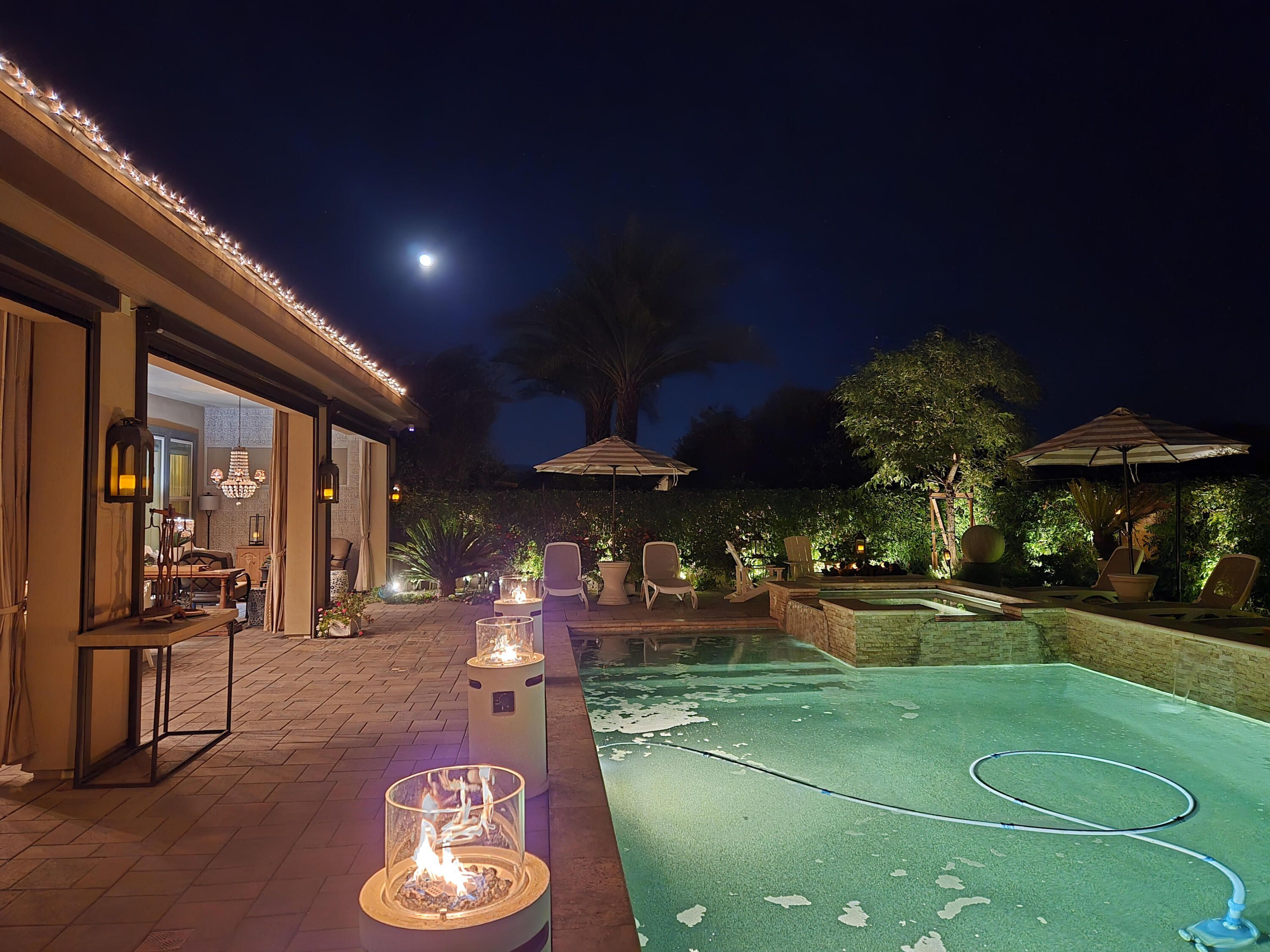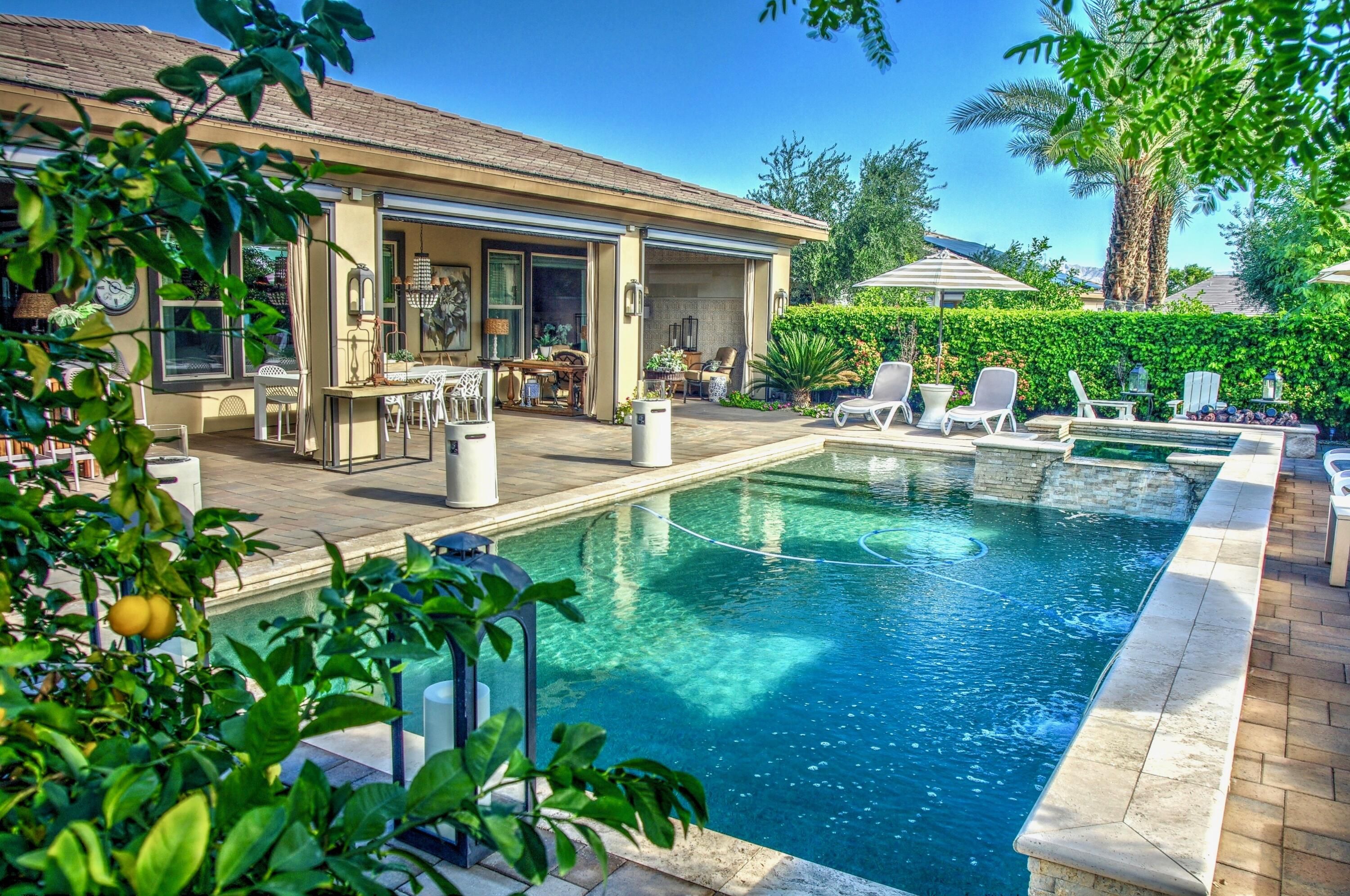 A one-of-a-kind designer dream home with custom detail throughout the home! This home is in the ''all ages'' section of the community that's a short distance from the clubhouse and community amenities. The Celebrare Model has 2451SF with open concept living spaces that includes a chef inspired kitchen with GE Monogram appliances, upgraded cabinets, oversized custom quartz island and butler's pantry adjacent to the kitchen. The dining area features custom cabinetry and 2 wine refrigerators. The lounge area features a contemporary gas fireplace. The office features custom shelving. The side wall in office stores an automatic full-size bed. Bedrooms and bathrooms with custom upgrades. Other enhancements include custom millwork around all doorways and windows, recessed lighting, ceiling fans, and custom window treatments. Patio, rear and side yard through 2 large rolling walls of glass. The backyard amenities feature private pool/spa, firepit, expanded covered patio, outdoor kitchen complete with grill, pizza oven, bar furniture, fireplace and more. Private entry courtyard with firepit, fountains and pergola. The garage includes epoxy floors and mini split AC. Optional club membership transfer fee = $1,875 (vs. $12,500 if not a member). Club amenities include tennis/pickleball courts, fitness center, resort/lap/fitness pools & spa, poker/billiards room & artisan studio. Community also features putting green, bocce ball court, large chess game area, and walking trails.