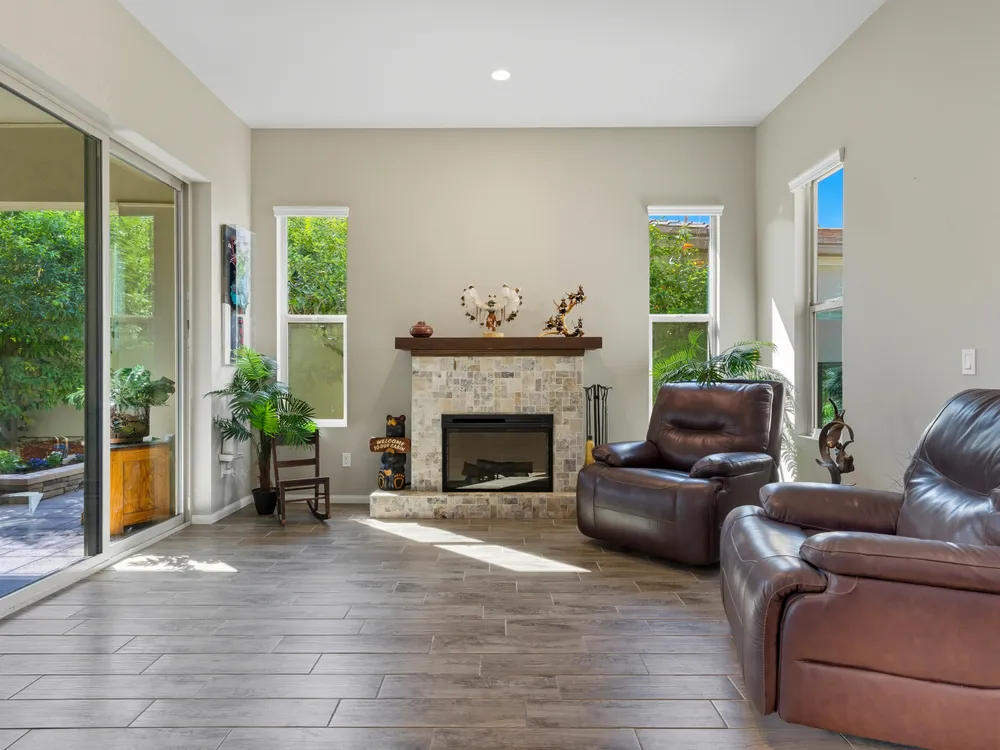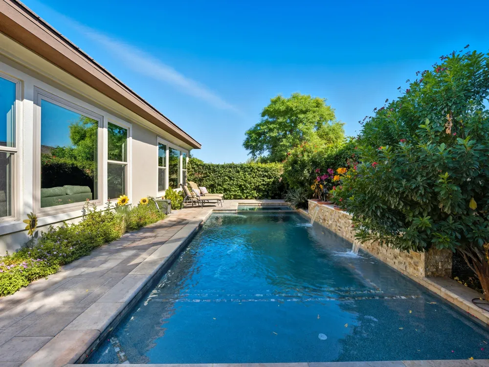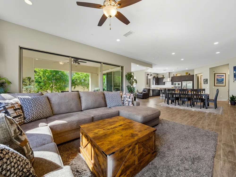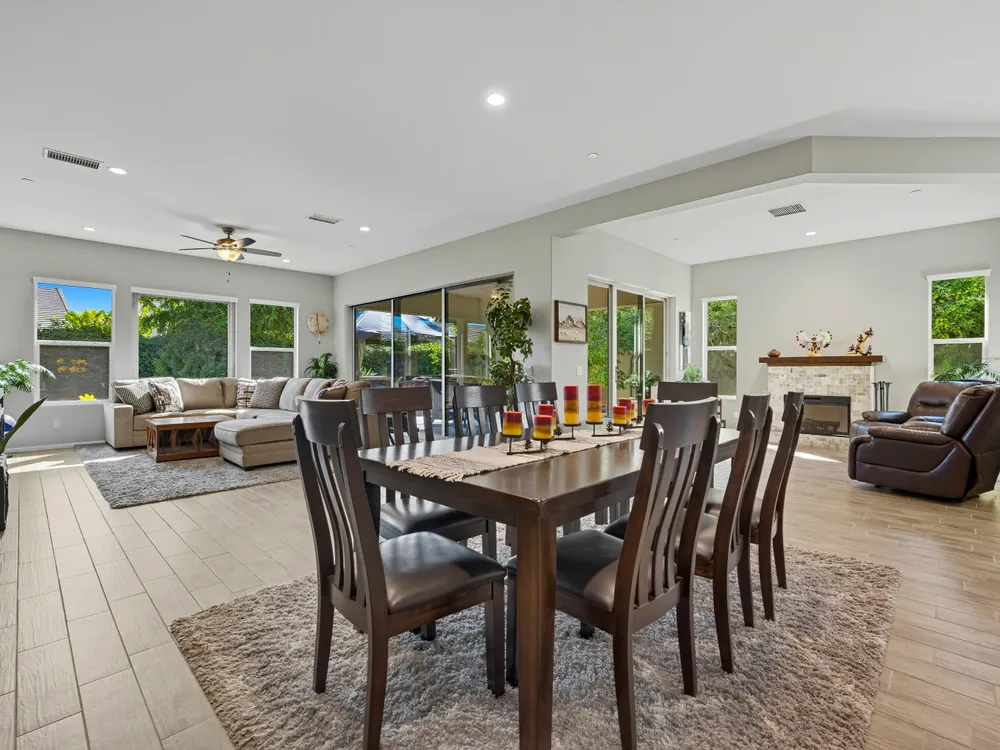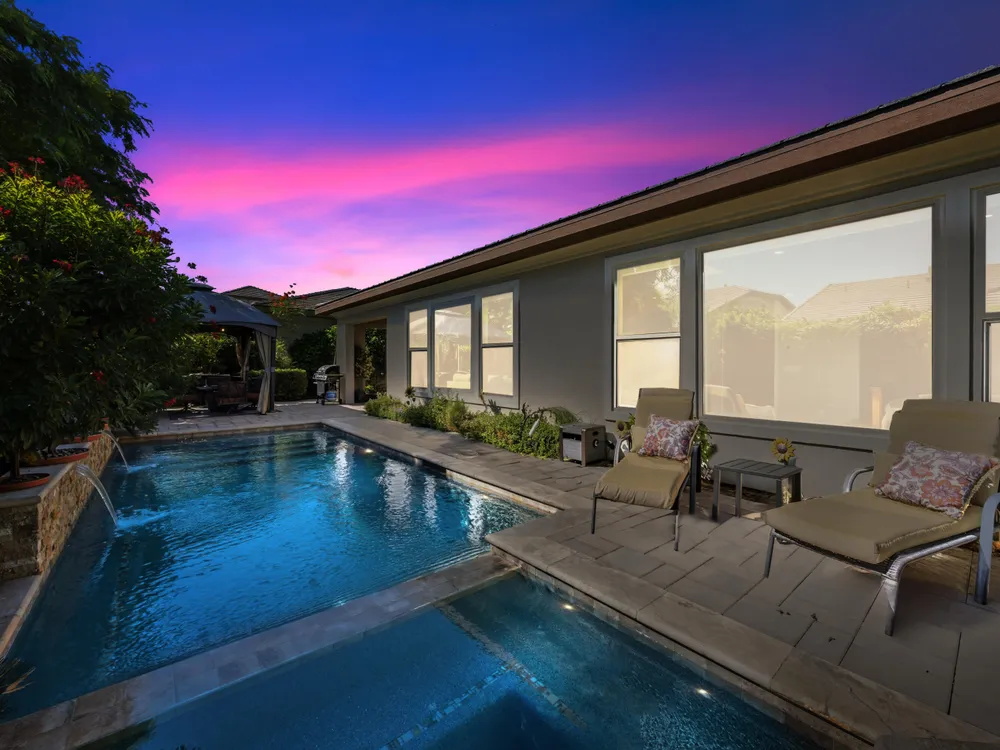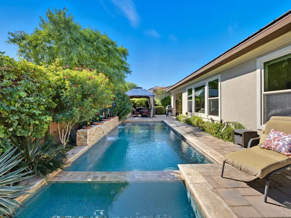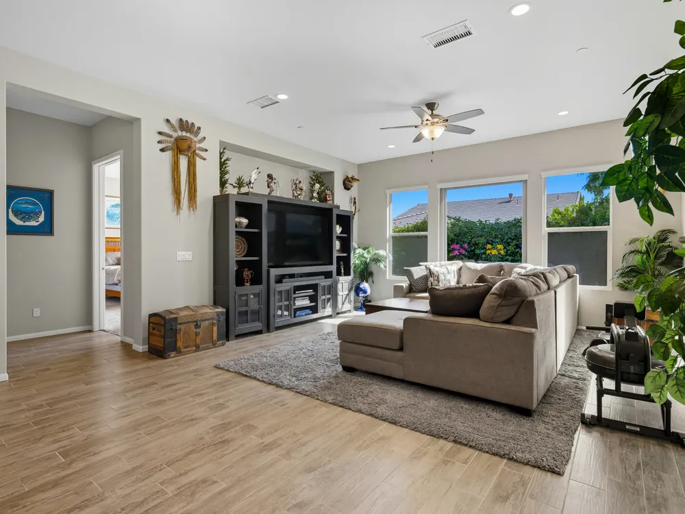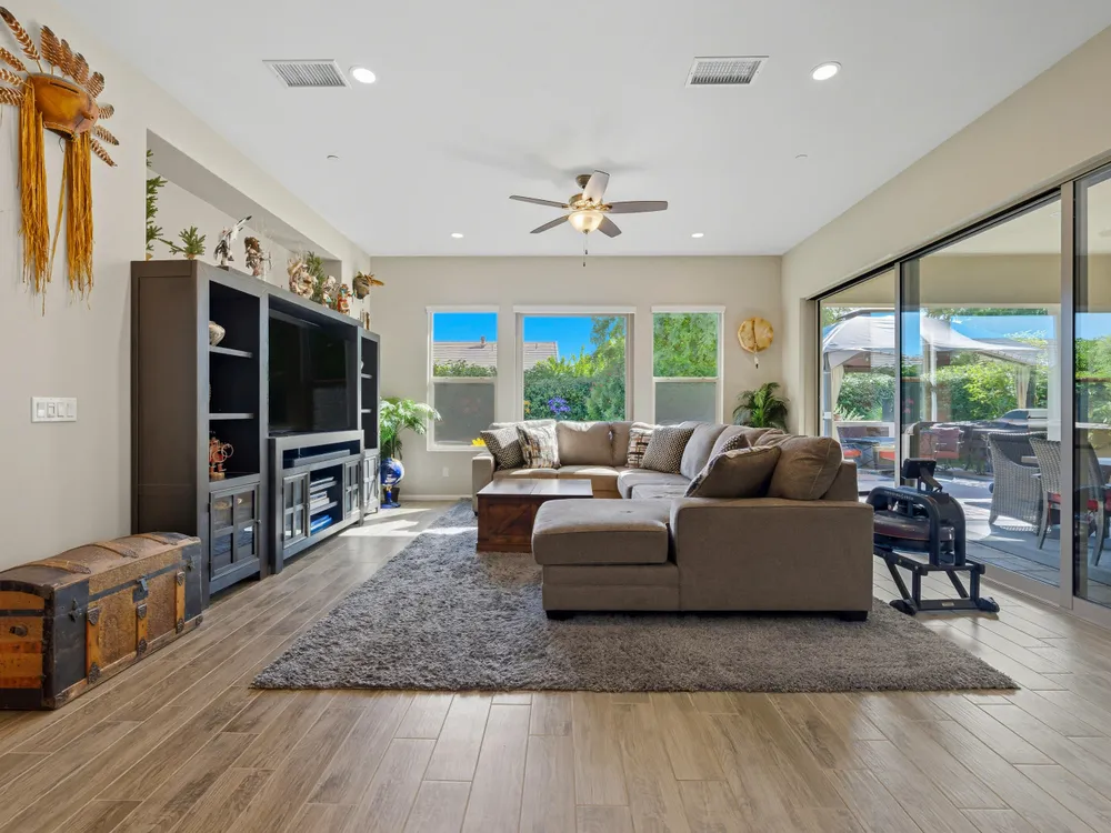 Stunning, Highly Upgraded Home in Polo Club — 82595 Ladder Canyon Dr, Indio, CA 92201 Welcome to this exquisite, move-in ready residence offering exceptional upgrades throughout and a resort-style entertainer's backyard. Built in 2018 and set on a 7,405 sq ft lot, this 2,451 sq ft single-story home delivers luxury, comfort, and striking design. Redfin +1 From a private courtyard entry, step into an open Celebrare floor plan where dramatic sight lines guide you through expansive living spaces. The huge great room features a cozy sitting area with fireplace, perfect for gatherings or relaxing evenings. Wood tile flooring flows through all the common areas, with plush carpet in the bedrooms for warmth underfoot. There is a 15' rolling glass door that connects to the patio offering the best in indoor/outdoor living. The chef's kitchen is a culinary masterpiece, boasting stainless steel appliances, built-in cooktop with vent, quartz countertops, custom backsplash, and designer finishes throughout. Entertain effortlessly while prepping meals — this is kitchen perfection. Retreat to the large master suite, boasting ample space and direct yard access. The upgraded primary bath impresses with a designer shower, large soaking tub, and dual vanities with premium countertops — a true spa experience. Outside, enjoy a south-facing rear yard that bathes the space in natural light. The pool & spa feature a raised waterfall, wrapped by a large covered patio for indoor-outdoor living. Lush landscaping frames the property, creating a private sanctuary atmosphere. Additional highlights include a 3-car garage with electric car charging station, premium upgrades throughout, and thoughtful attention to detail in every room. This property is the perfect balance of sophistication and comfort — your dream home in the heart of Indio awaits. This home is located just down the street from the 25,000 sq ft Polo Club clubhouse. A transferable membership (buyer to pay $1,875 fee) provides access to world-class amenities including a fitness center, tennis, pickleball, resort and lap pools, indoor golf simulator, and the acclaimed June Hill's Table restaurant. All set against the stunning backdrop of the Santa Rosa Mountains.